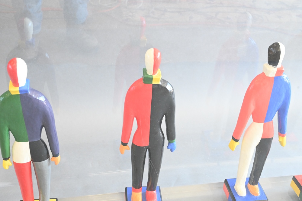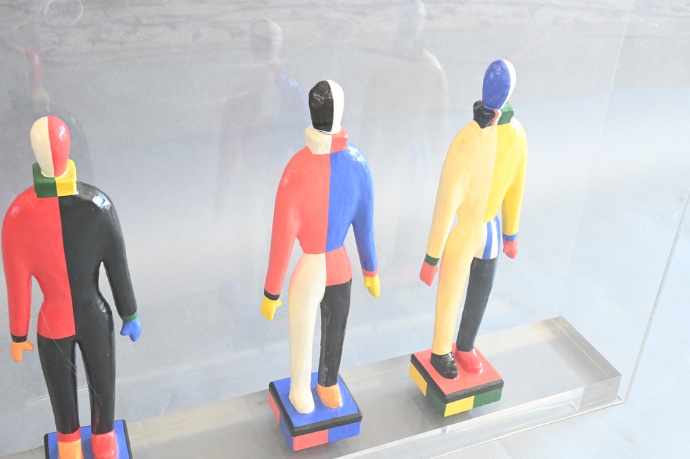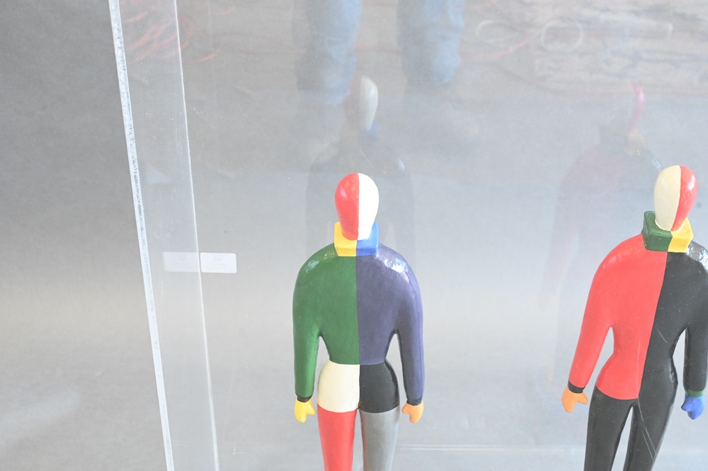 Set of Four Replica Papier Mache Figures of Clowns, each marked on base Guggenheim Museum one circa 1995 and three circa 1996, in large plexiglass case, height of each 19 – 19.5 inches.
