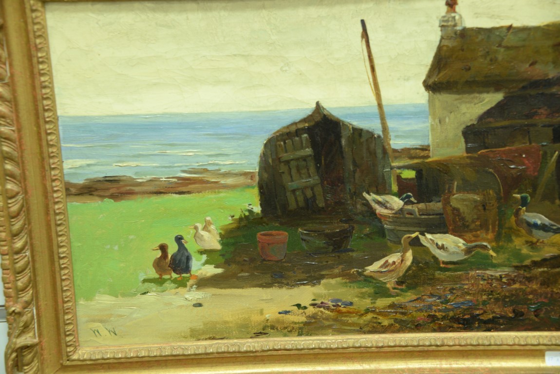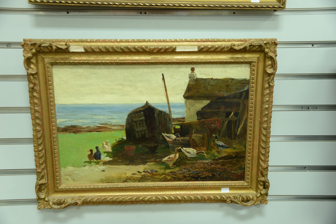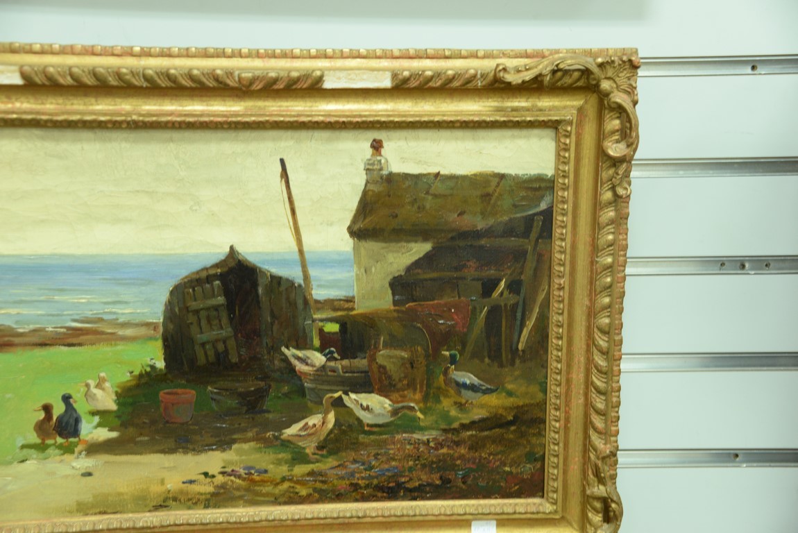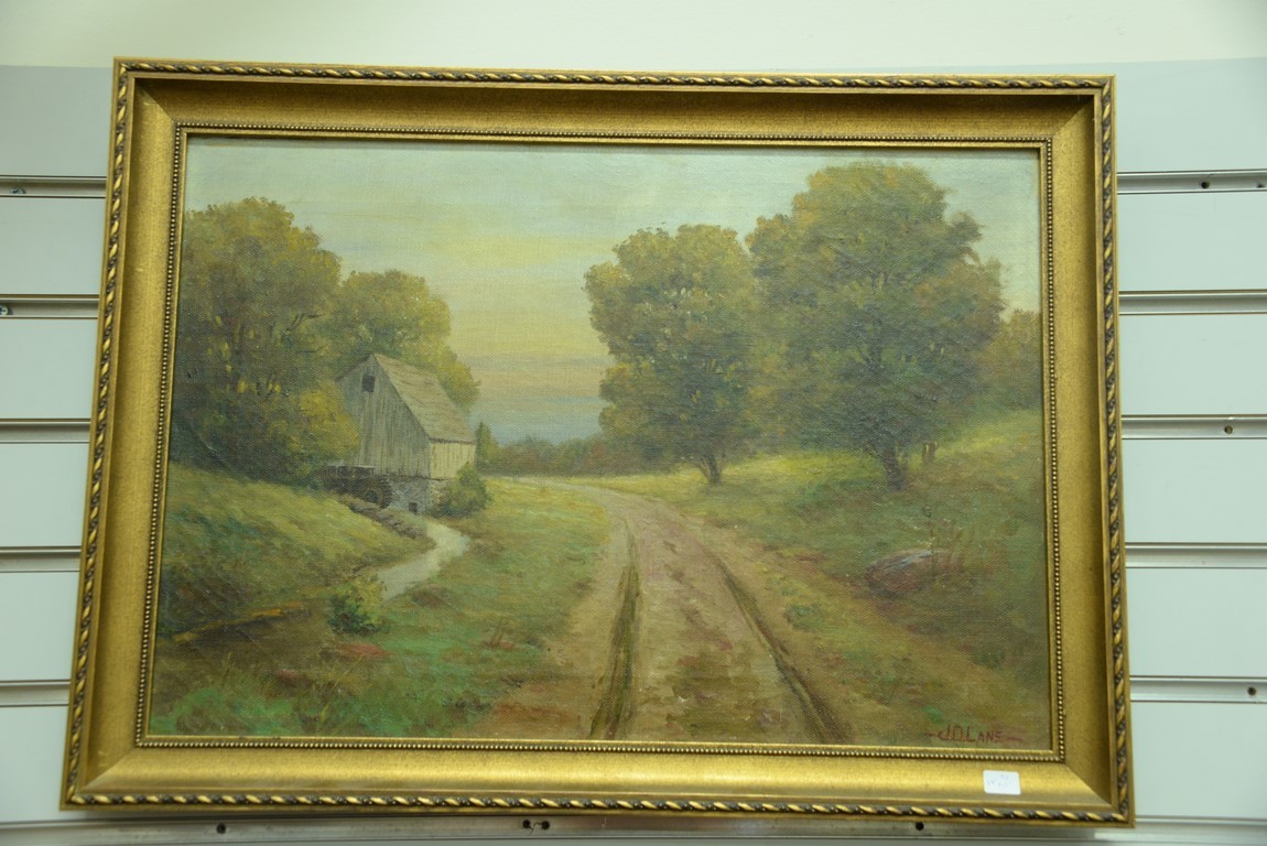 Lot 48: Three framed paintings to include oil on canvas, Barn with Ducks Along Water, initialed W.W. JD. Lane, oil on canvas, Country Farm …
