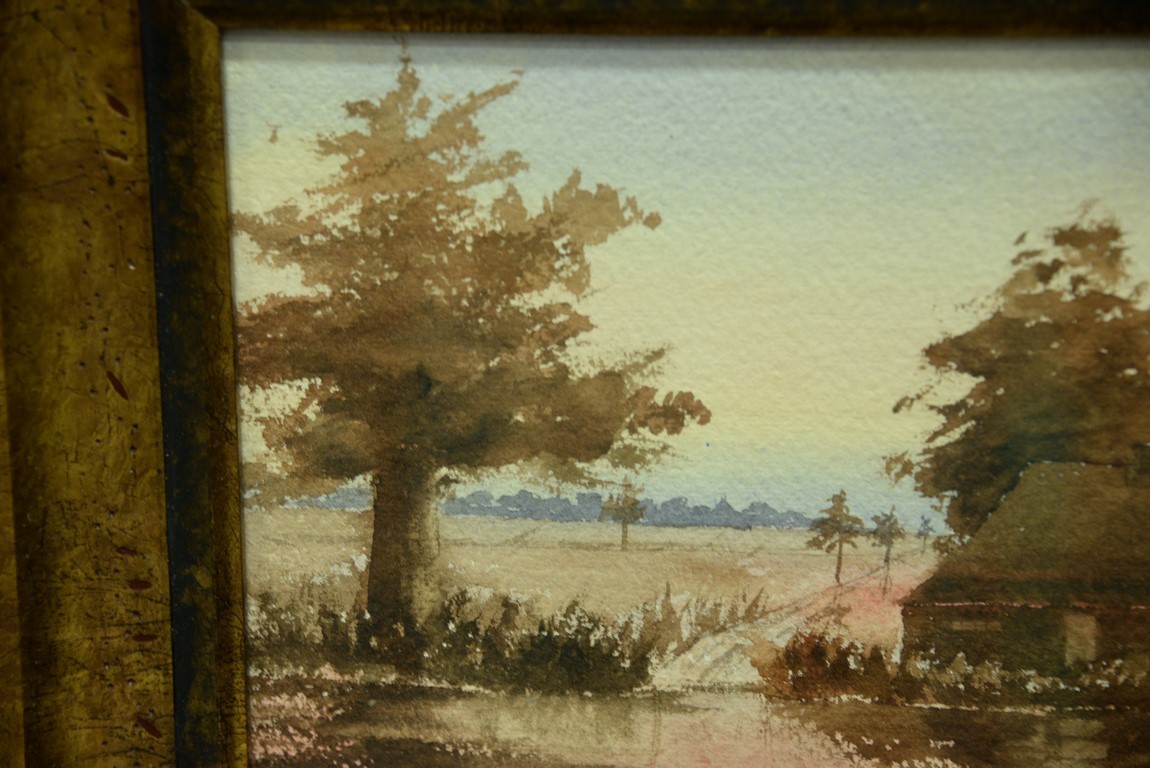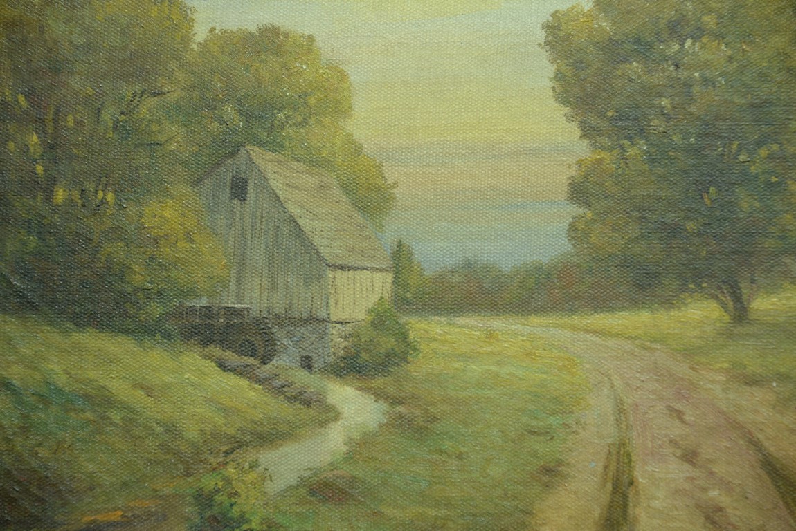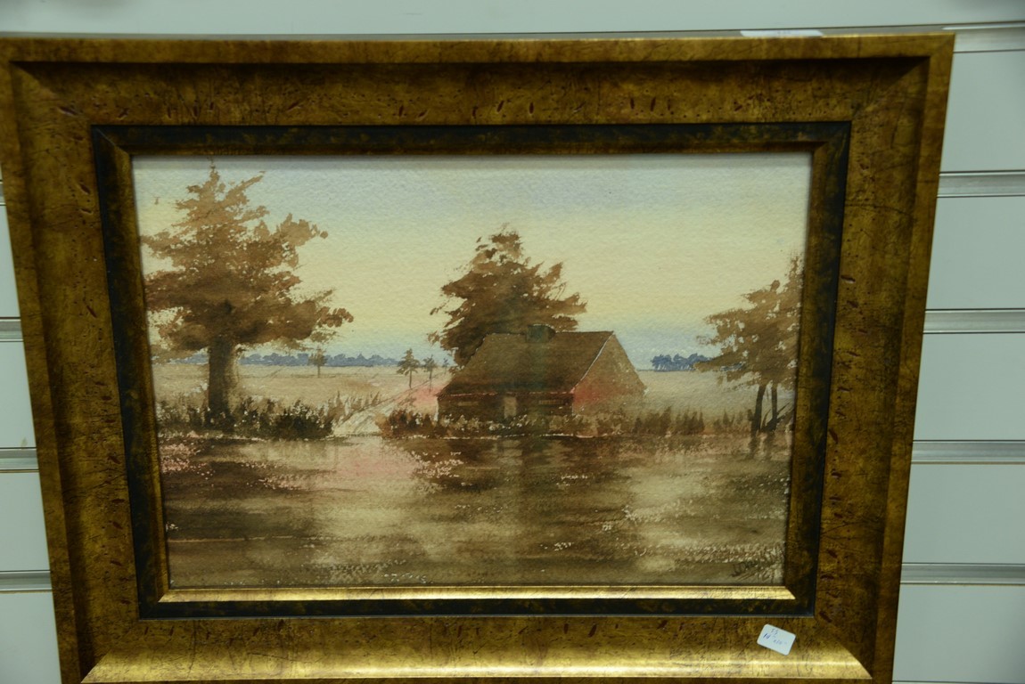 Three framed paintings to include oil on canvas, Barn with Ducks Along Water, initialed W.W. JD. Lane, oil on canvas, Country Farm Road, signed lower right, 19 x 13 and watercolor, Landscape with Barn, signed lower right illegibly, 11 x 15