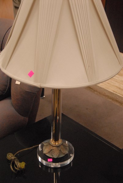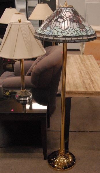 Three lamps to include a floor lamp, a leaded floor lamp, and one table lamp.