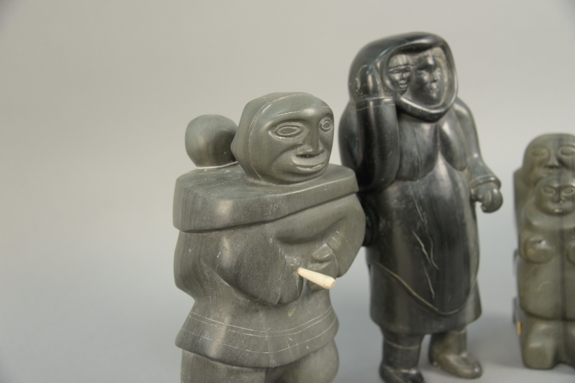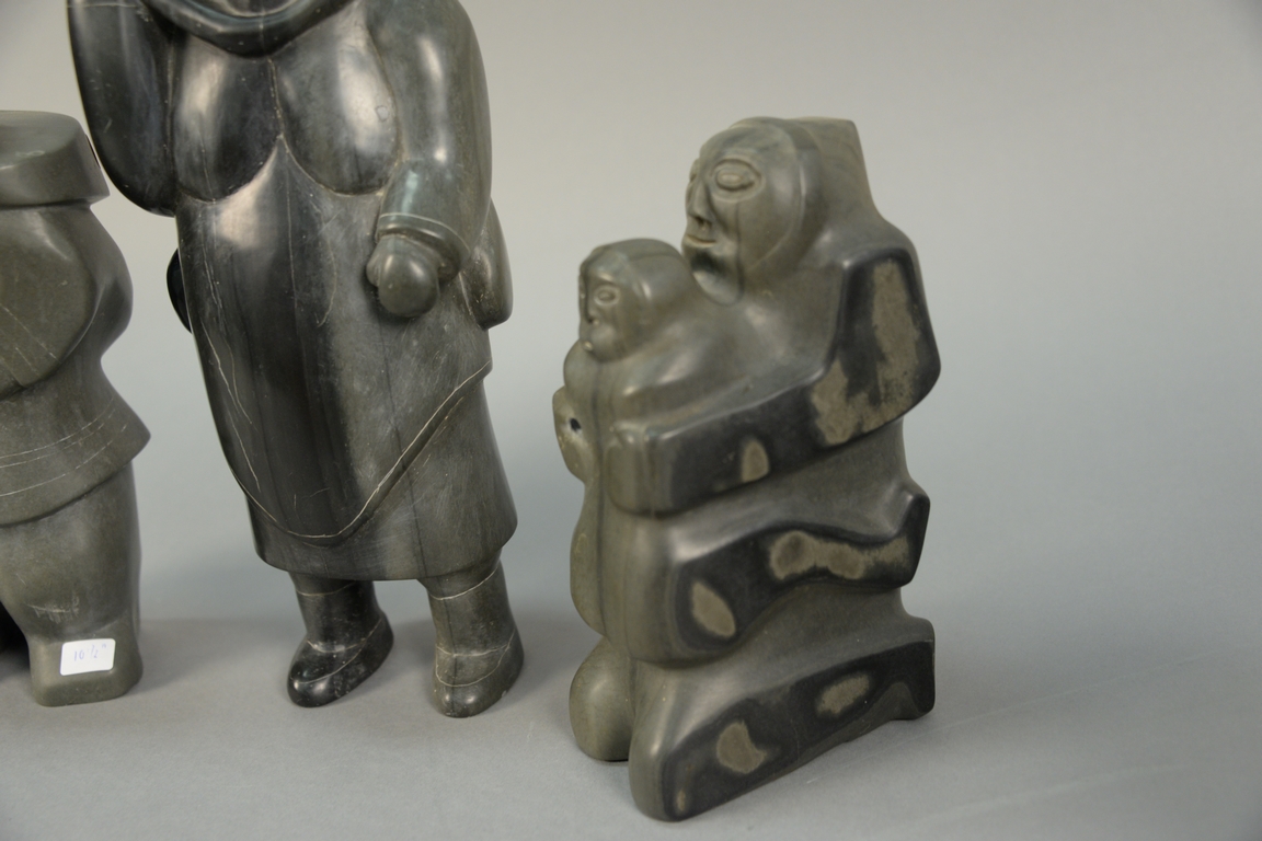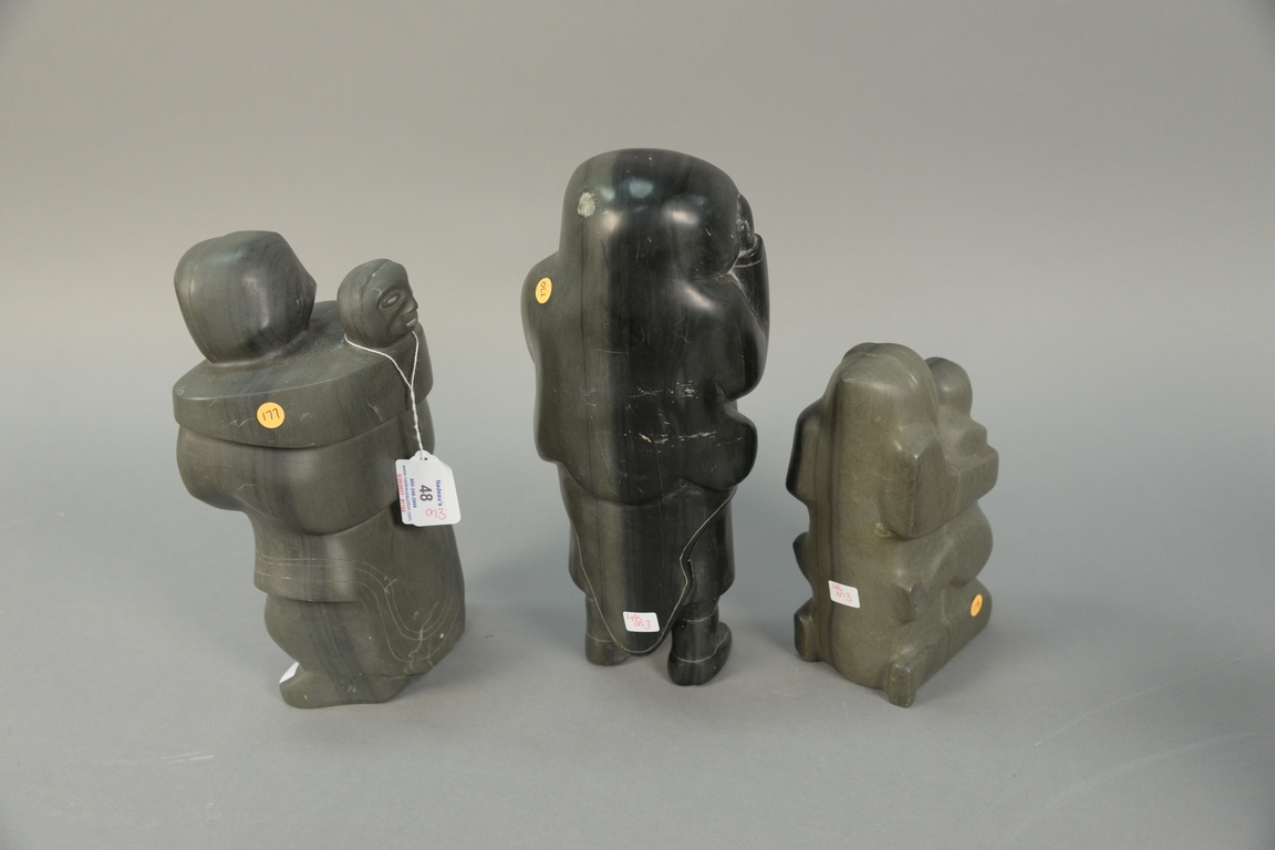 Lot 48: Three large Inuit Eskimo carvings to include Gina Sala Kuujjuaraapik dark green serpentine Woman/Child 11 1/2, unknown artist Kuu…