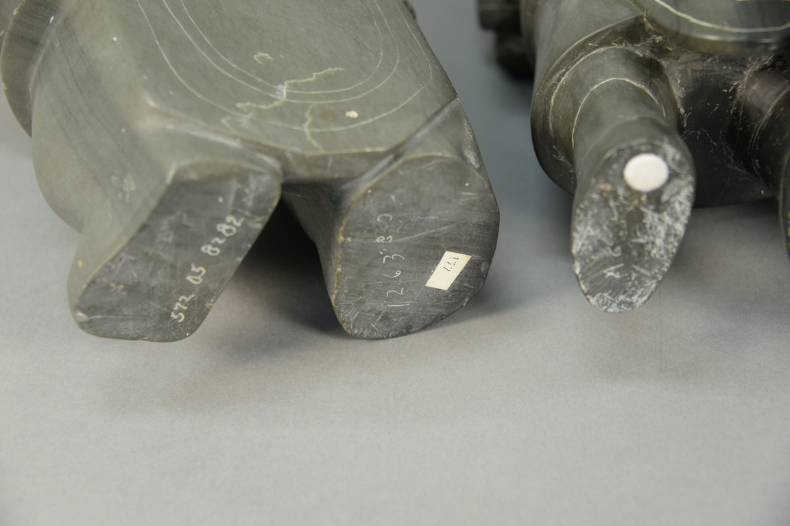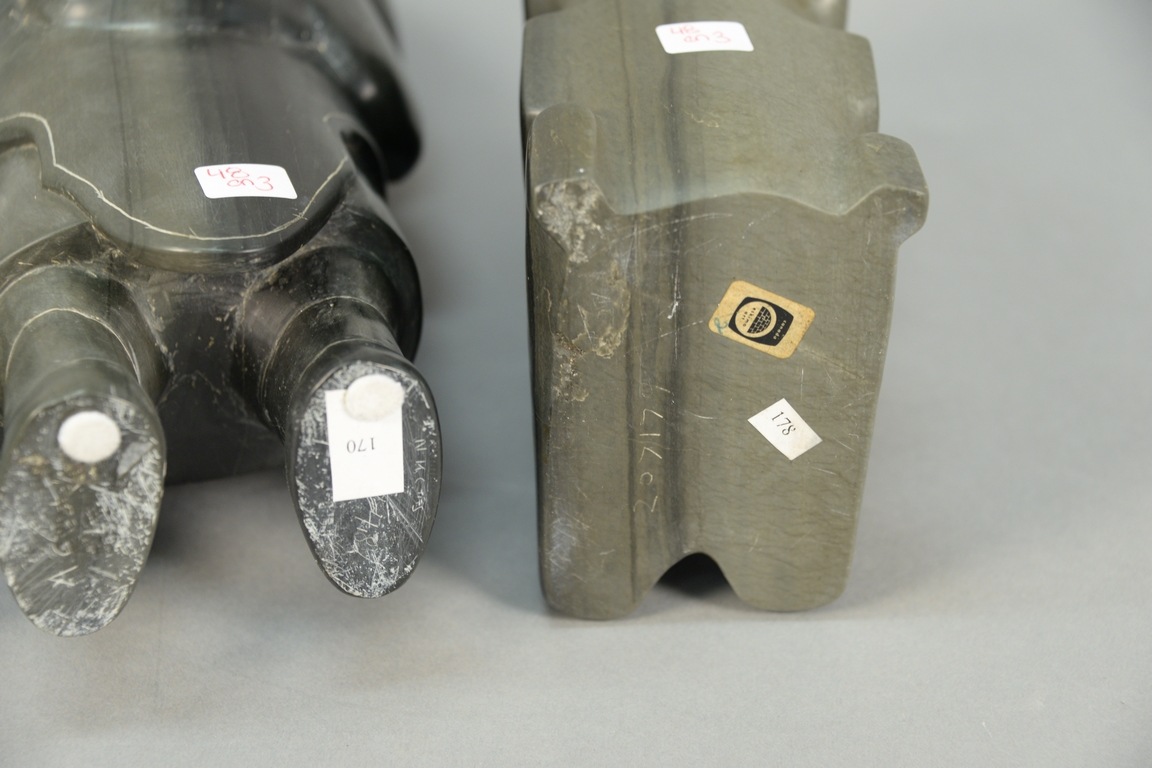 Three large Inuit Eskimo carvings to include Gina Sala Kuujjuaraapik dark green serpentine Woman/Child 11 1/2, unknown artist Kuujjuarapik dark green soapstone Standing Mother/Child Provenance: Waddington’s Auction 2000, 12, and Gina Sala Kuujjuaraapik Great Whale River dark green serpentine Father/Son in Danger 8.