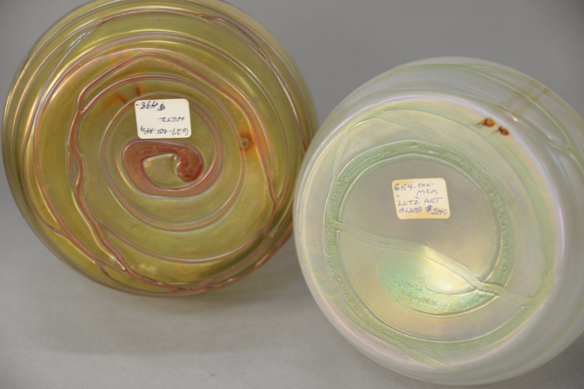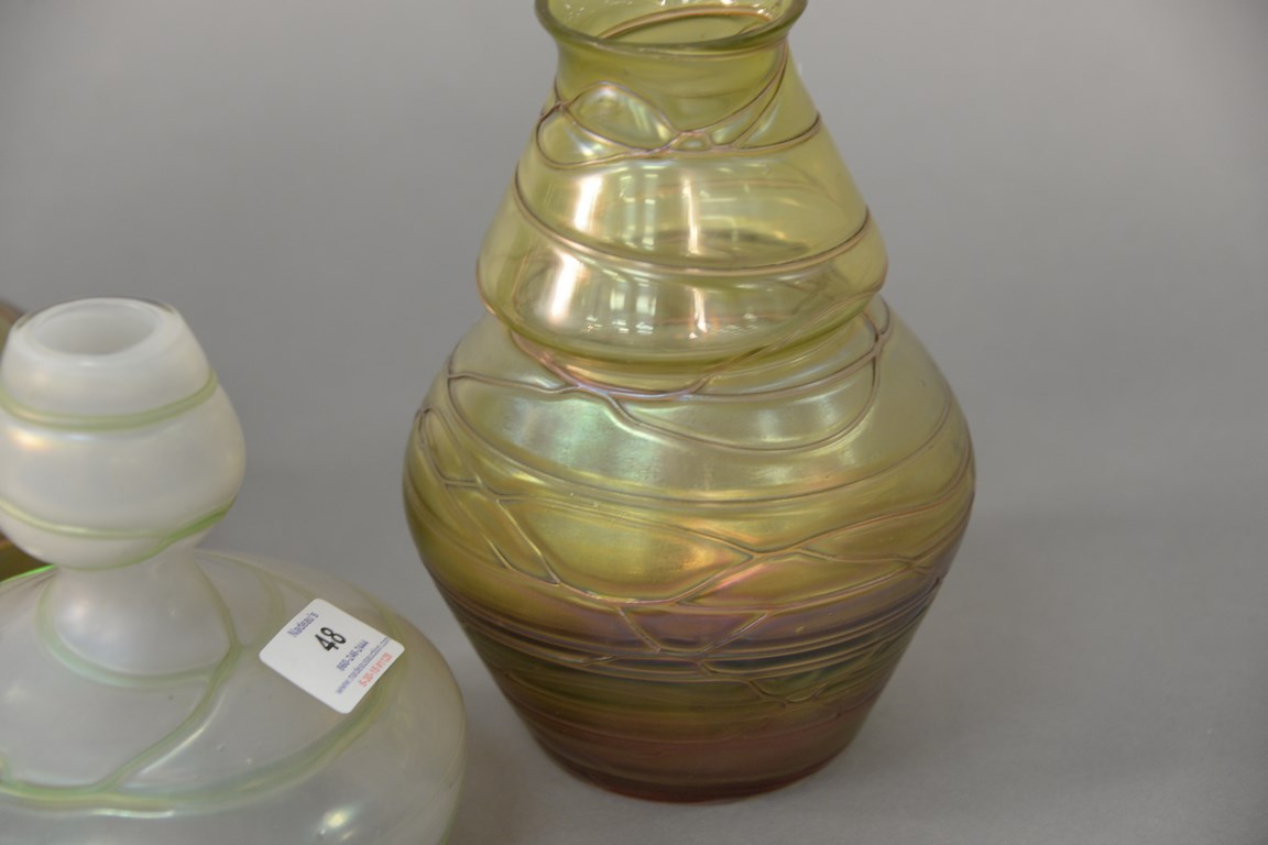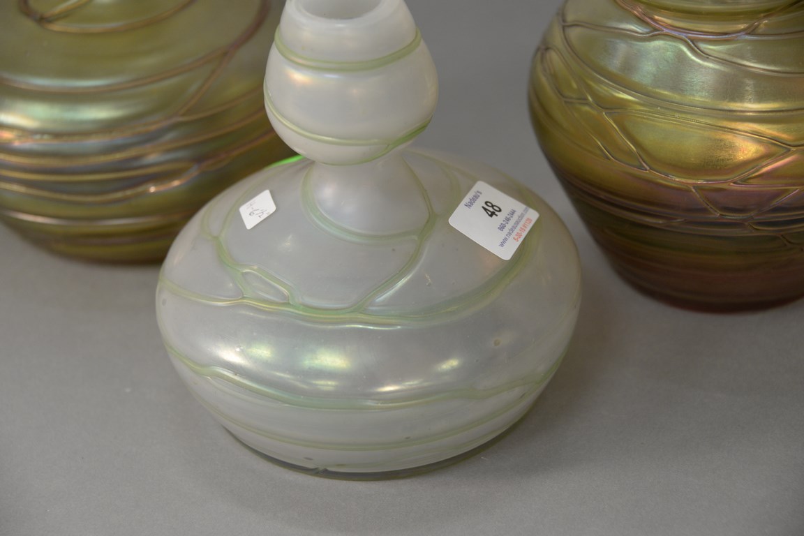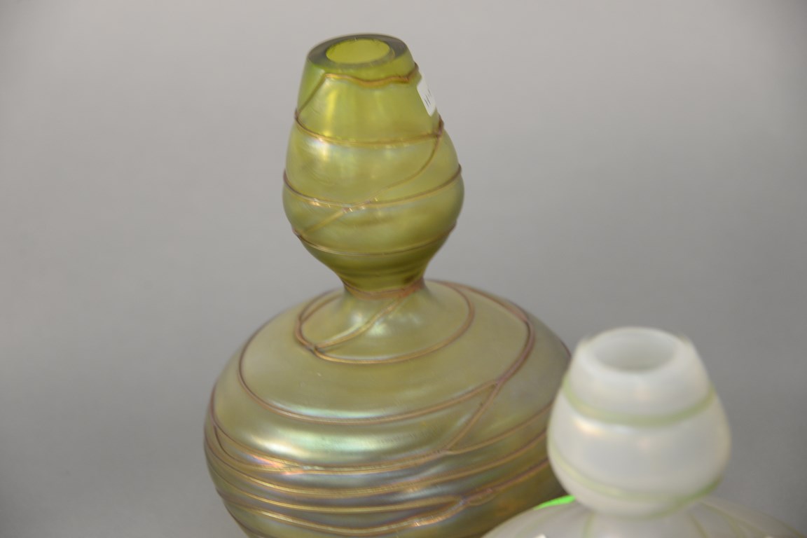 Lot 48: Three Loetz or Pallme Konig type art glass double gourde veined vases. ht. 8 1/2 in. and ht. 6 1/2 in.