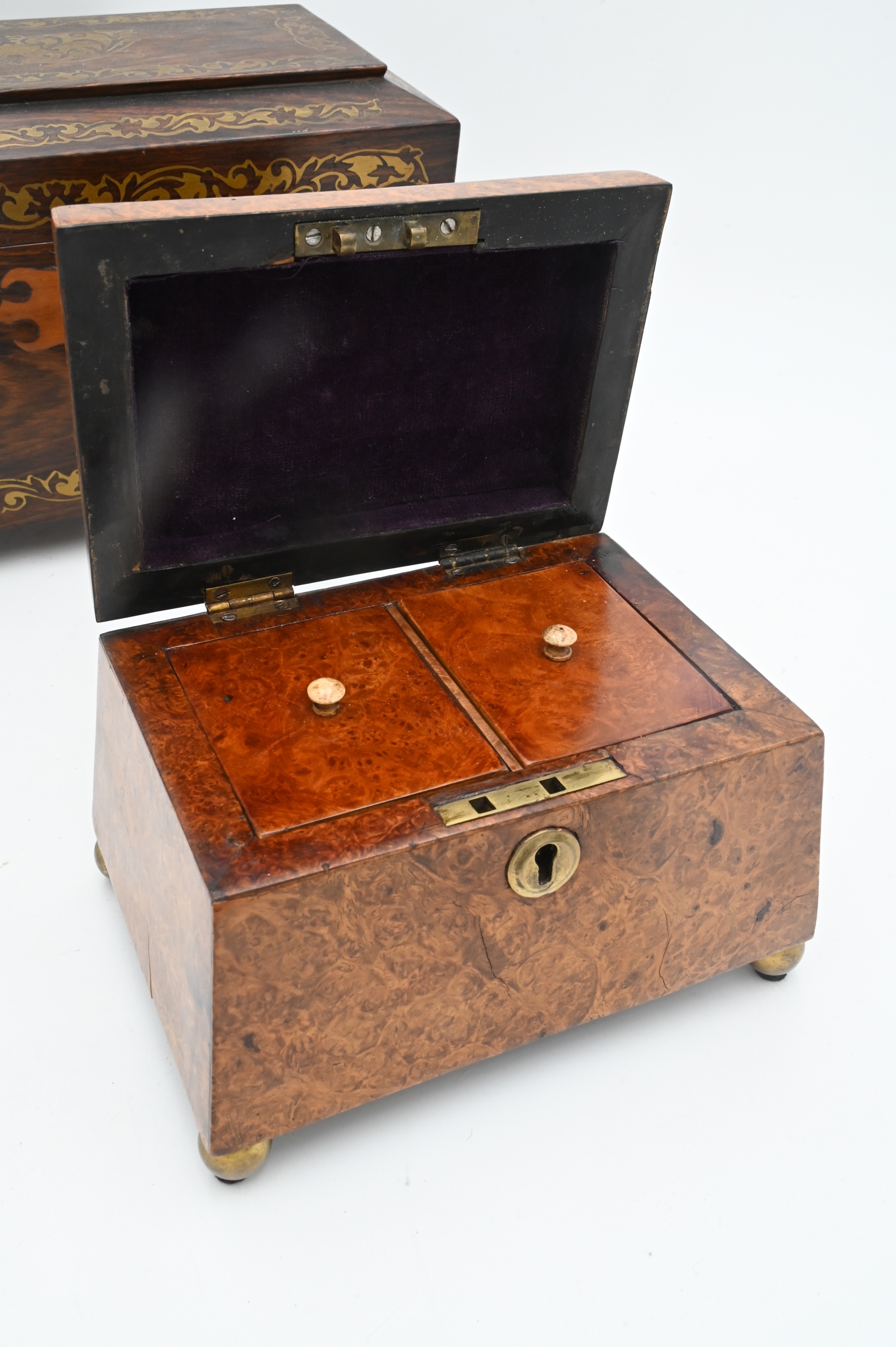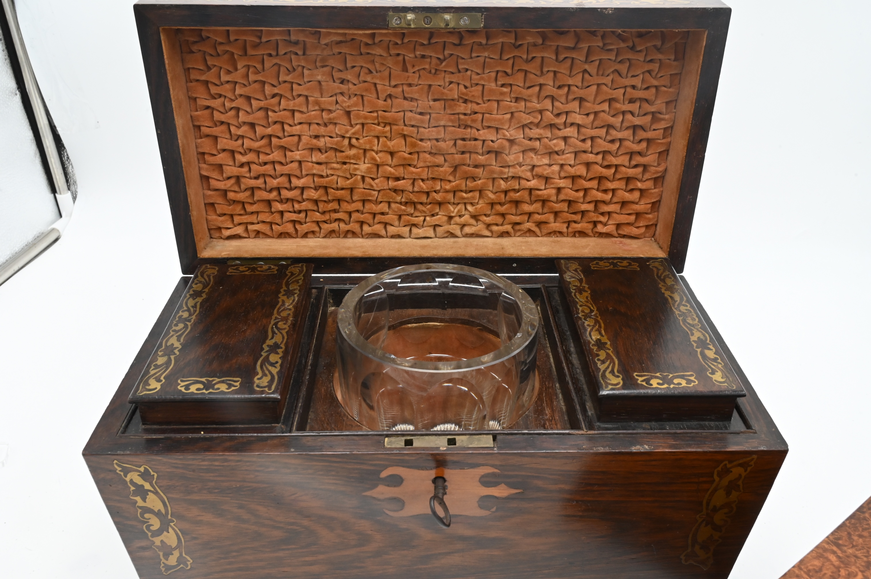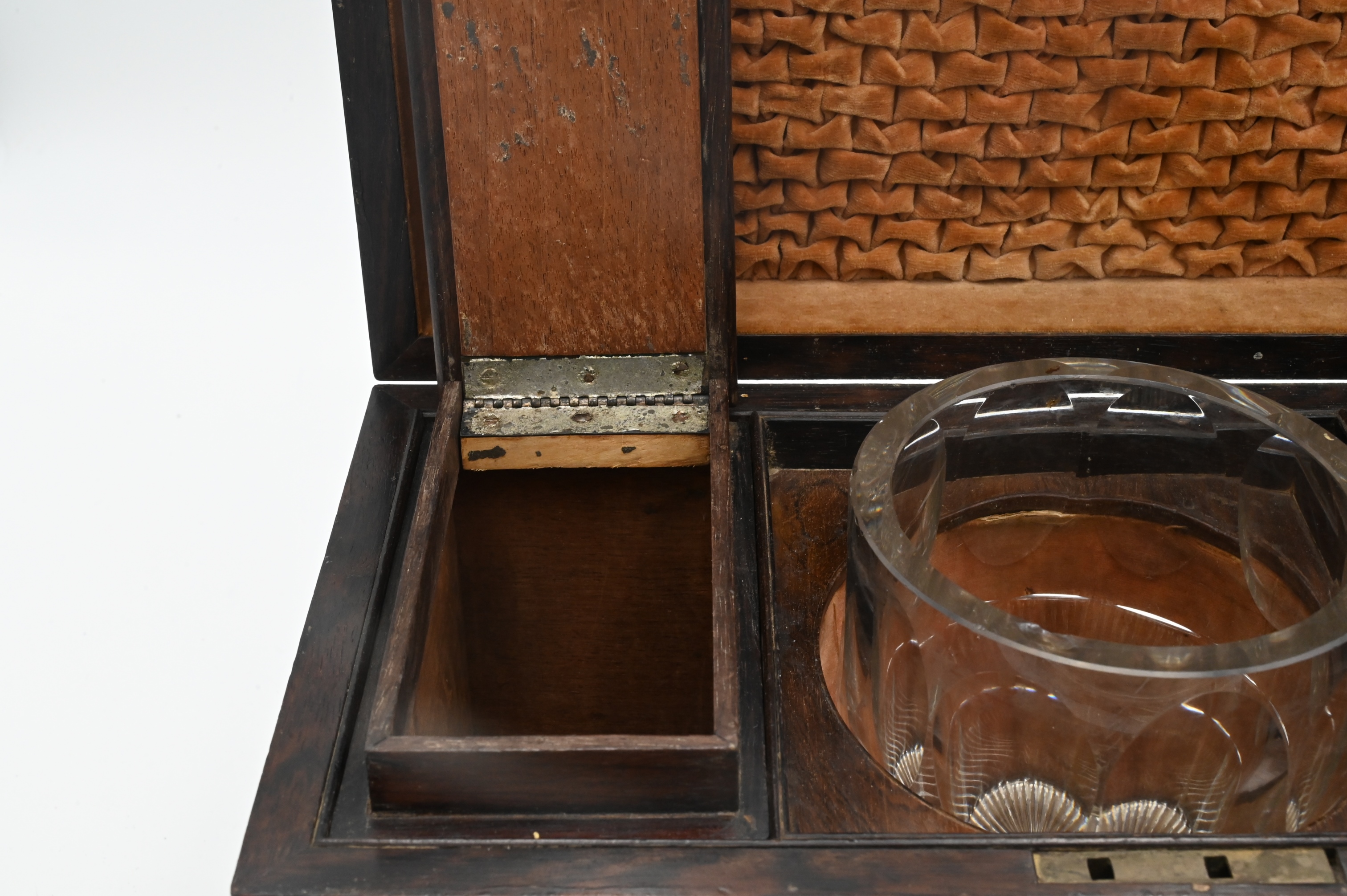 Velvet interior with two lidded side compartments, surrounding a center glass beaker