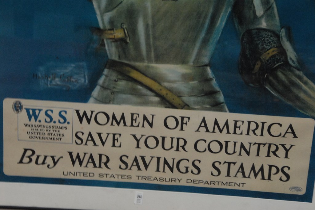 Lot 48: World War I Coffin, Haskell poster Joan of Arc Saved France. Women of America Save Your Country. Buy War Savings Stamps, sight siz…