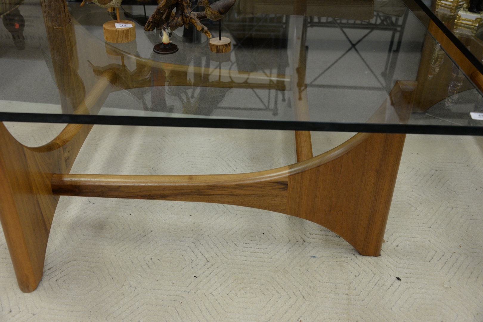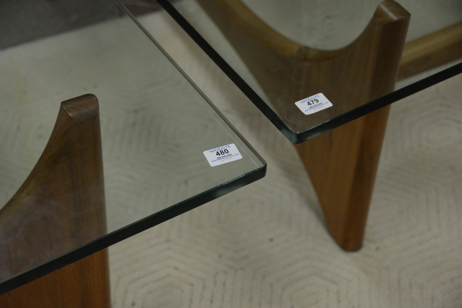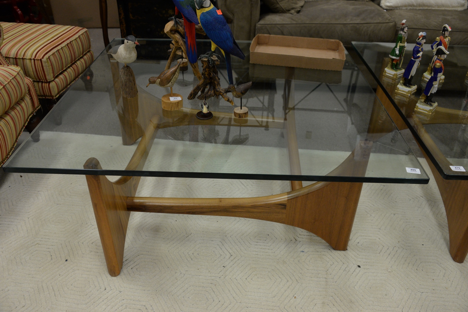 Lot 480: Custom Adrian Pearsall Style Walnut Coffee Table, having glass top, height 19 1/4 inches, top 47″ x 47″.
