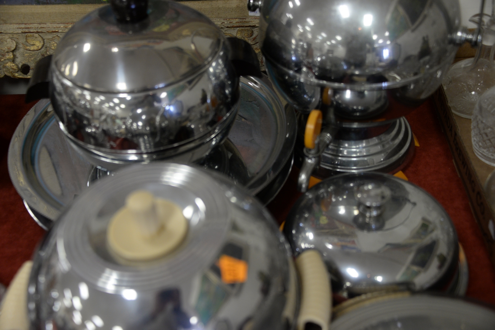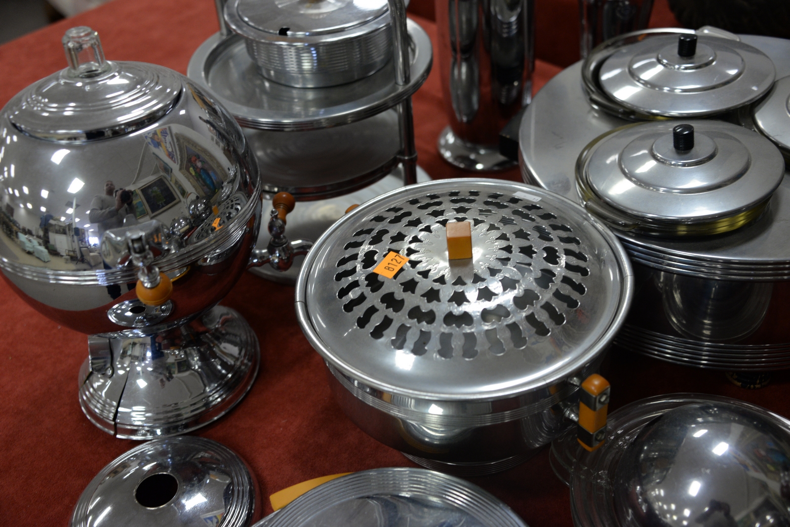 Eighteen piece group of art deco chrome serving pieces including chase chrome pieces chafing dish hot plate condiment steamer etc. hts. 4in. to 15 1/2in.