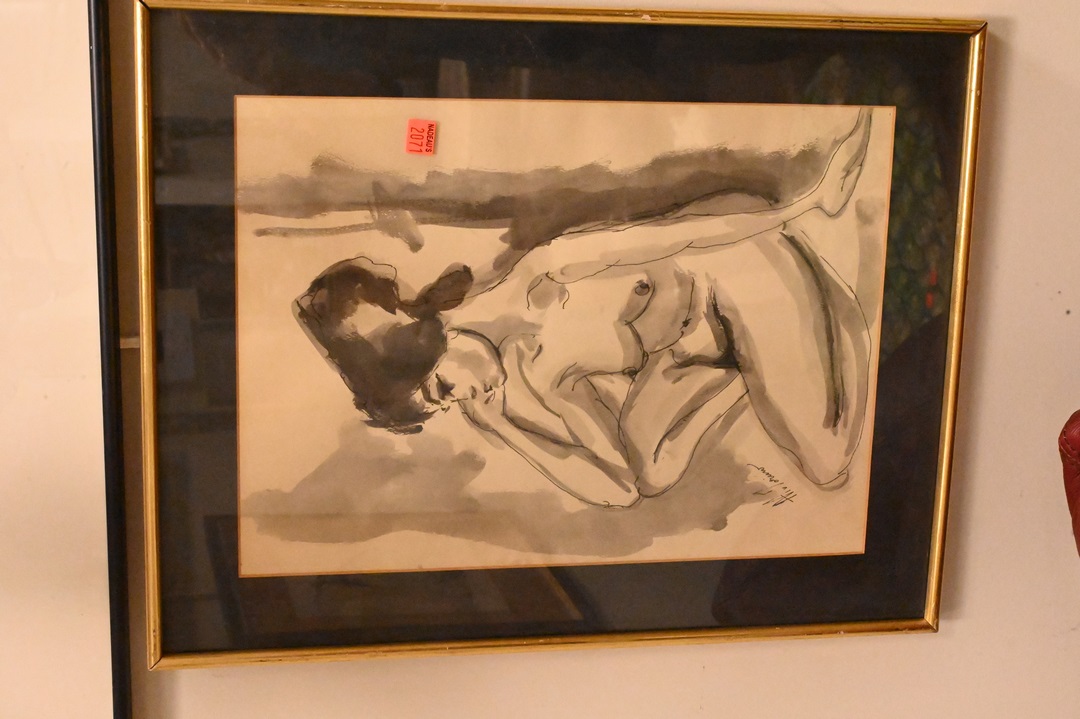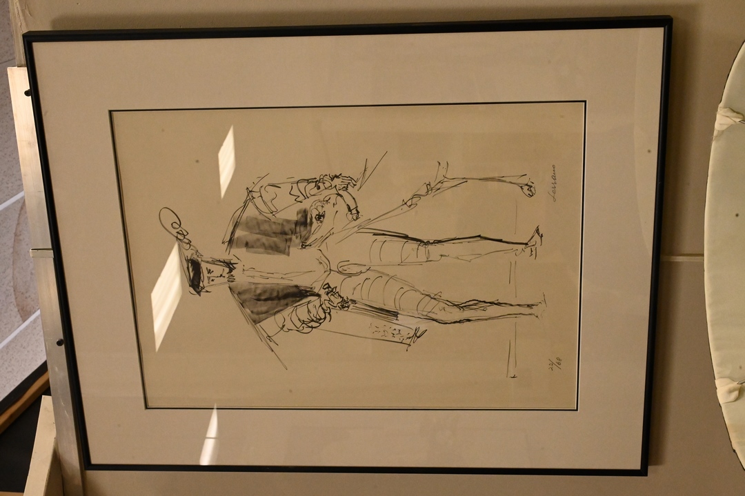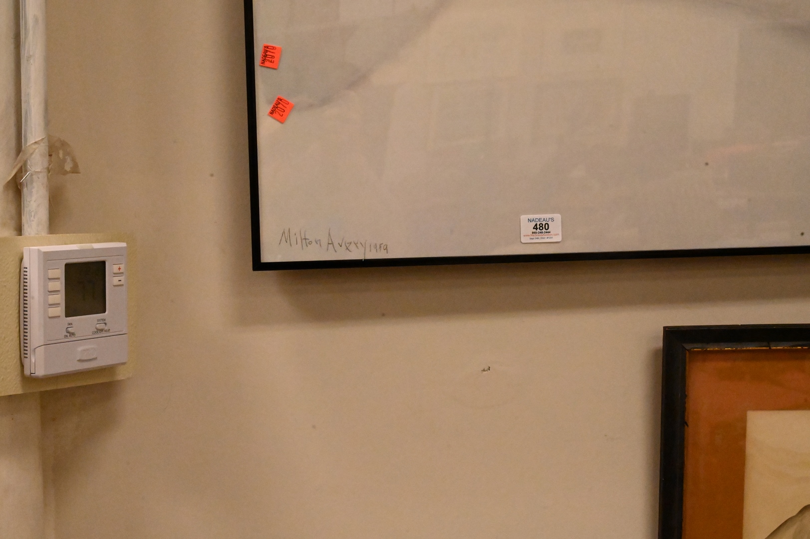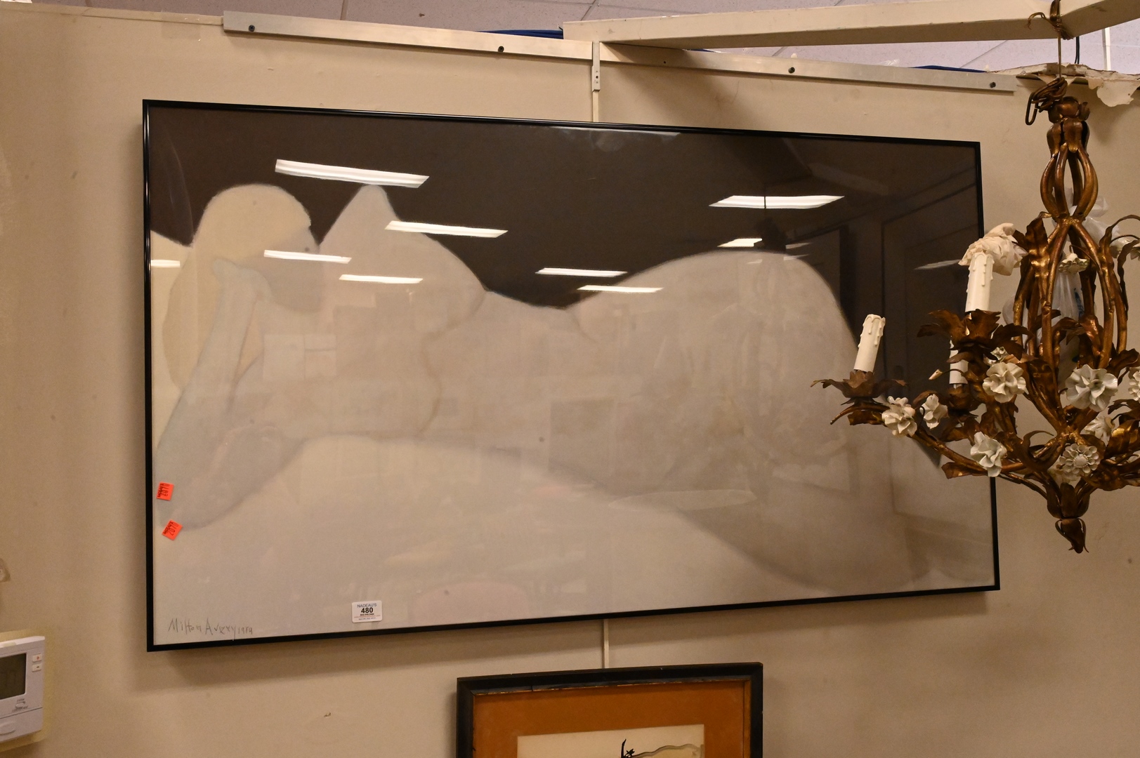 Five Piece Framed Lot, to include a pair of lithographs of soldiers, signed “Lesaro” lower right and editioned 22/68; a large Milton Avery print of a nude woman, marked “Milton Avery 1959” lower left; a nude watercolor, signed “MU Torino” lower left, along with a mixed media titled “The Lone Ranger Rides Again”, signed and dated “A. Weber, Dec 23, 1963″ lower right; largest 26 1/2″ x 47”.