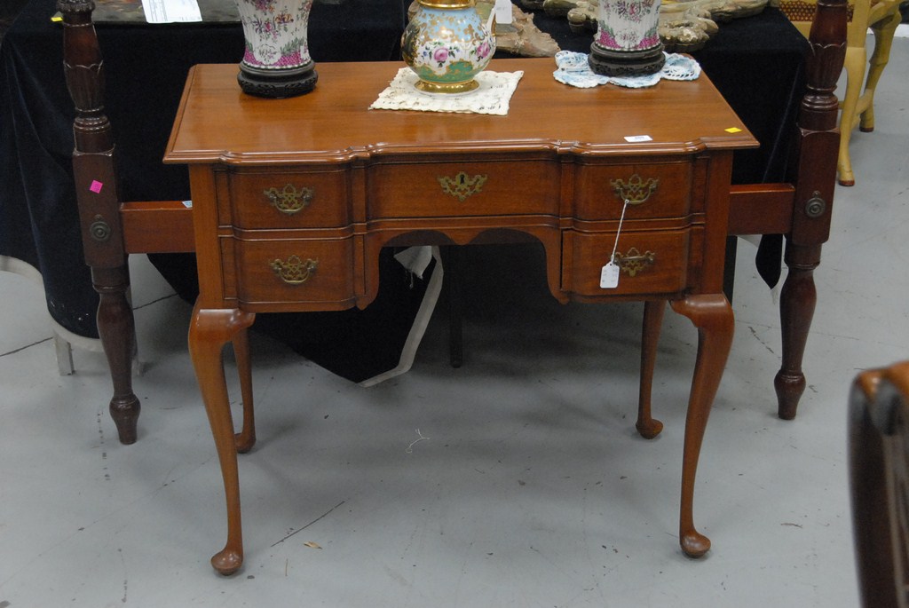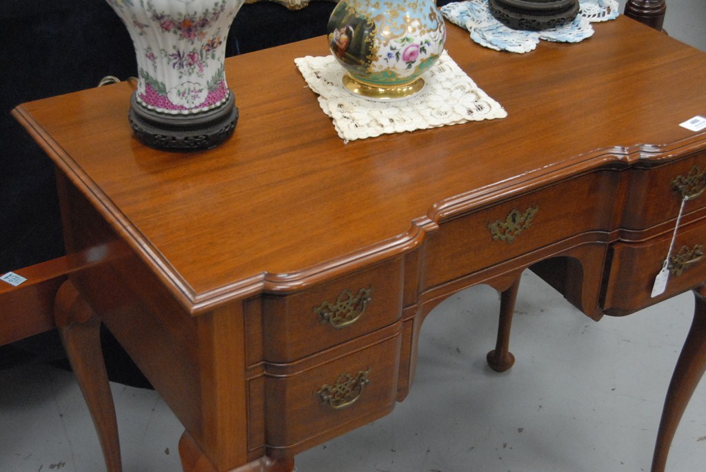Lot 480: Margolis mahogany Queen Anne style vanity / desk with shaped top over conforming blocked front set on cabriole legs ending in pad fe…
