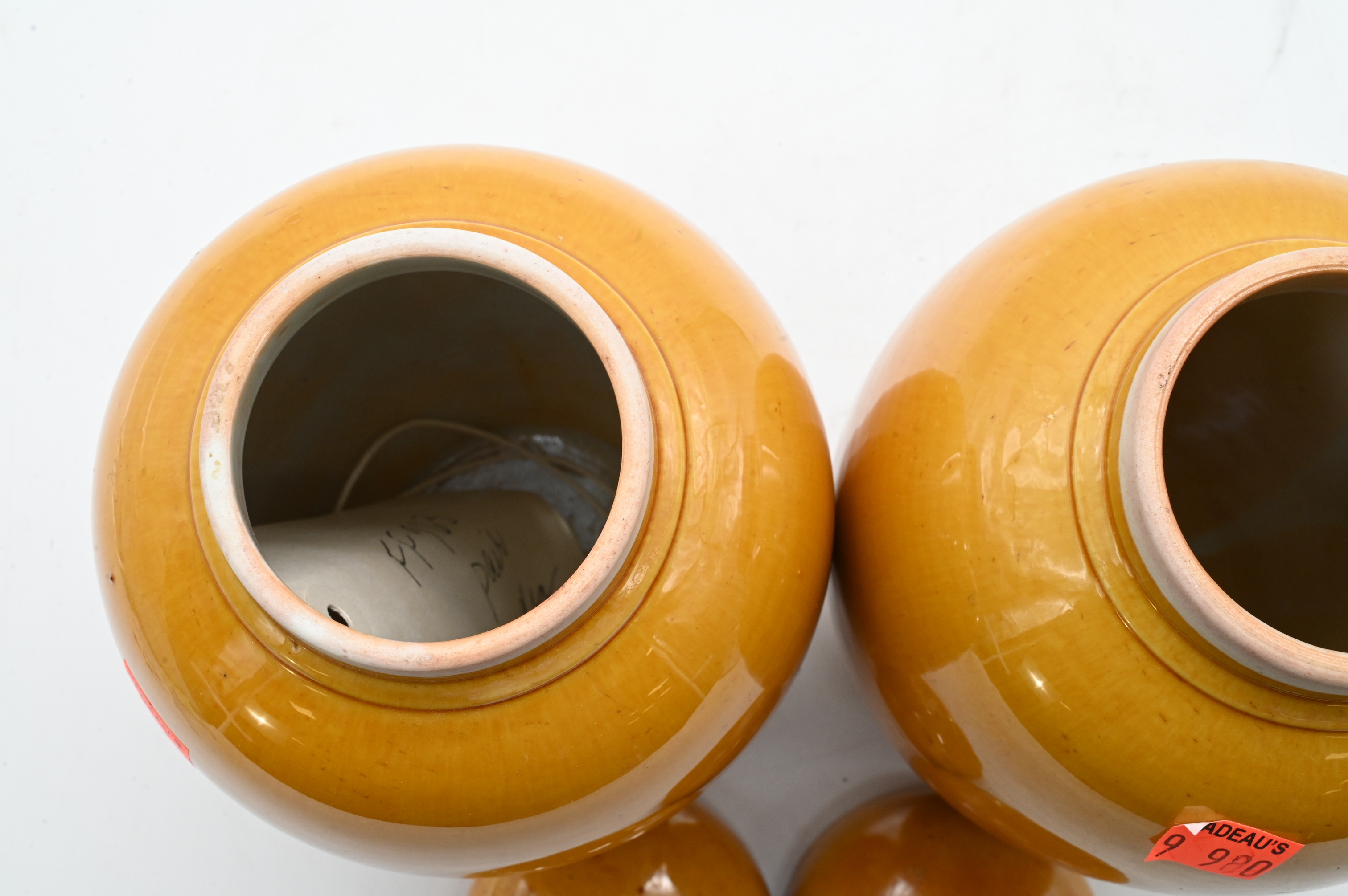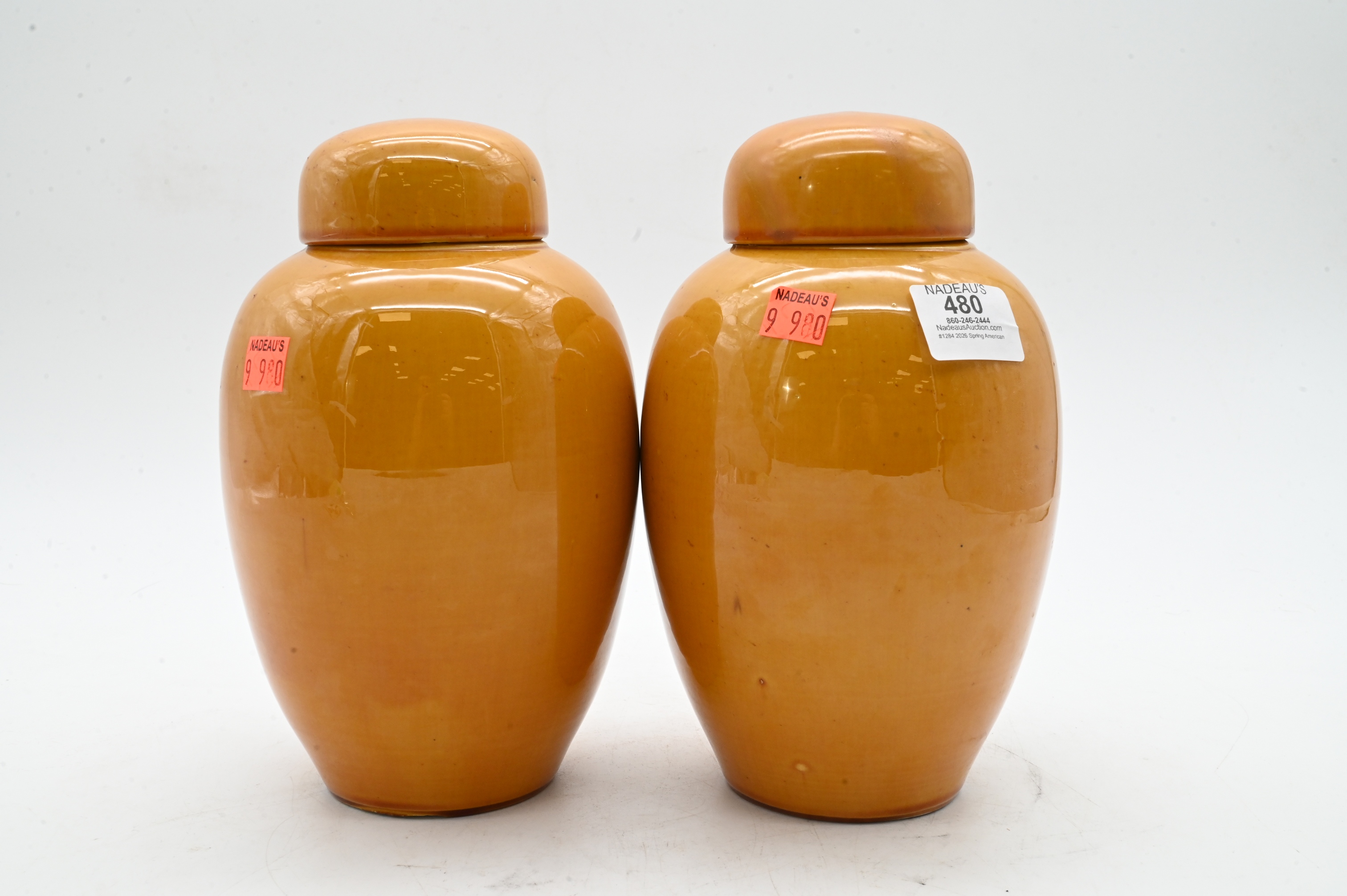 Lot 480: Pair of Yellow Glazed Ovoid Jars and Covers