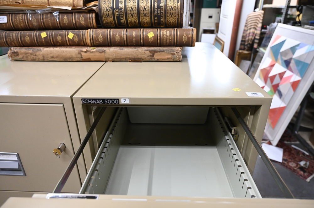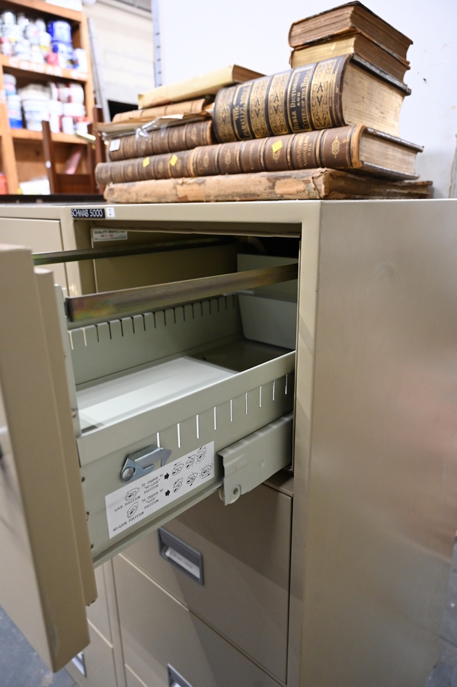 Schwab 5000 Four Drawer Fireproof File Cabinet, height 53 1/2 inches, width 19 1/2 inches.