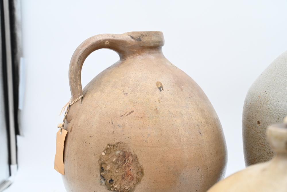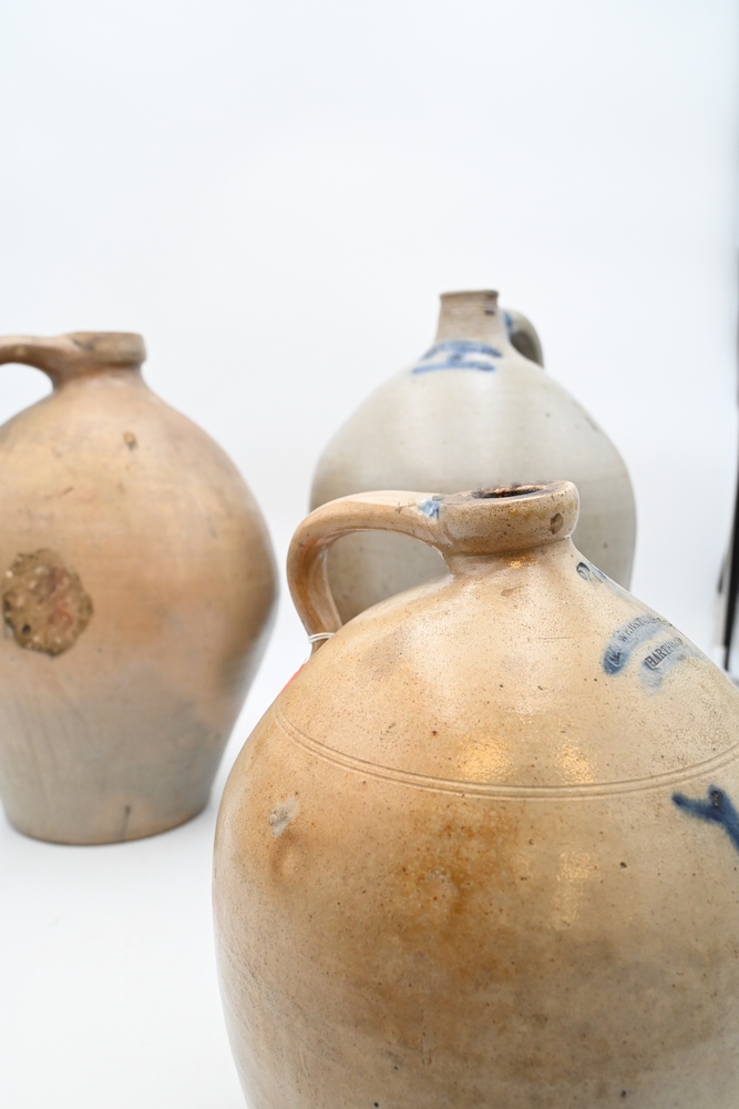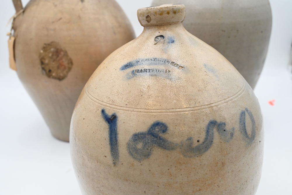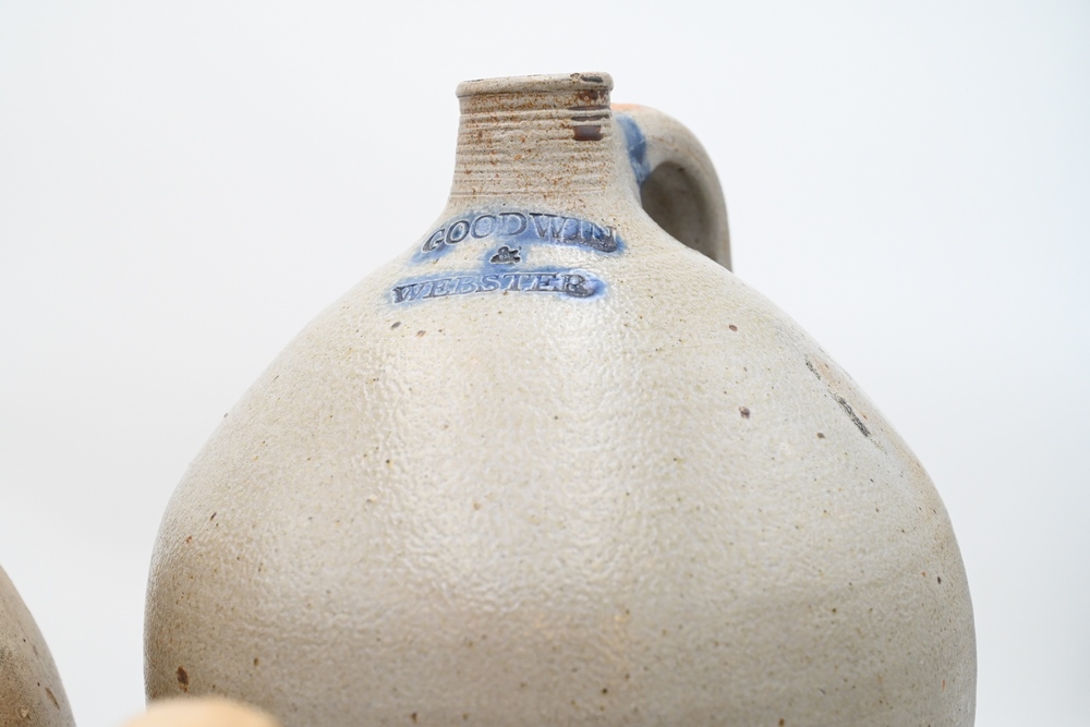 Lot 480: Three Piece Lot to include a Medford ovoid jug a Webster & Son, Hartford jug dated 1850 along with a Goodwin & Webster jug (hairlines and small chip) tallest 17 inches Provenance: Estate of Bruce Sasalla, East Hartford, Connecticut.