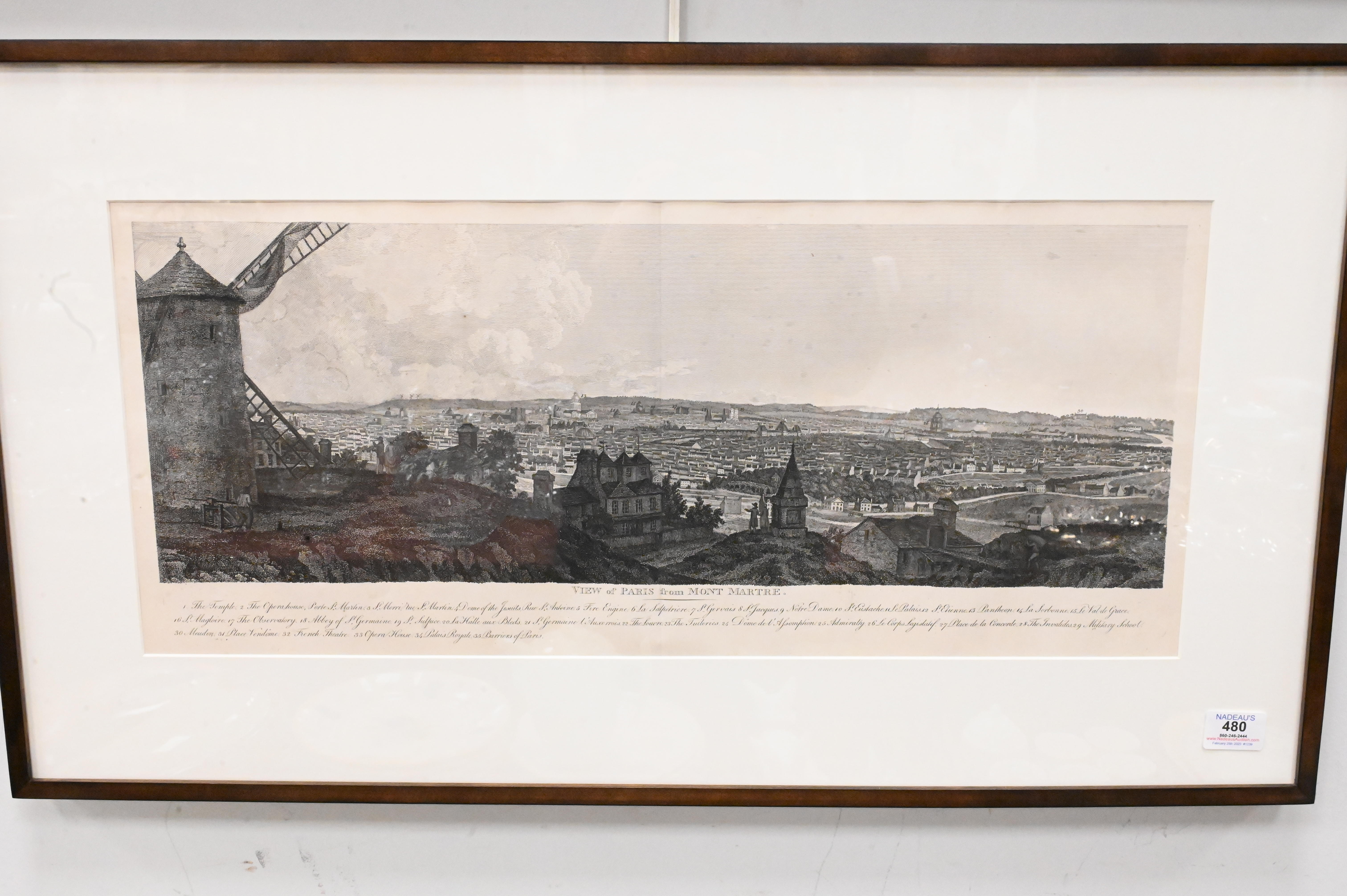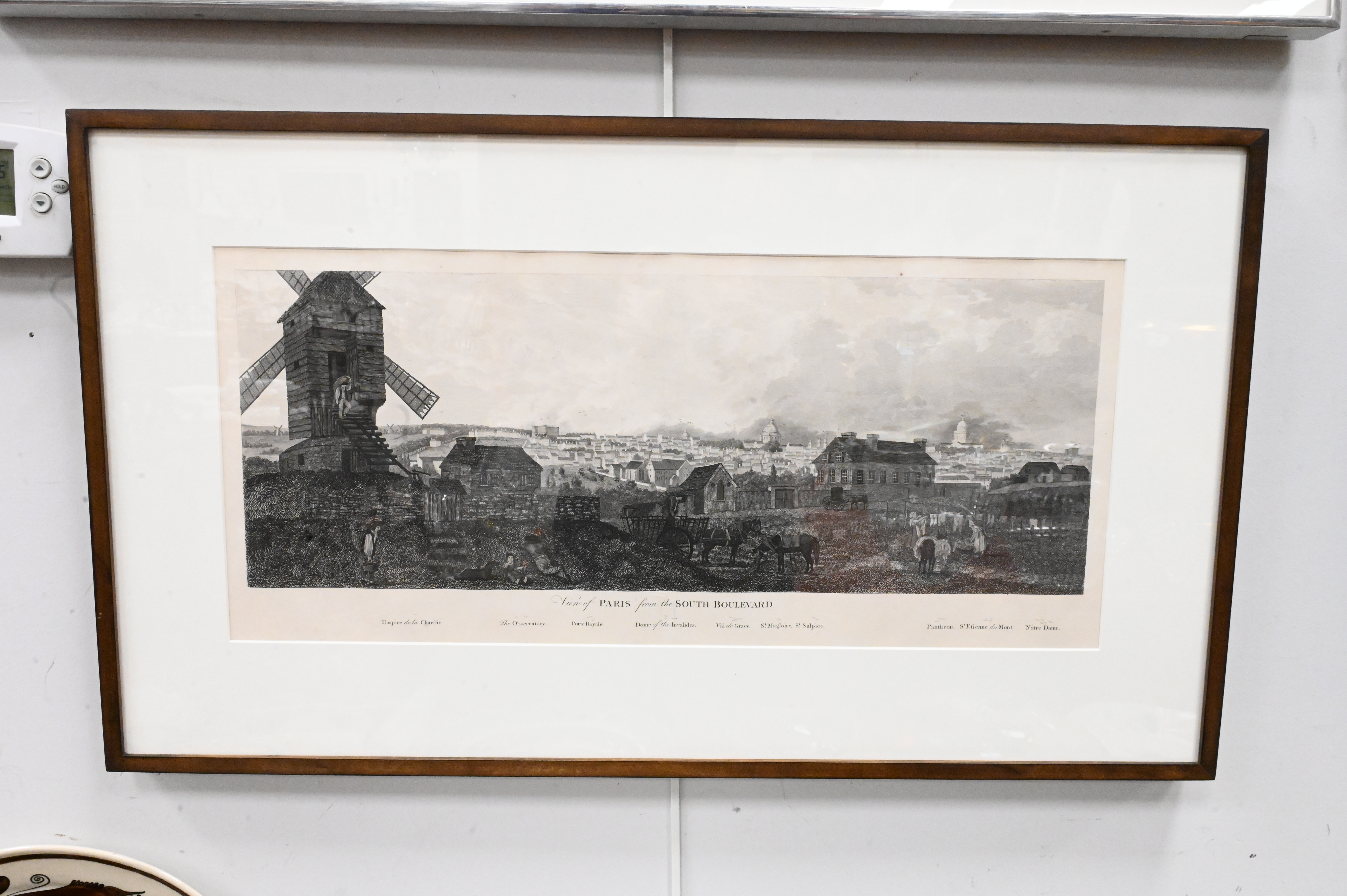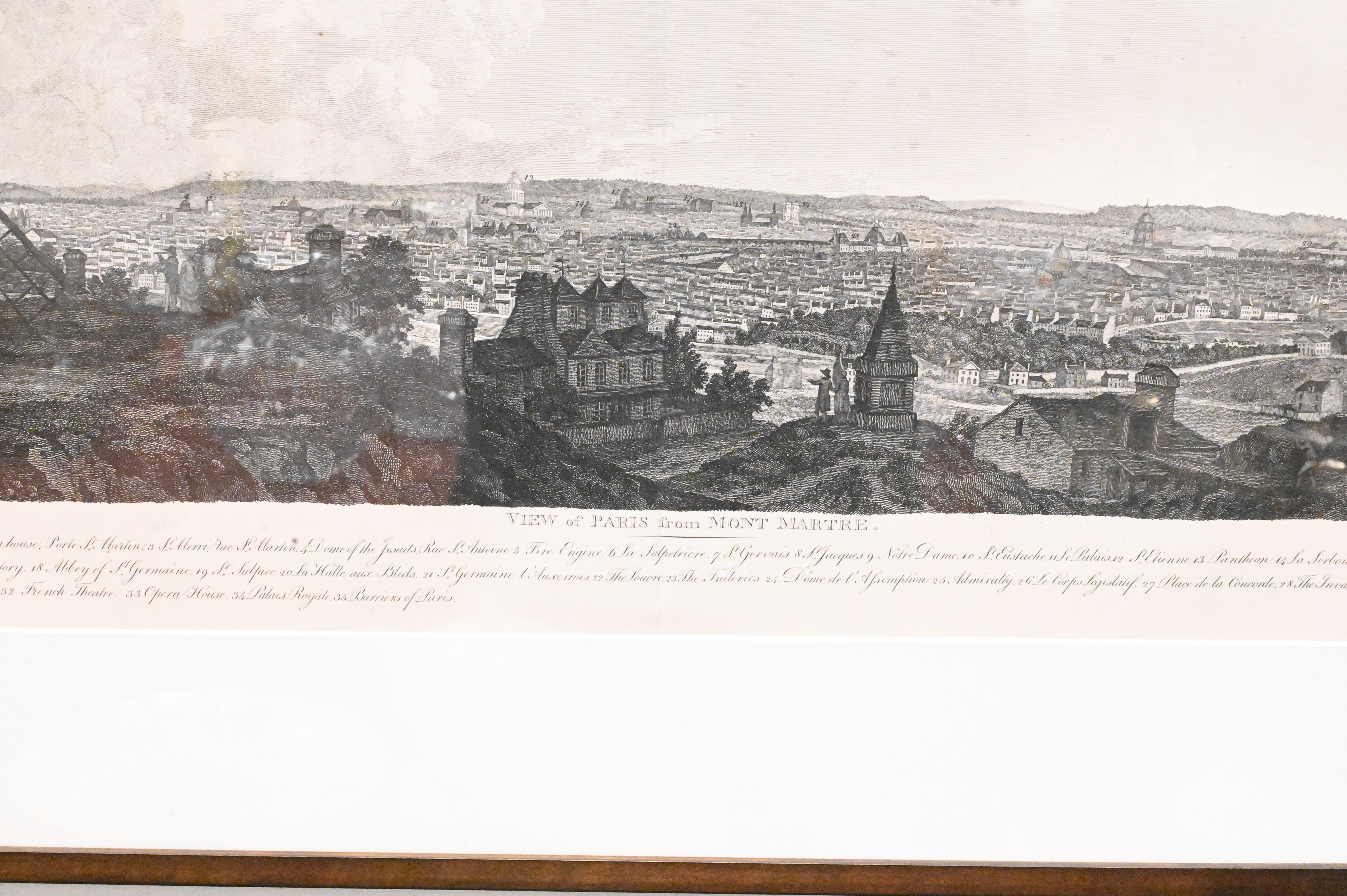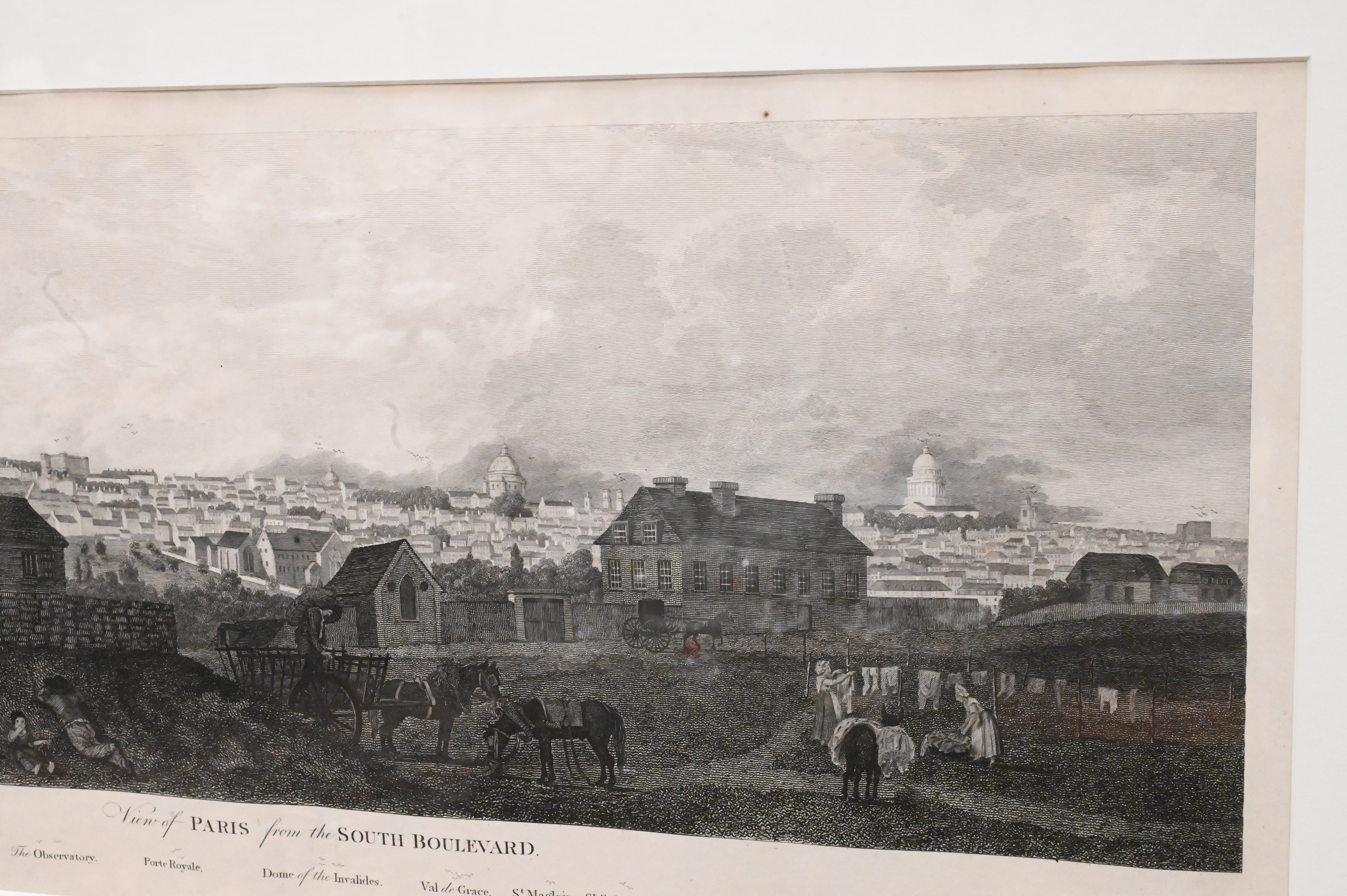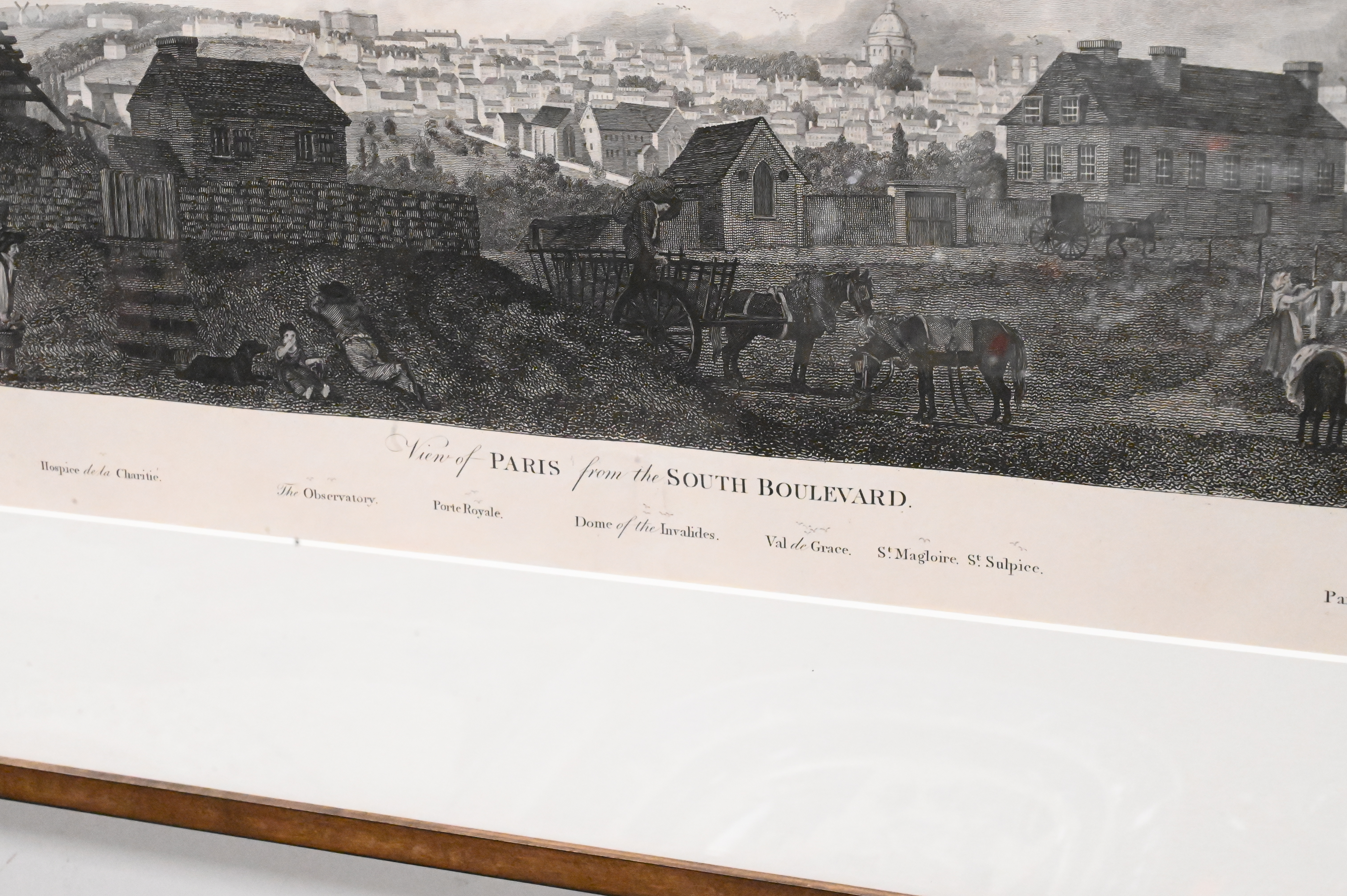 Two Framed Etchings, to include ‘View of Paris from South Blvd., 1816’, paper size 11 1/8″ x 24 1/2″; along with ‘View of Paris from Montmartre, 1816’, paper size 11 1/2″ x 25 3/4″.