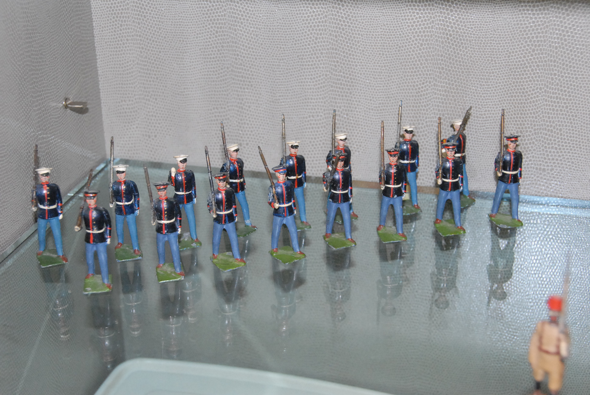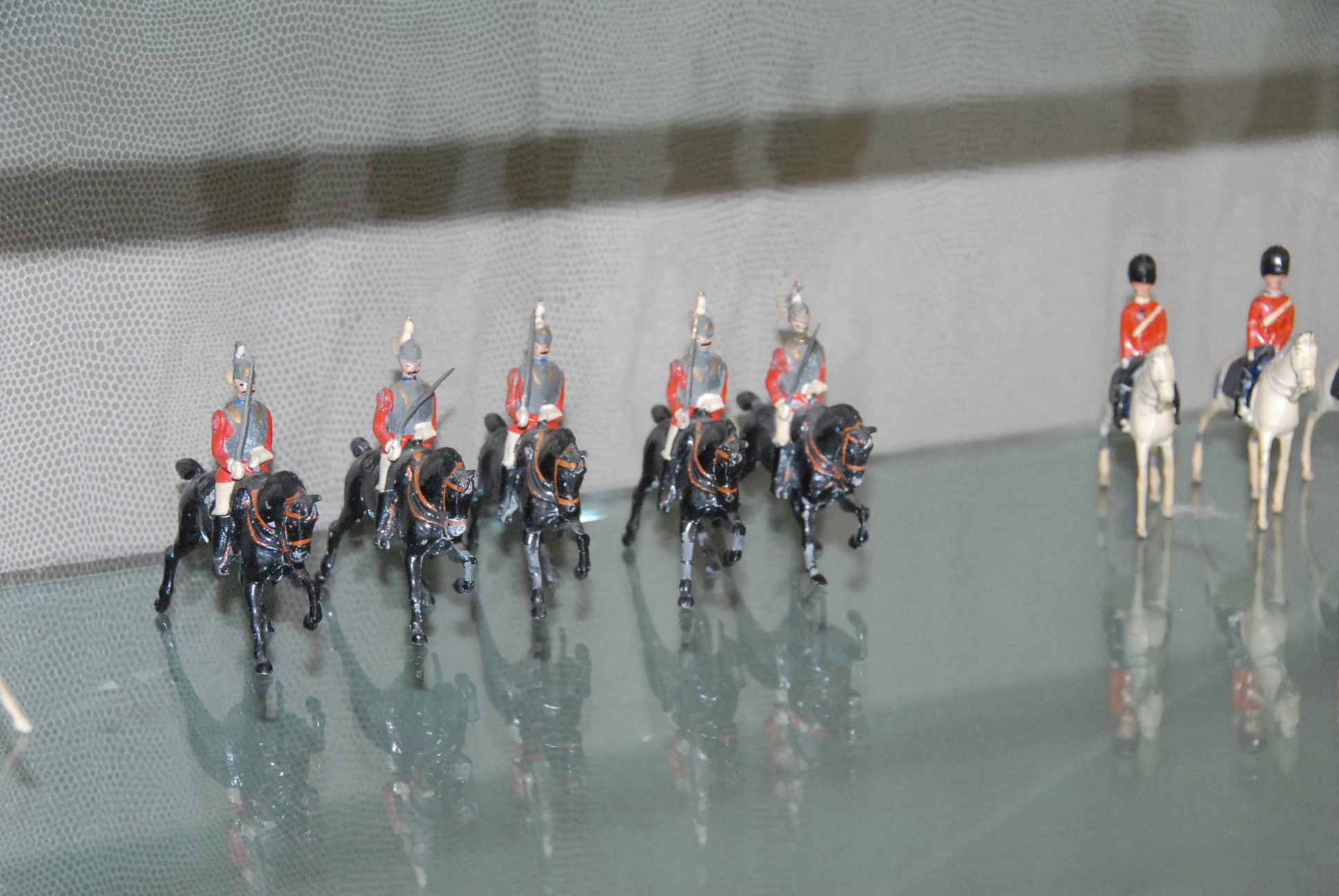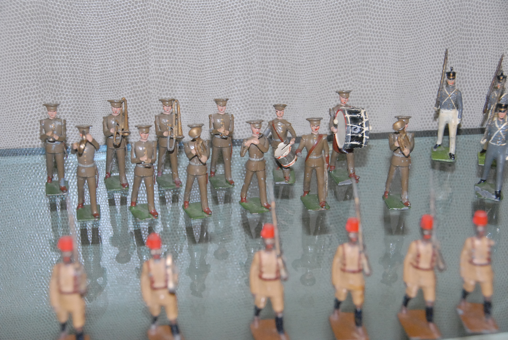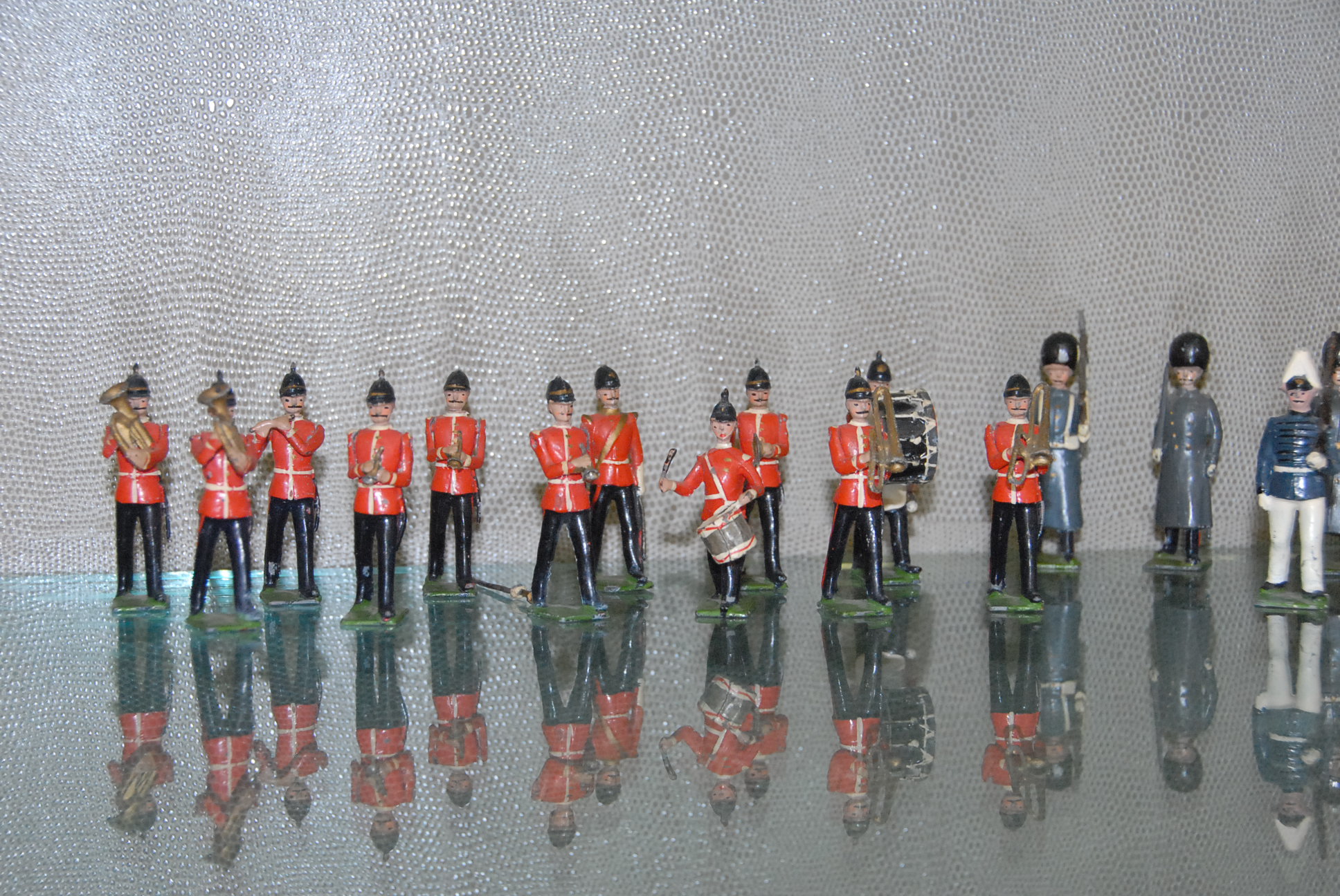Vintage lead soldiers U. S. Marines Reg. Band 1939, Life Guards Britain 1939, Bengal Lancers, U. S. Military Academy and more, 109 pieces in all.