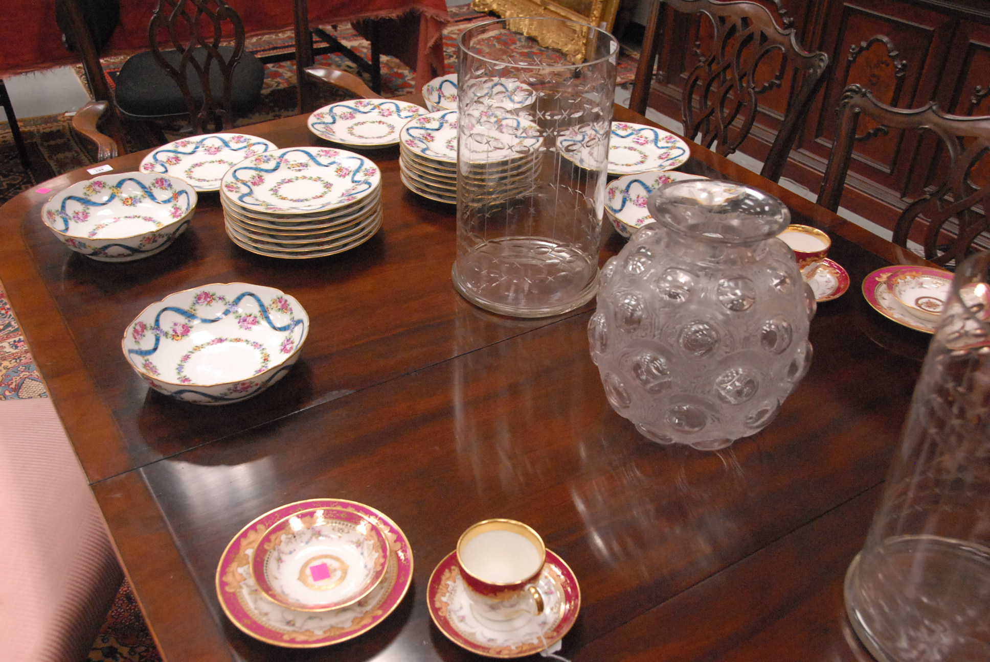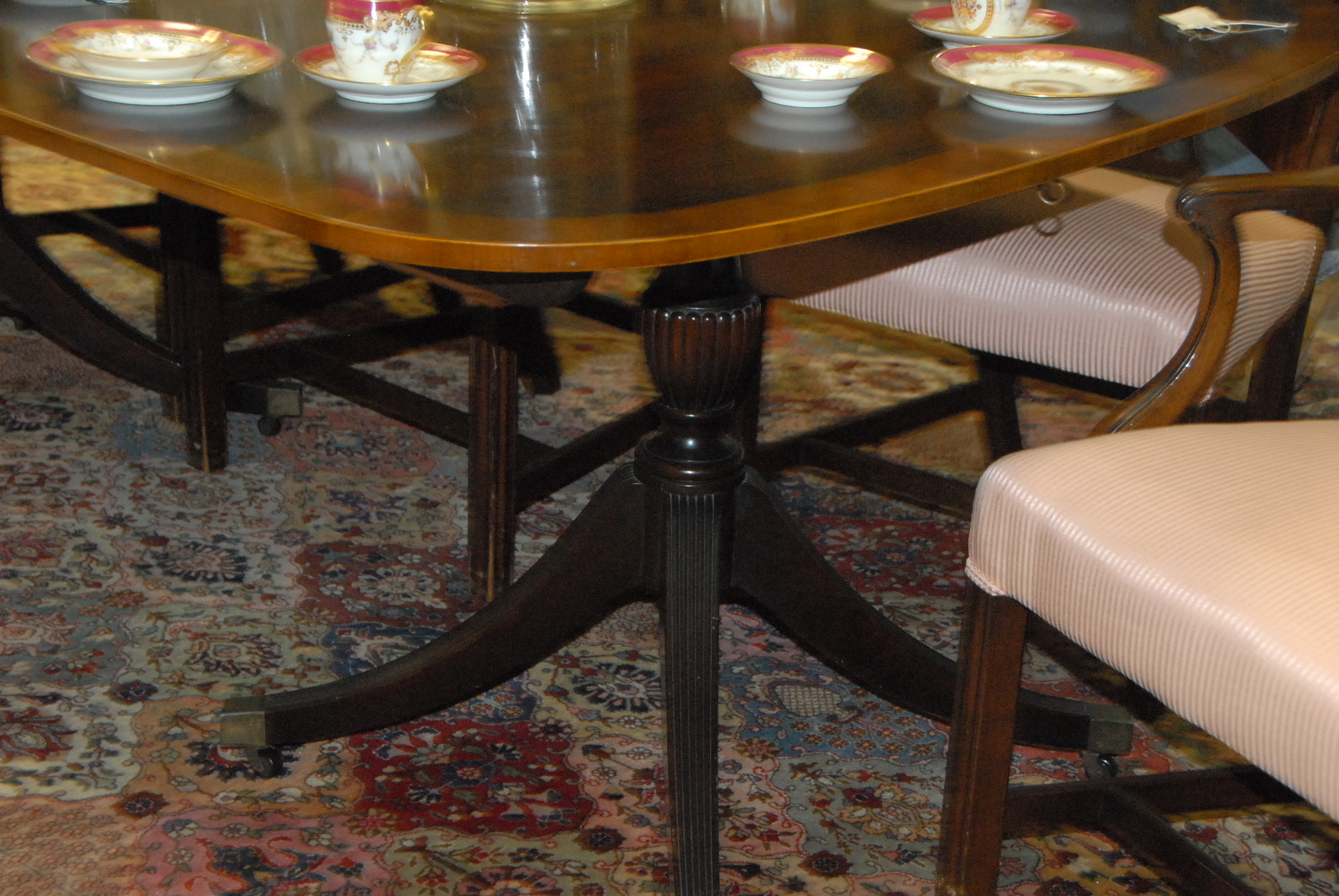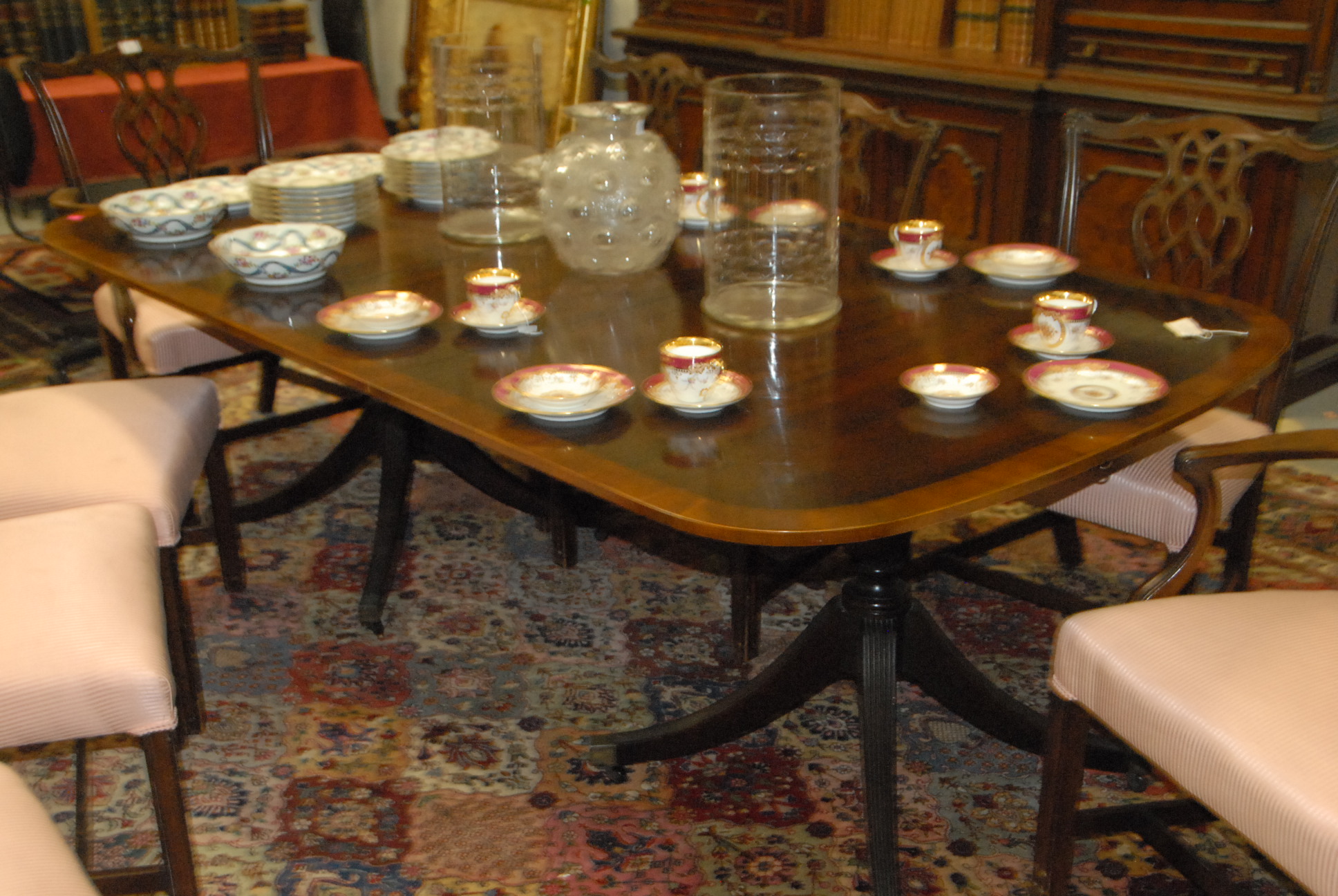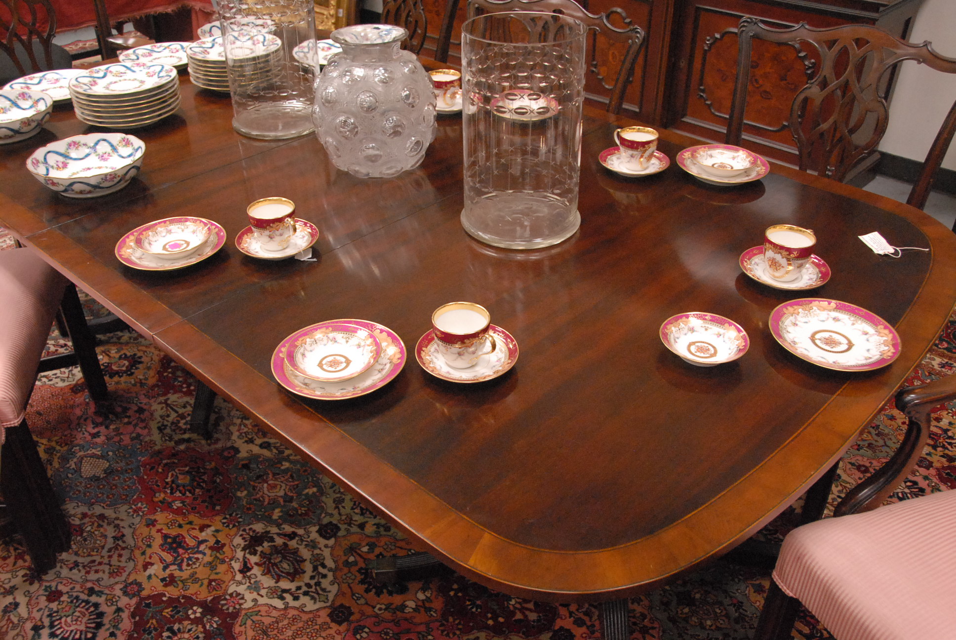 Lot 481: Baker mahogany dining table having banded inlaid top on double pedestal base with three 17 1/2 inch leaves and pads one chip on edge, signed Baker. ht. 29 1/2in. wd. 48in. lg. 68in. open: 48 x 120 1/2