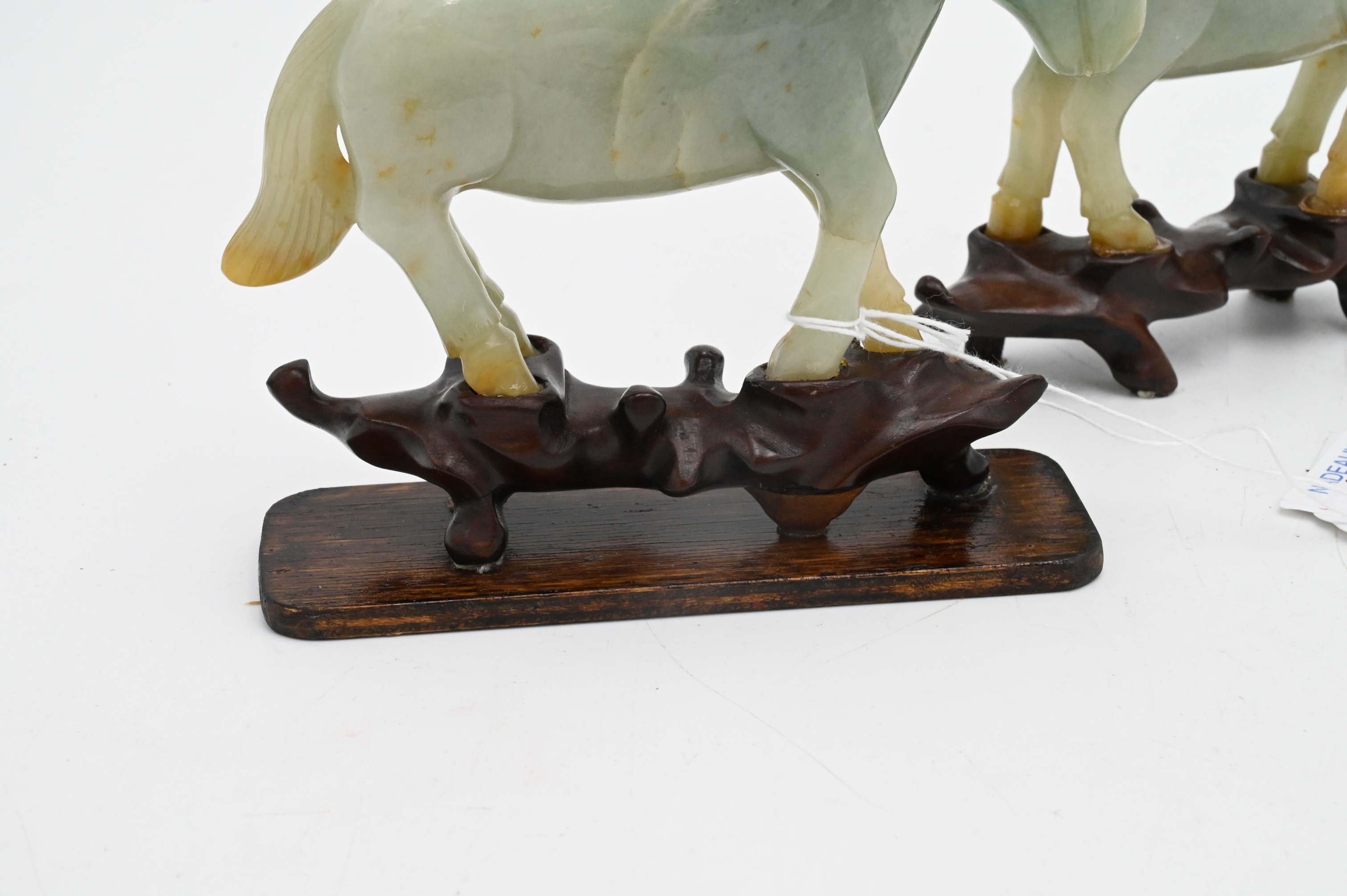 Chinese Celadon and Russet Jade Horse, carved in a walking forward position on carved stand, height 5 1/2 inches, length 5 inches. Provenance Estate of Dr. Vallo Benjamin, E. 57th St., New York.