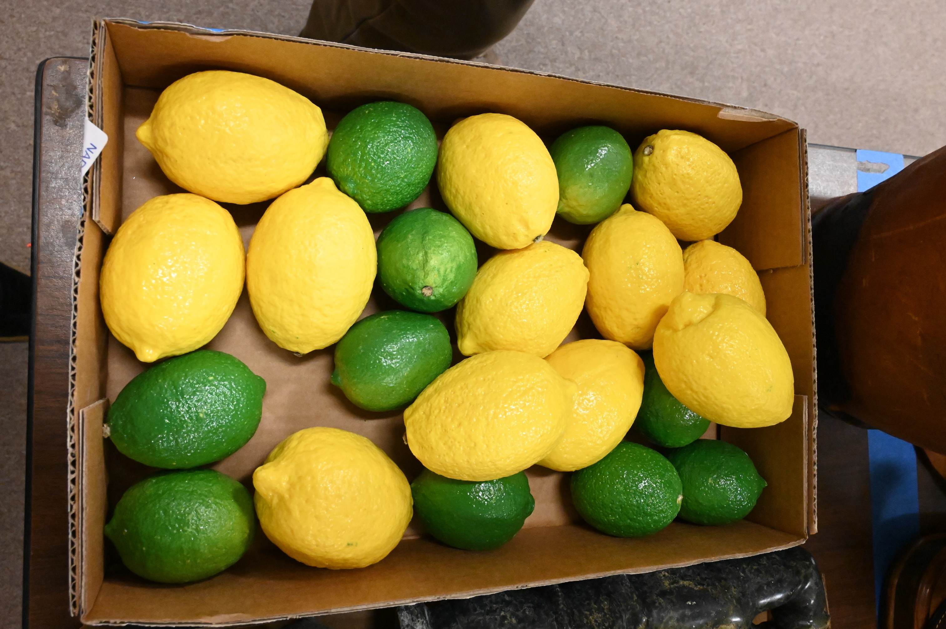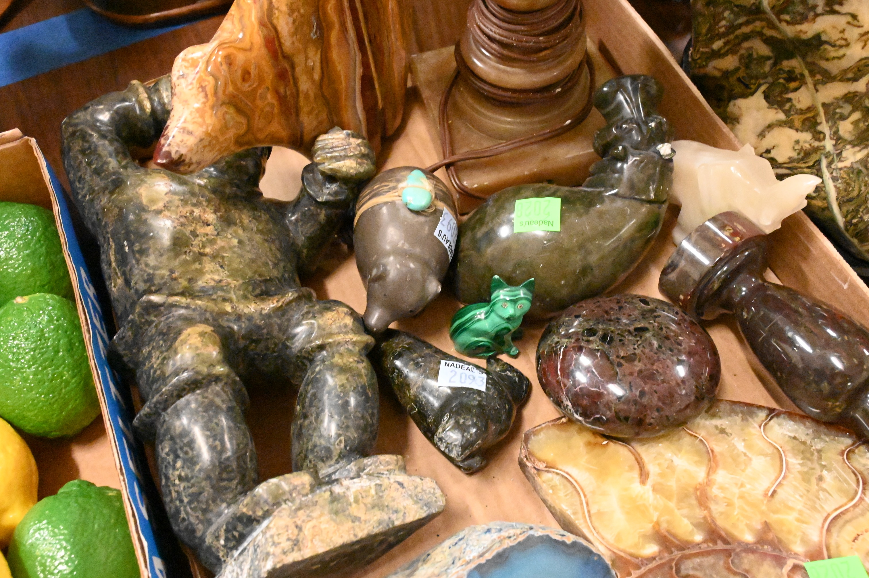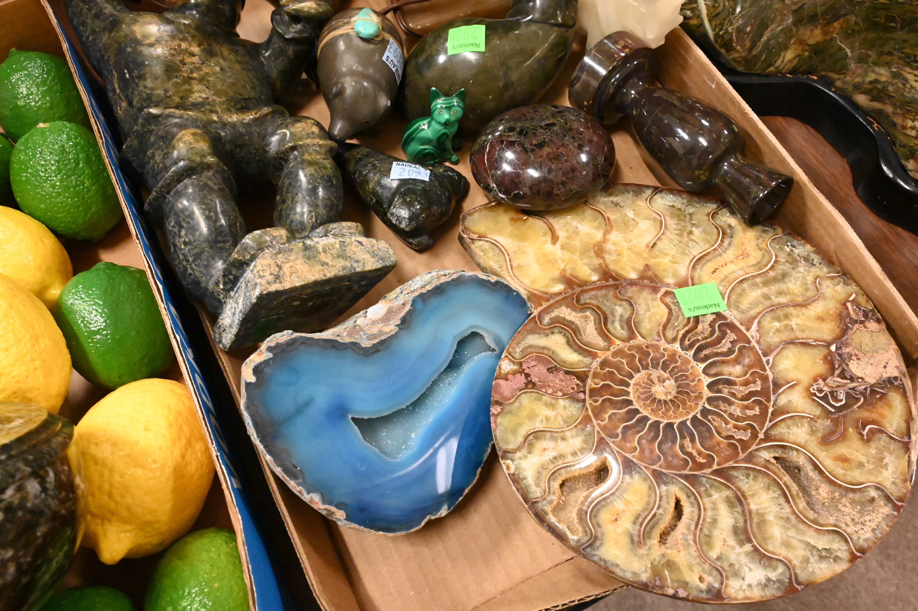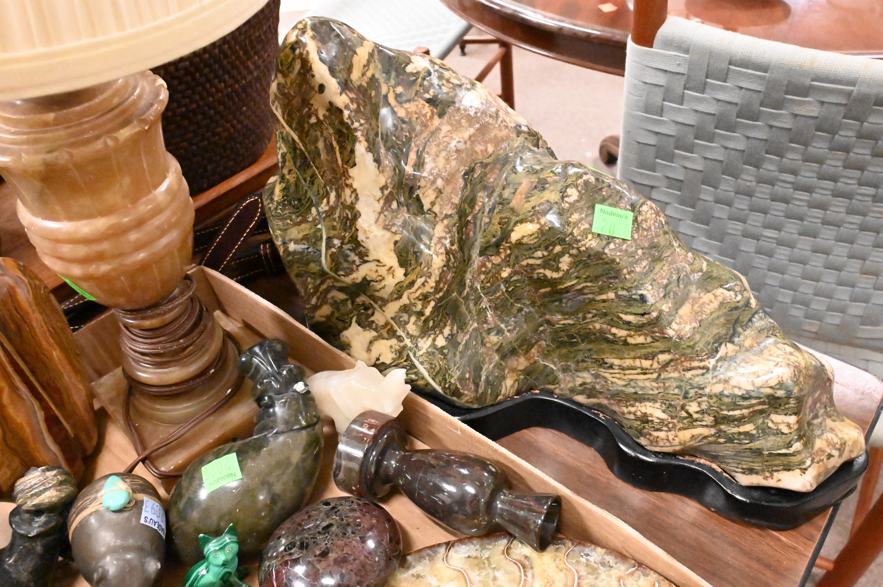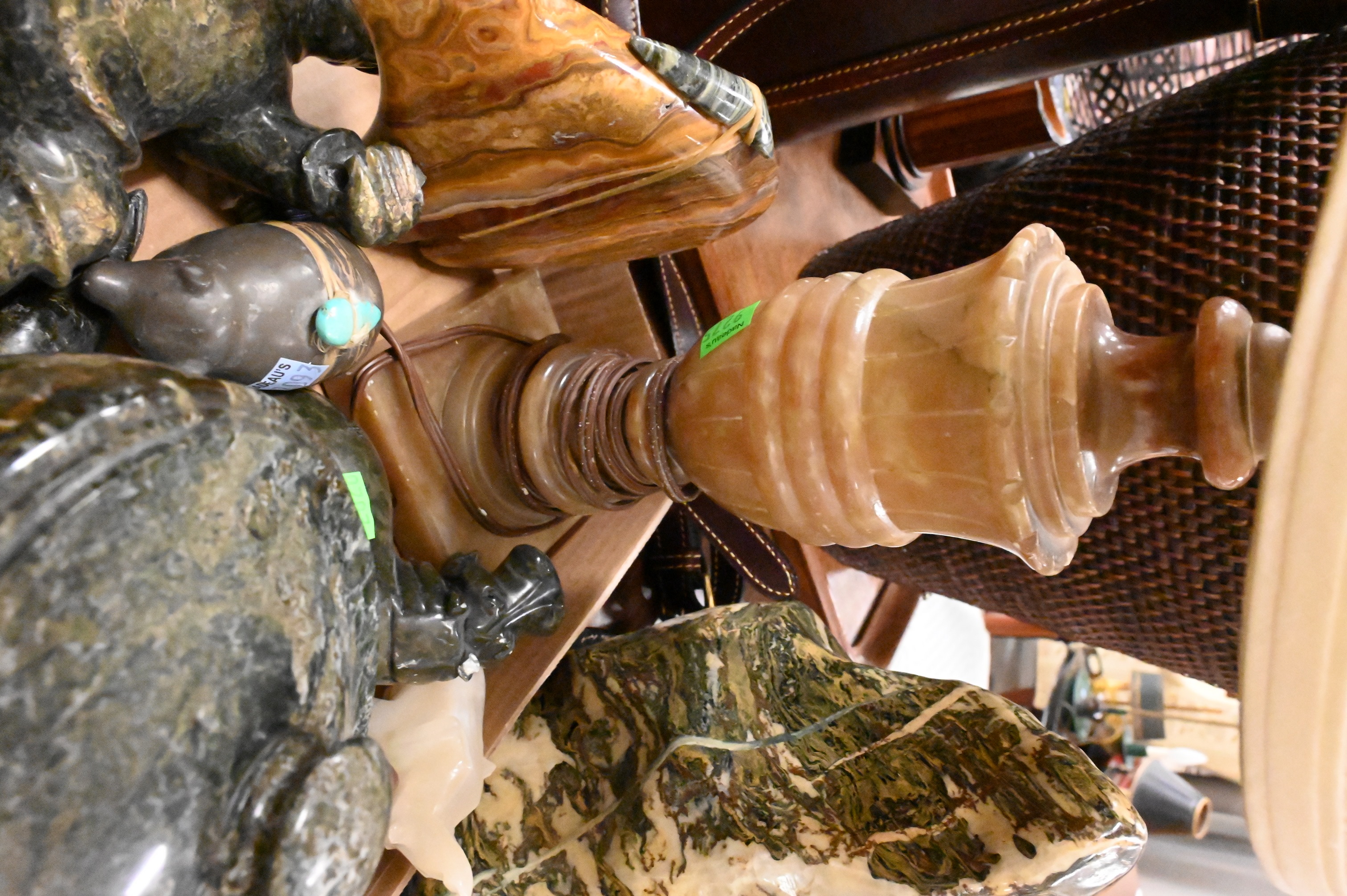 to include urn form marble table lamp, geodes, carved animals, carved figure, along with decorative faux lemons and limes, etcetera