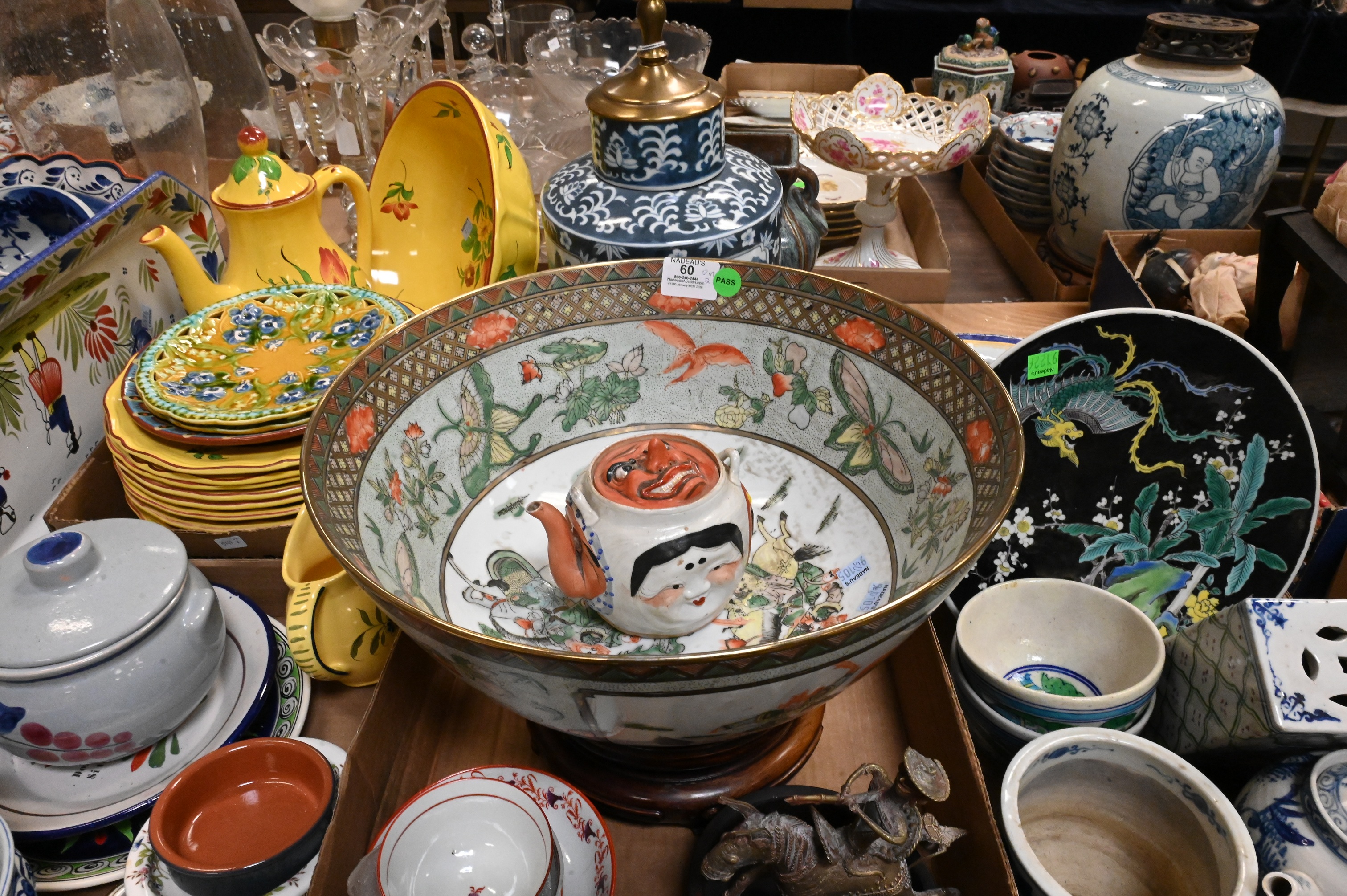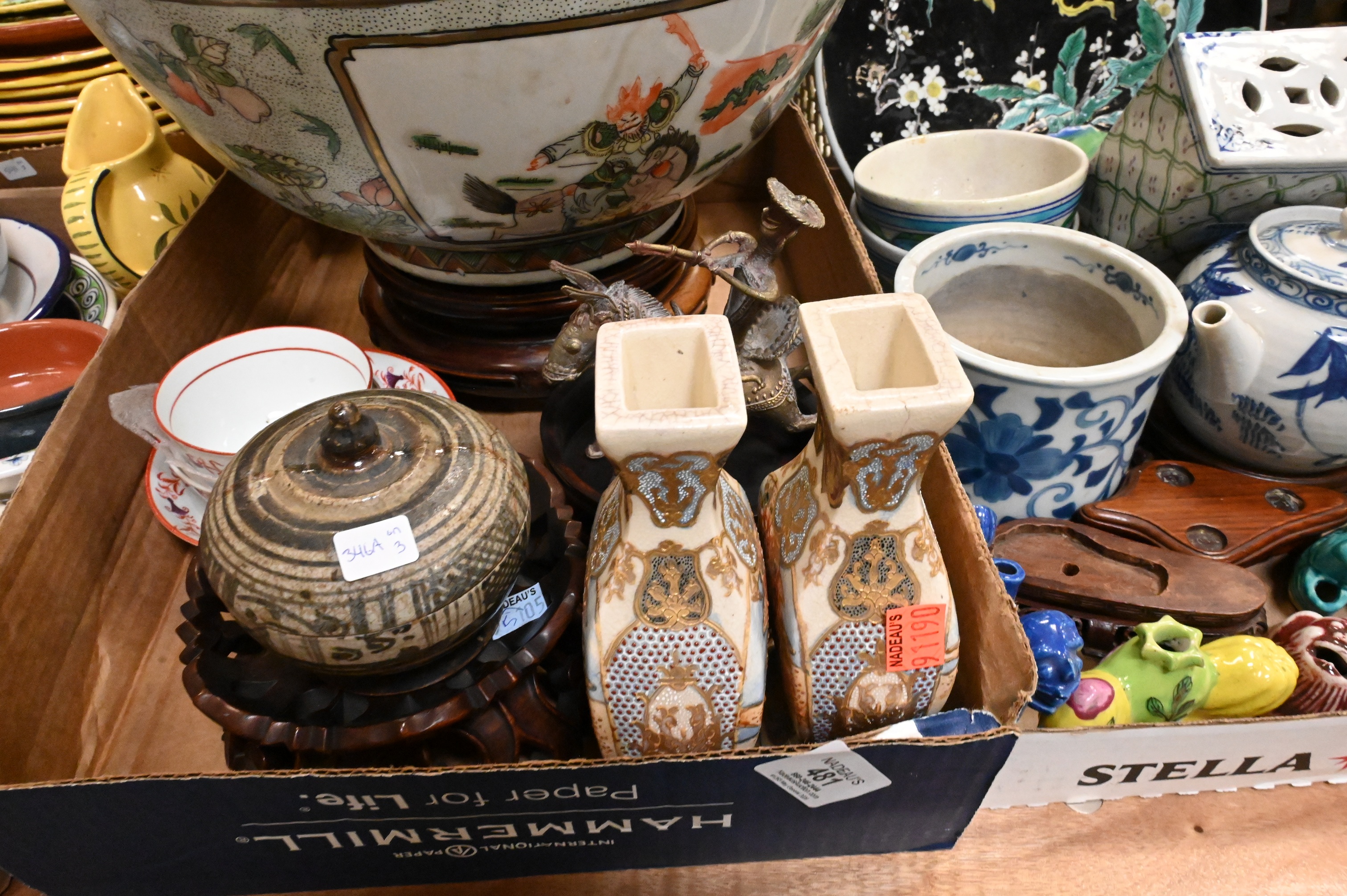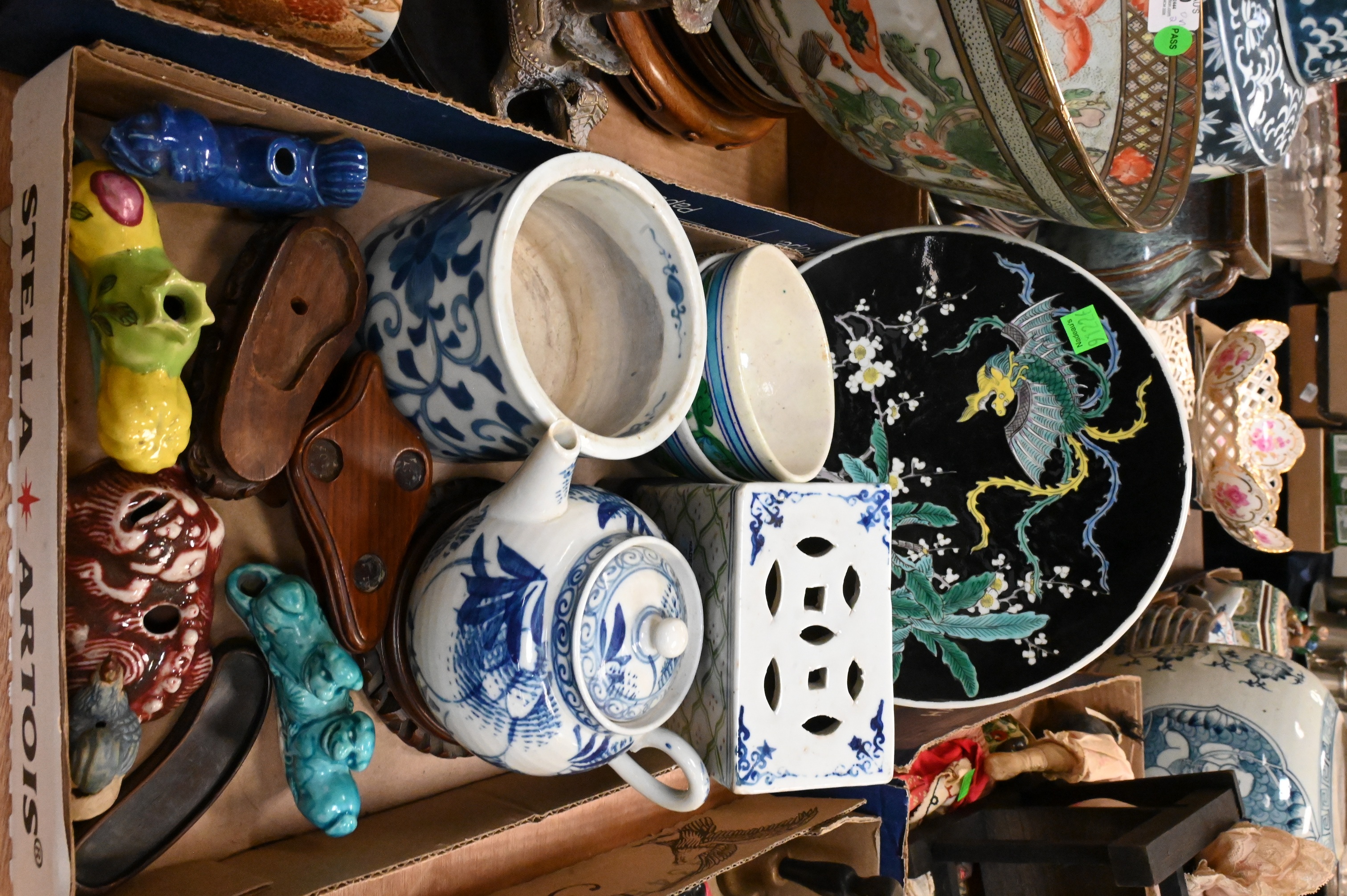 Japanese Banko ware five mask teapot, famille noire plate with dragon decoration, pierced porcelain brush pots and covered boxes, teapot, Korean plate along with small covered bowl, famille verte punch bowl with warrior on horseback and lotus flowers and butterflies motif, height 6 1/2 inches, diameter 14 inches, reticulated basket with cobalt and gilt rim, Indian jewelry mold and bronze buddha head, along with a pair of satsuma vases having X mark to underside etc…