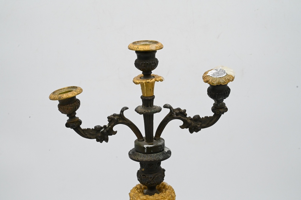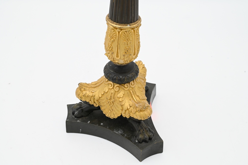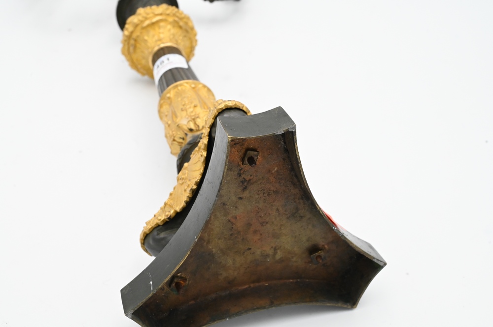 Lot 481: French Empire Gilt and Patinated Bronze Candelabra, having two arms with center candle holders on tripod claw foot base, (missing arm), height 20 inches.