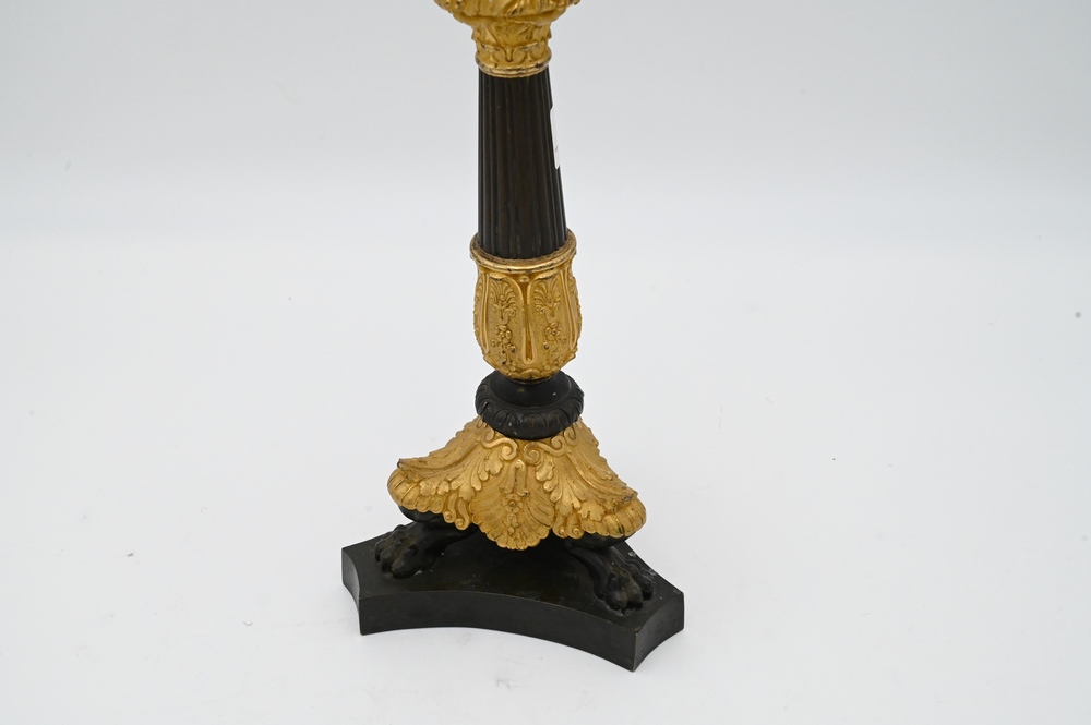 French Empire Gilt and Patinated Bronze Candelabra, having two arms with center candle holders on tripod claw foot base, (missing arm), height 20 inches.