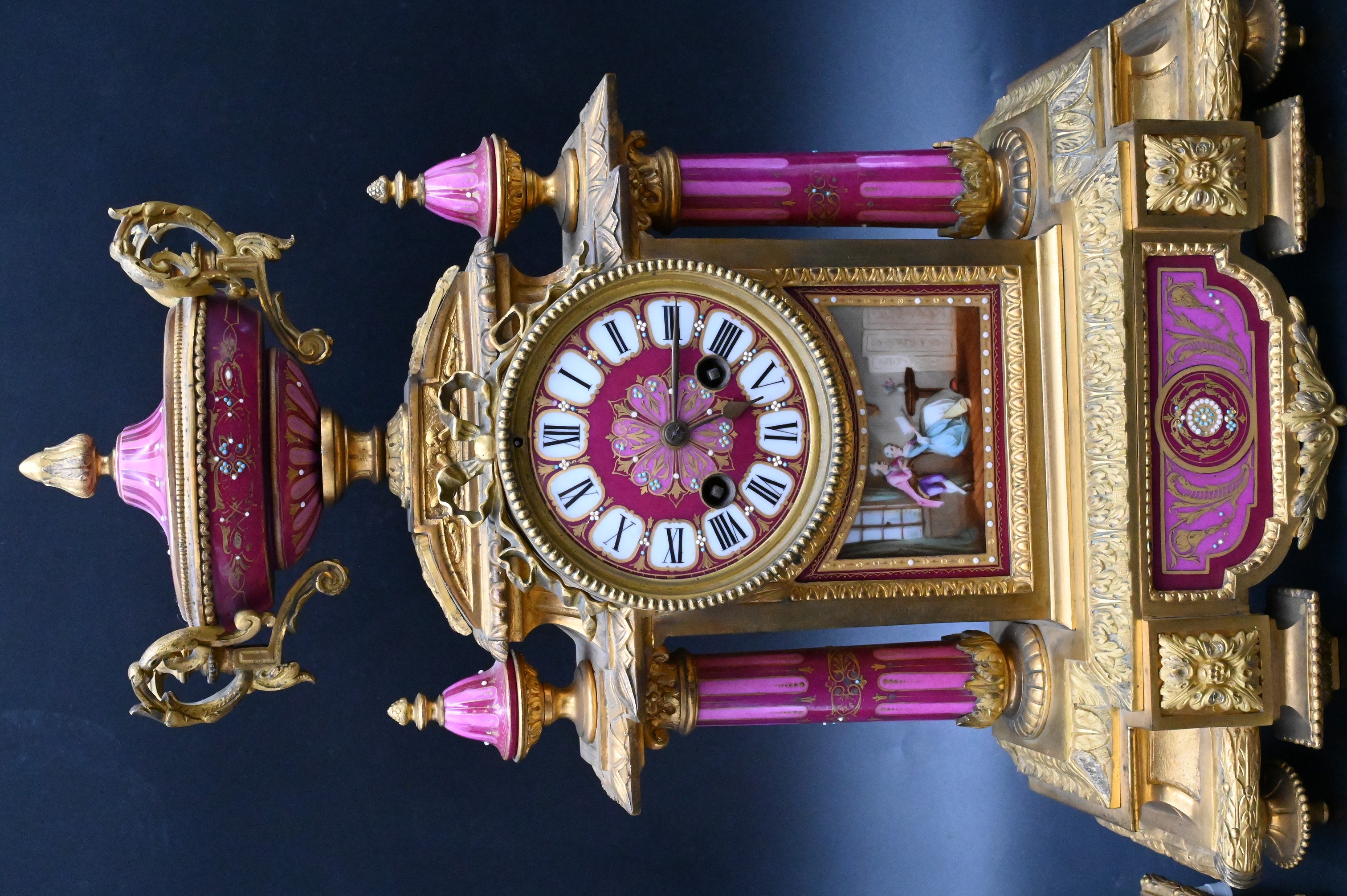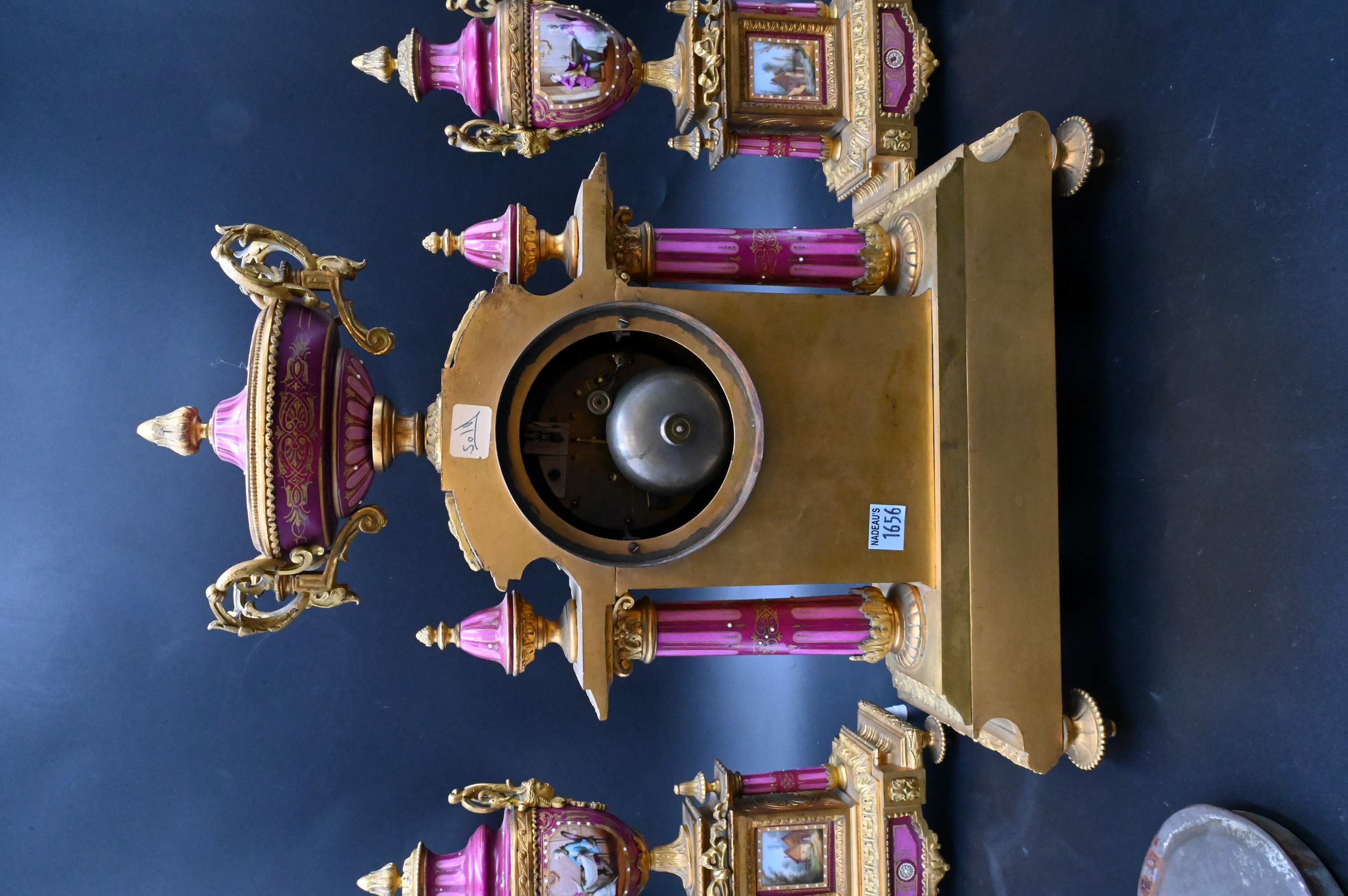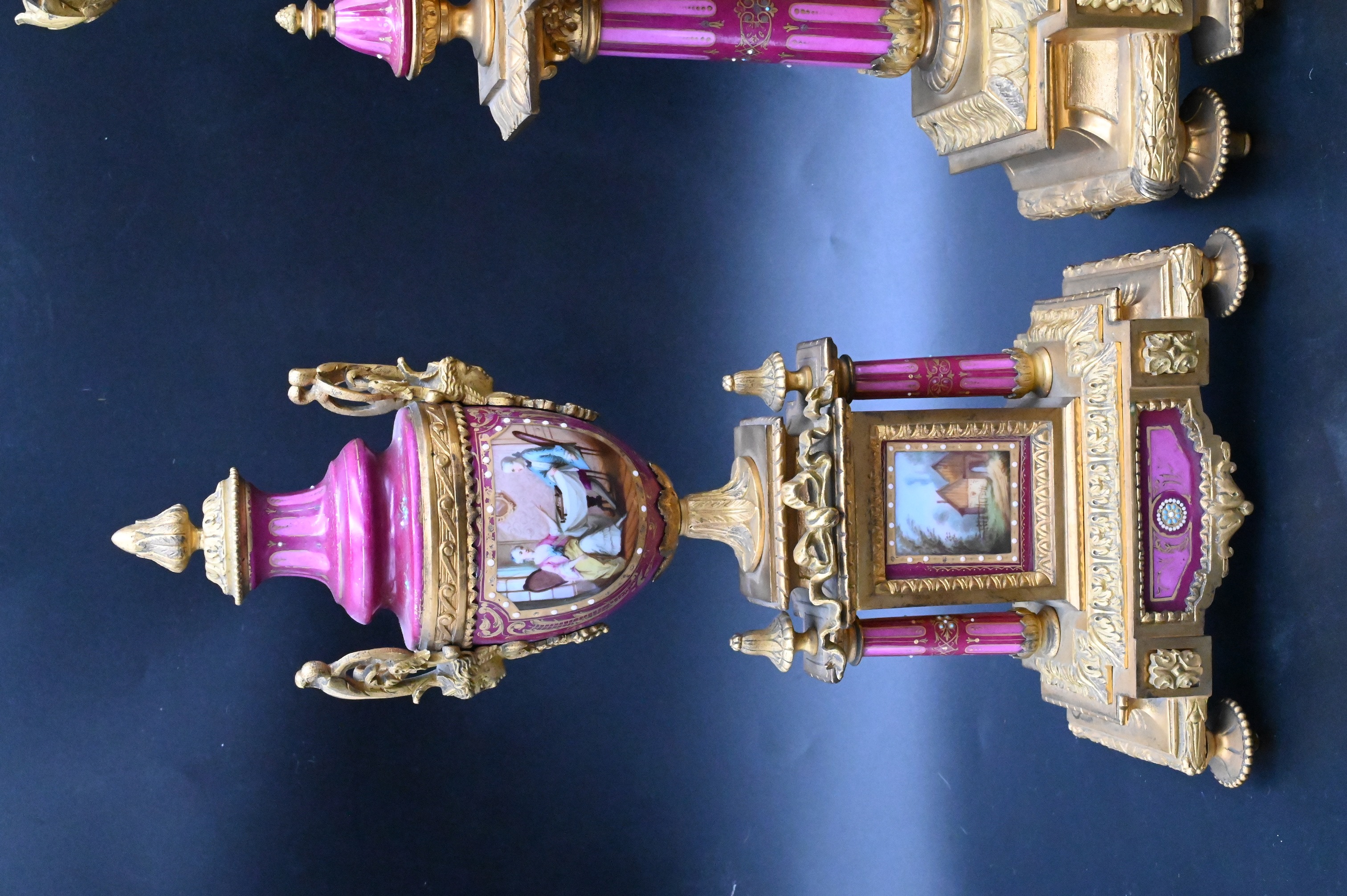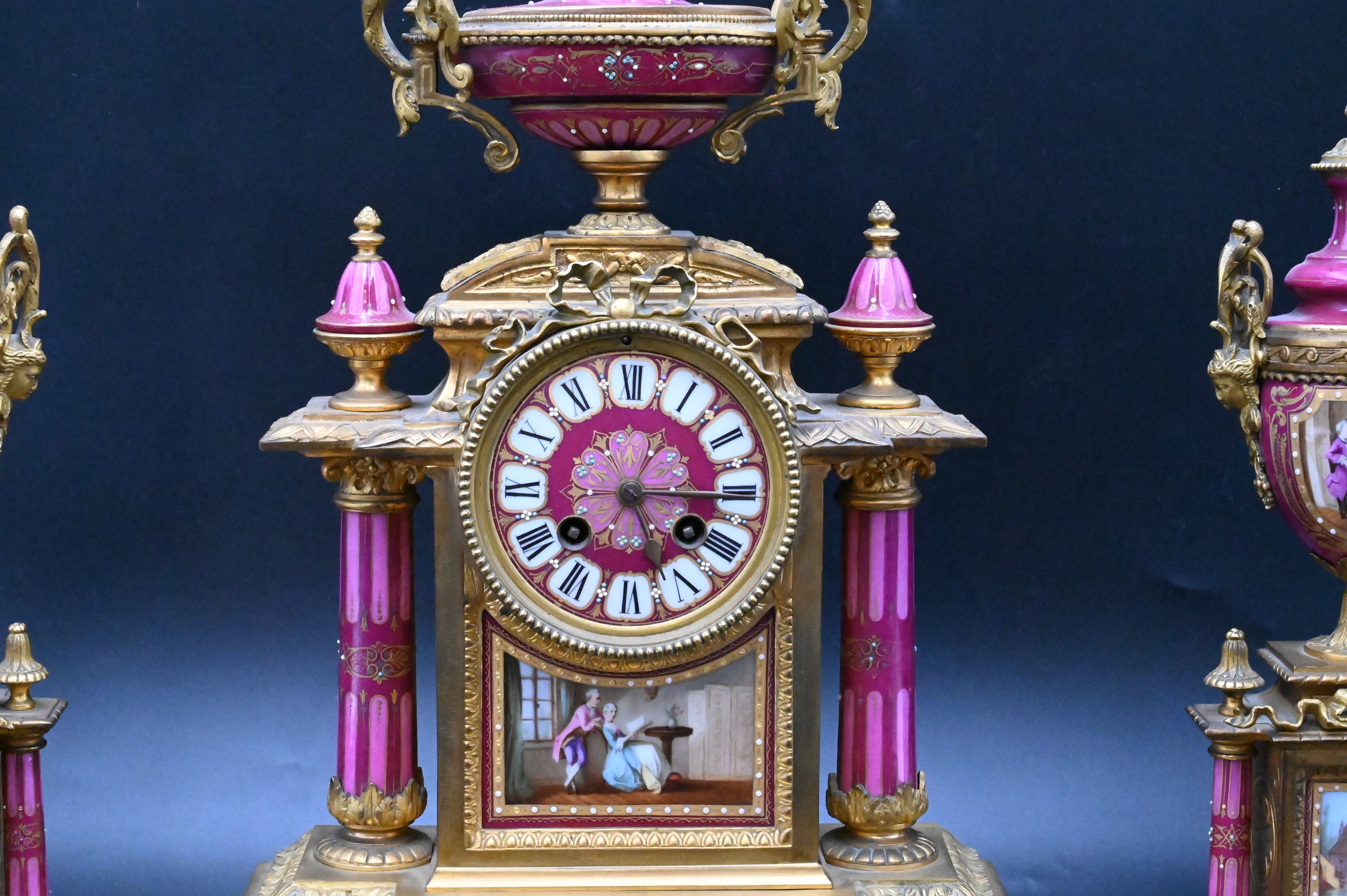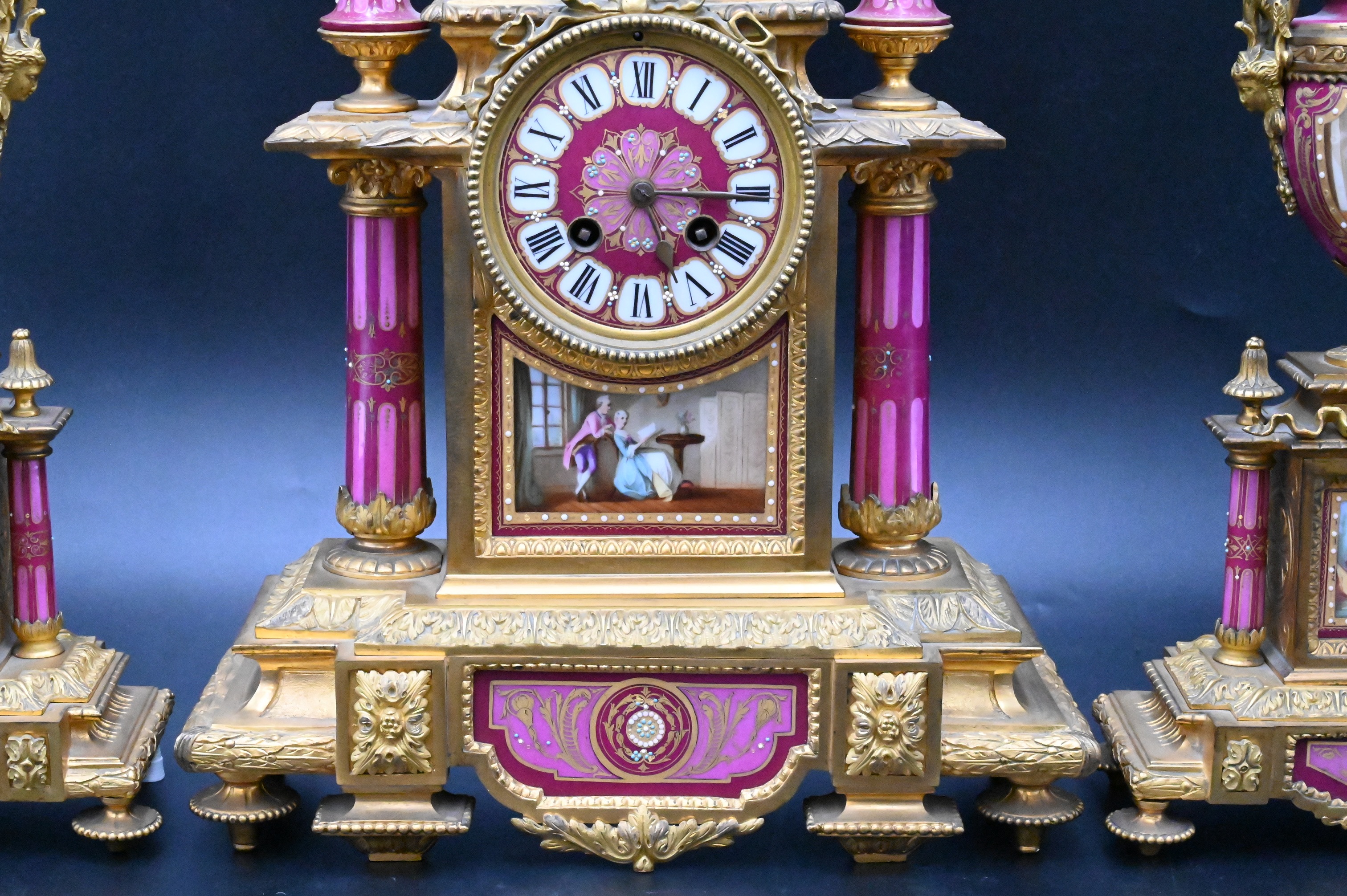 having ormolu mantel clock garniture with circular eight day striking movement stamped Japy Freres, hand painted plaque interior scene with figures, along with a pair of matching porcelain and gilt bronze urns