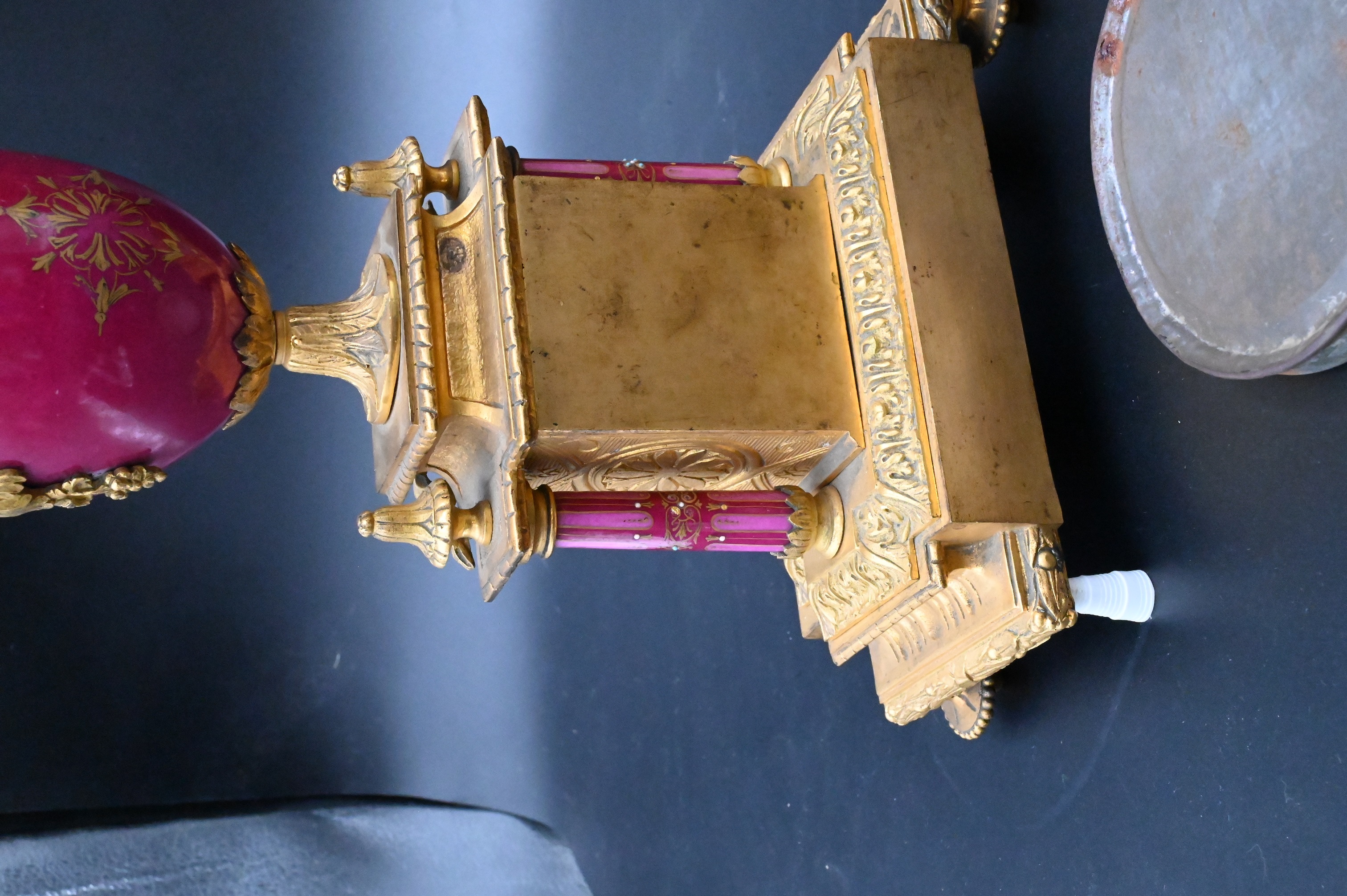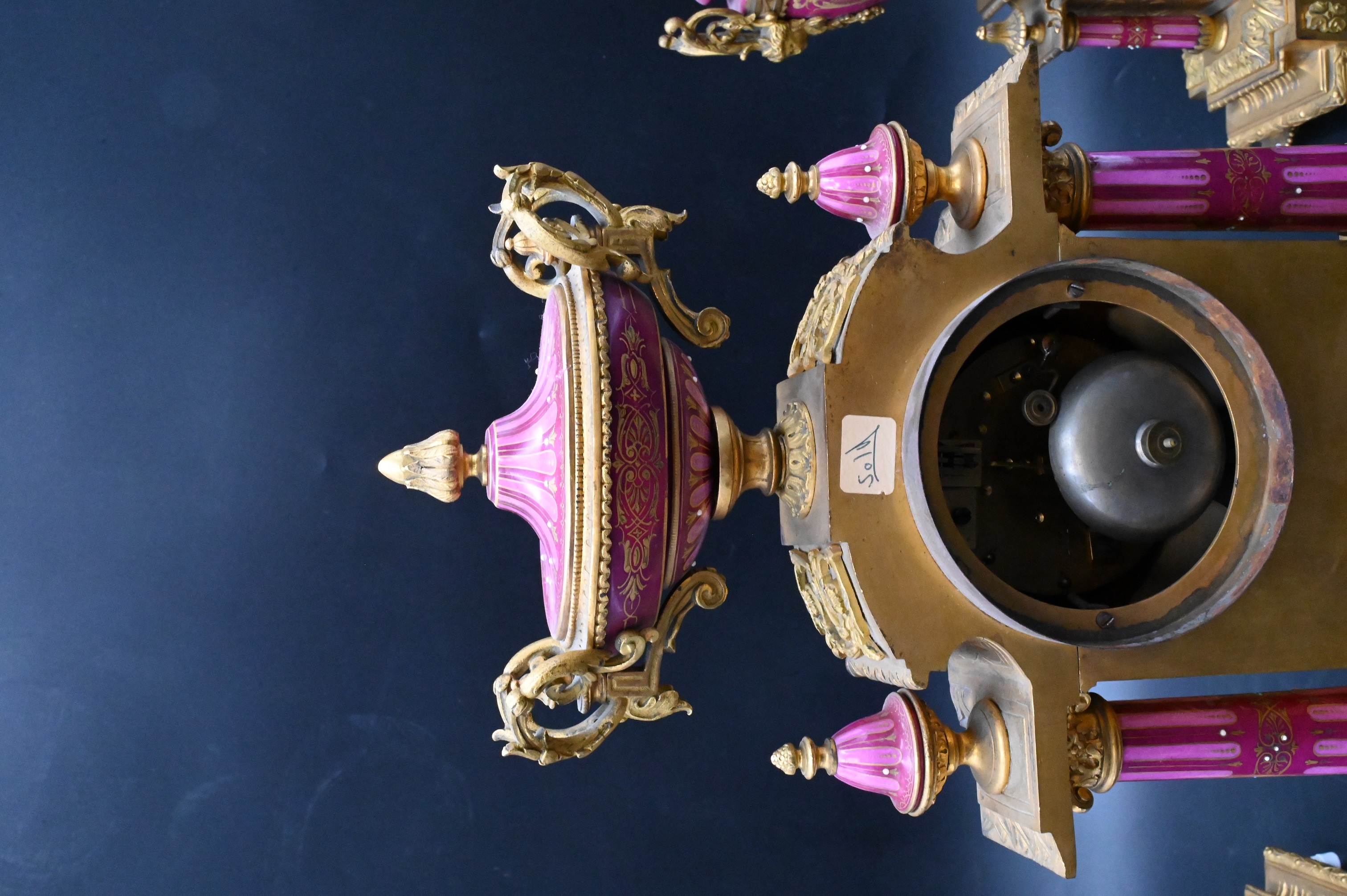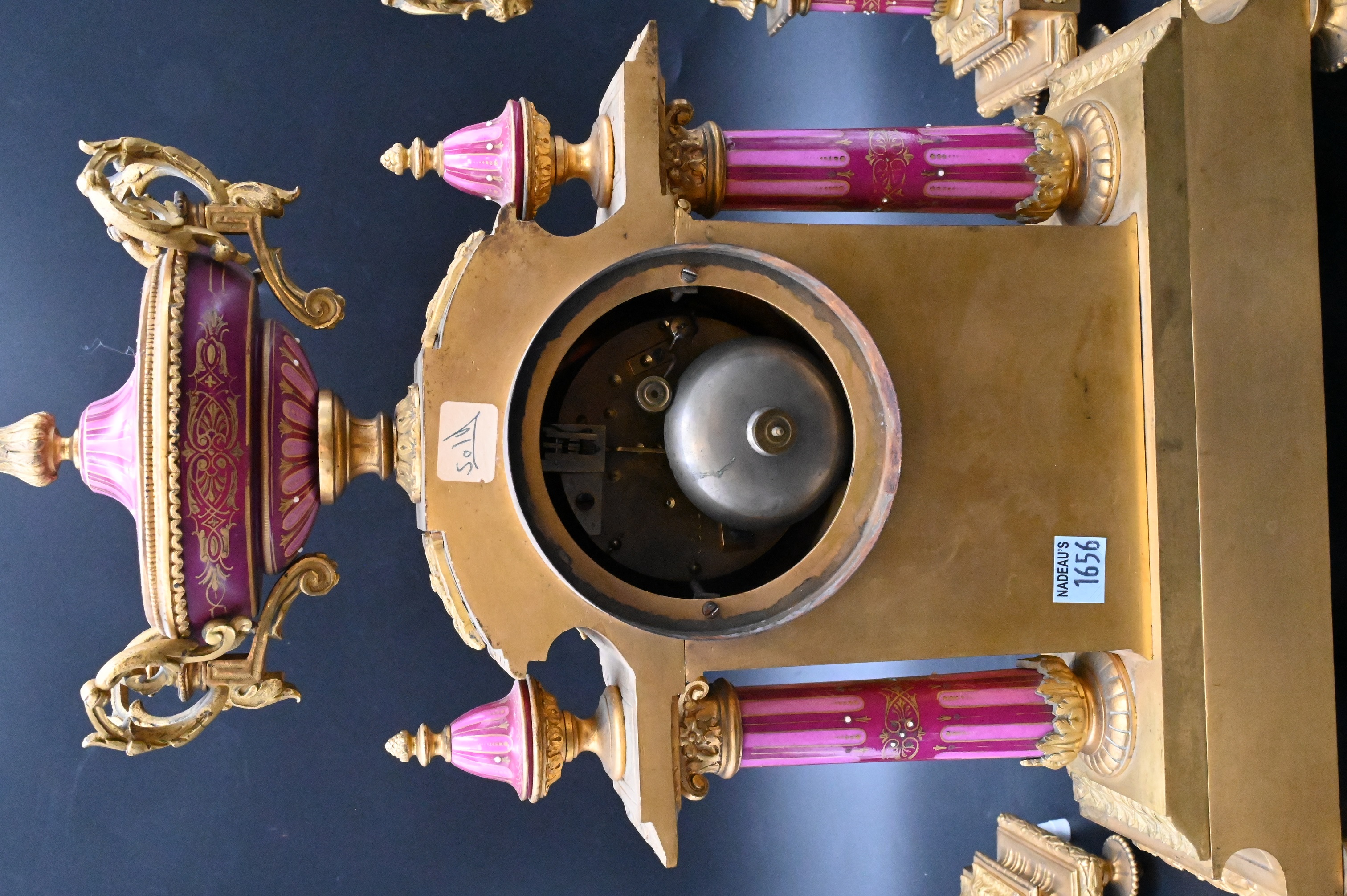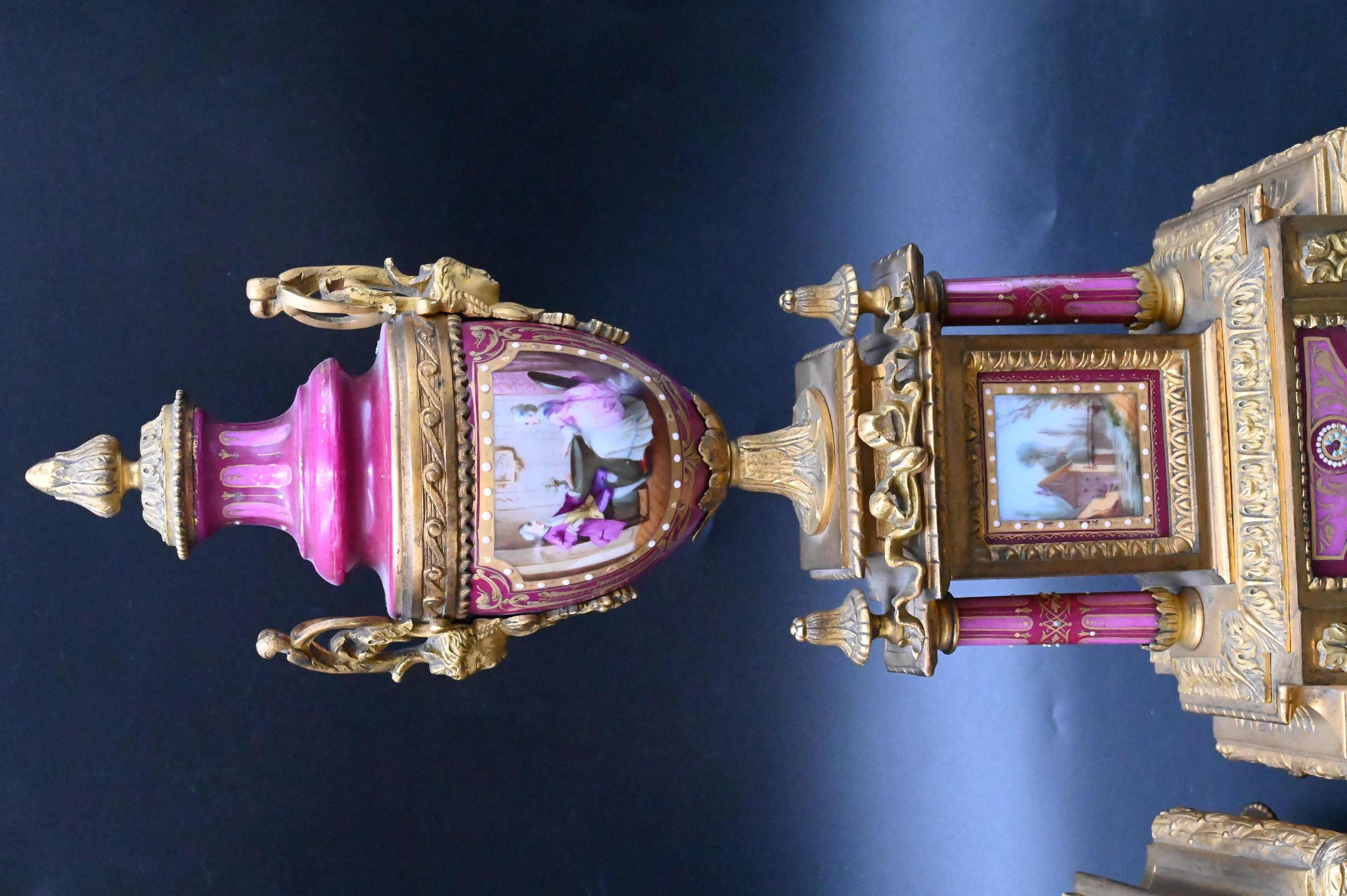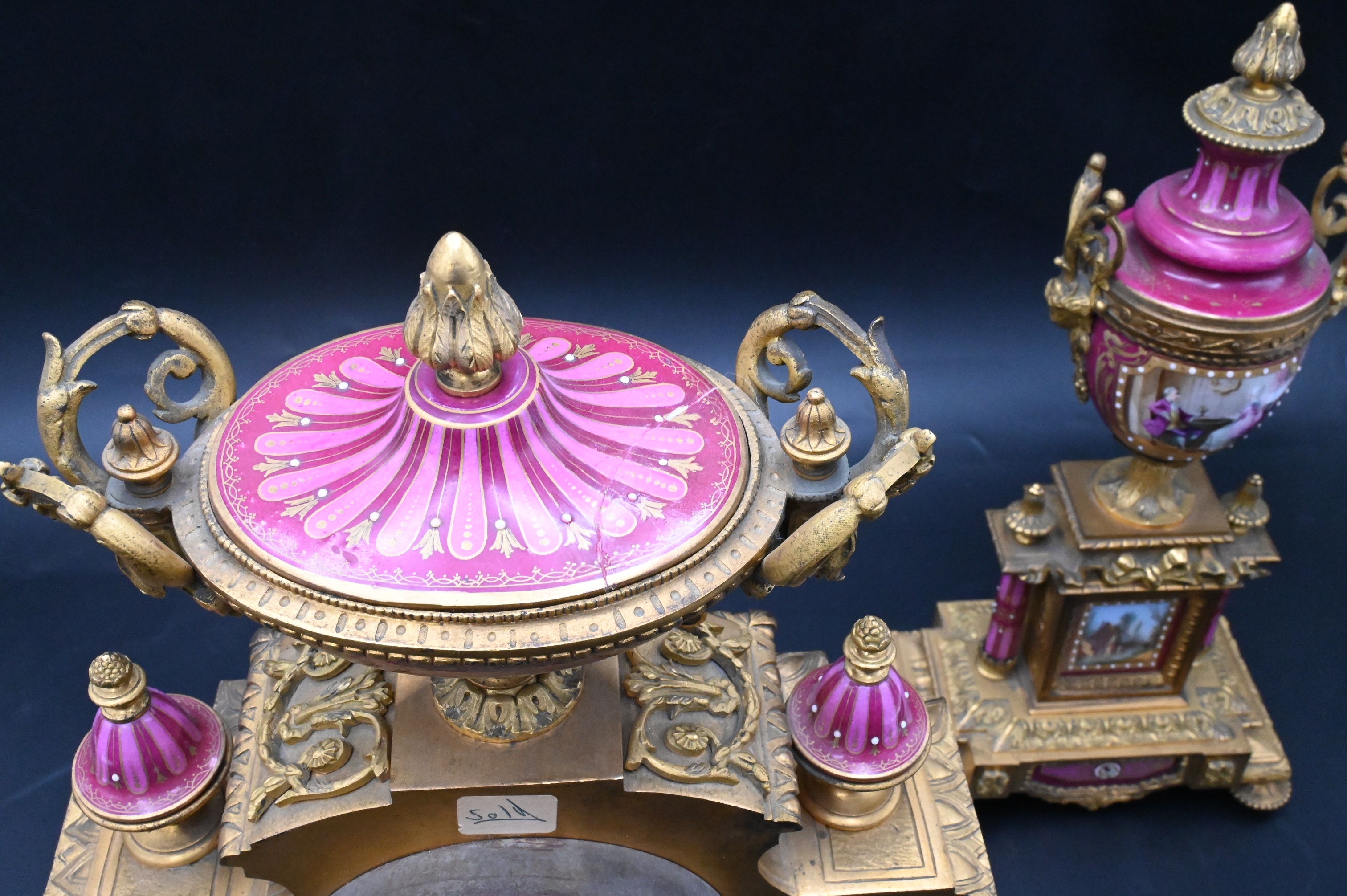 having ormolu mantel clock garniture with circular eight day striking movement stamped Japy Freres, hand painted plaque interior scene with figures, along with a pair of matching porcelain and gilt bronze urns