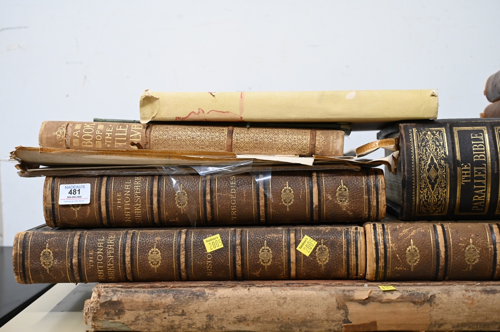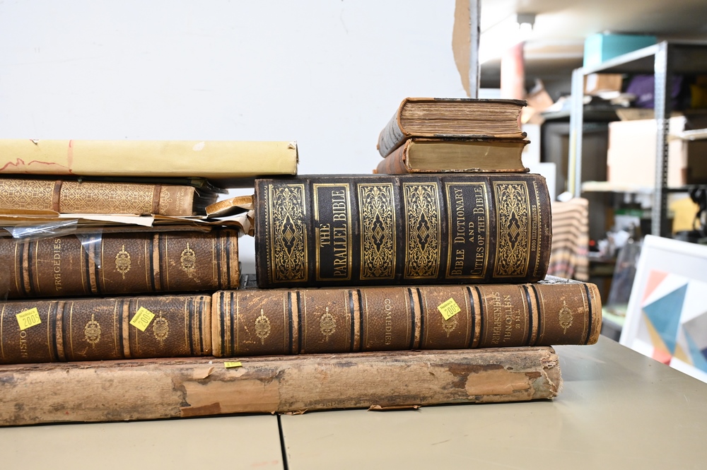 Lot 481: Large Group of Books, Engravings, and Etchings, to include Atlas of the Borough of Brooklyn, volume two by E. Belcher Hyde 1917; three volume set of The National Shakespeare; leather bound Holy Bible; book of the Tile CLVB; Boston Almanac 1842; along with engravings, etchings and prints.