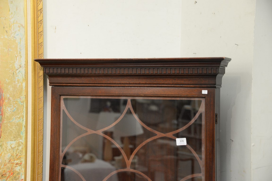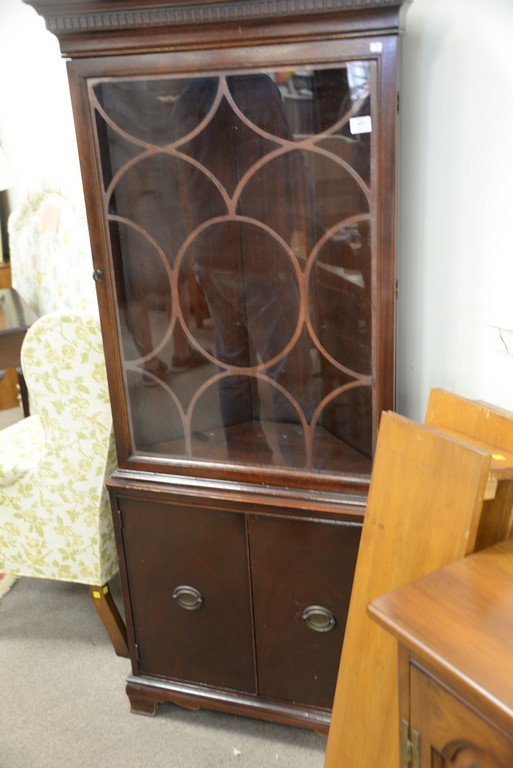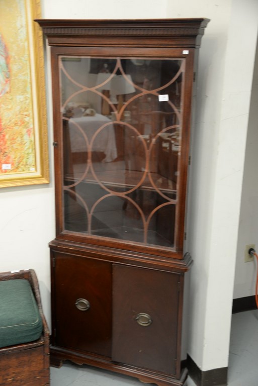 Mahogany corner china cabinet. ht. 68 in. wd. 30 in. dp. 15 in.