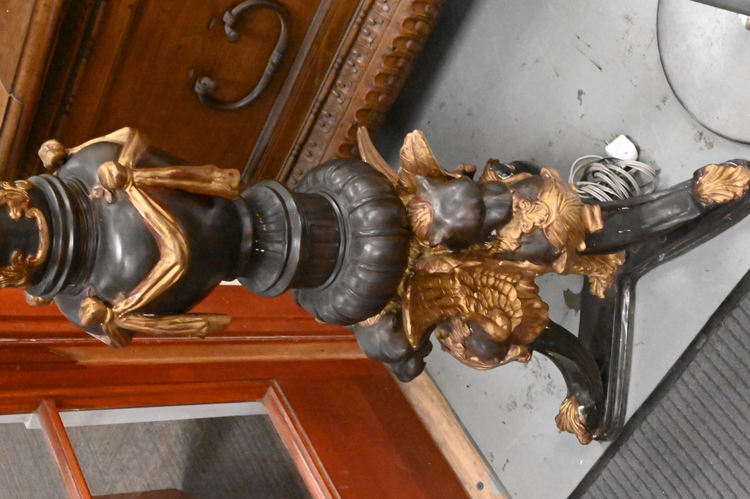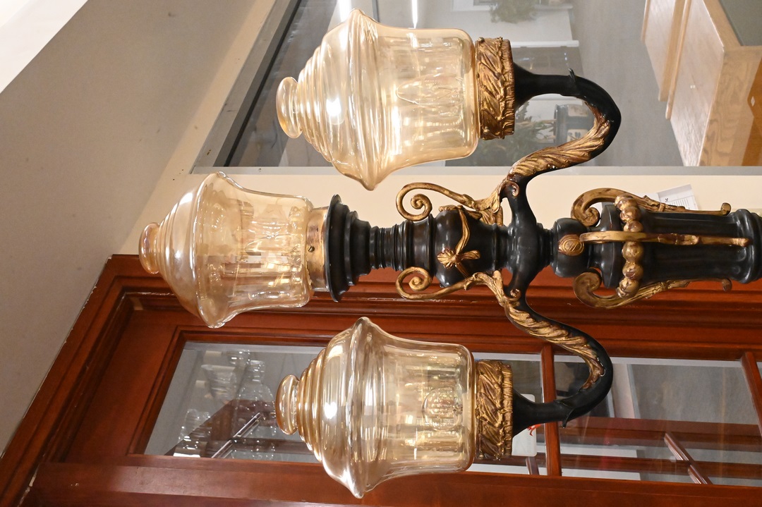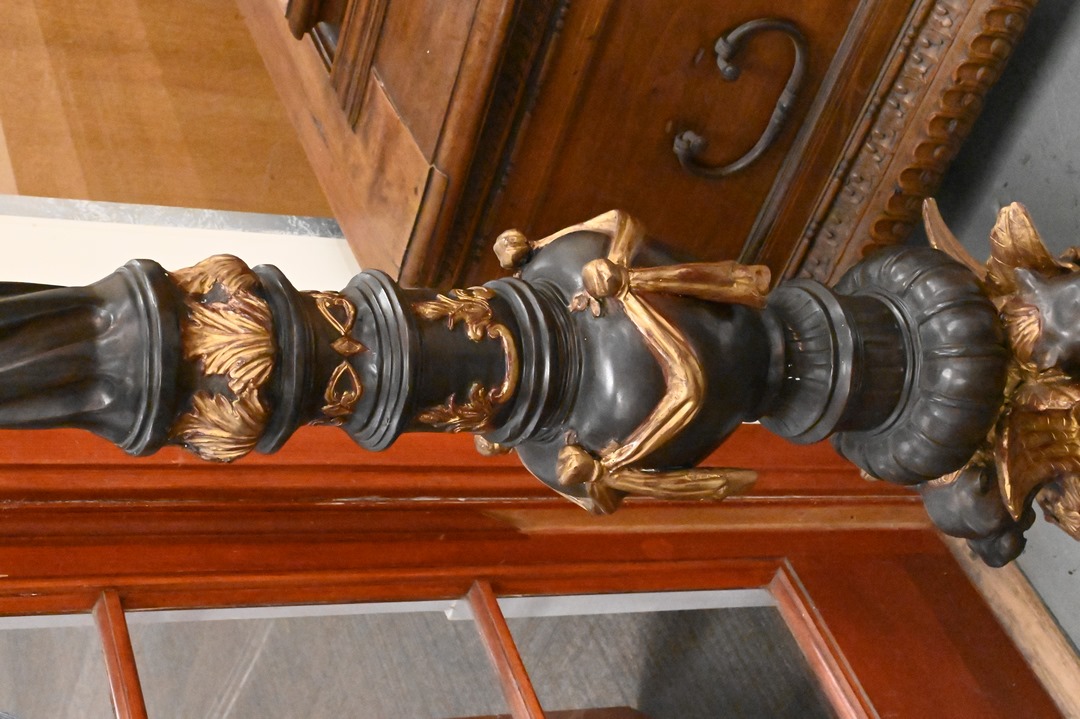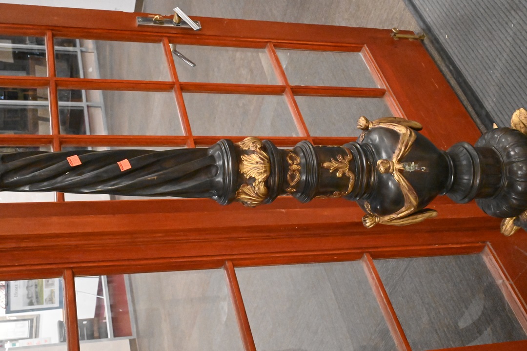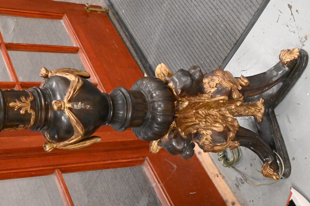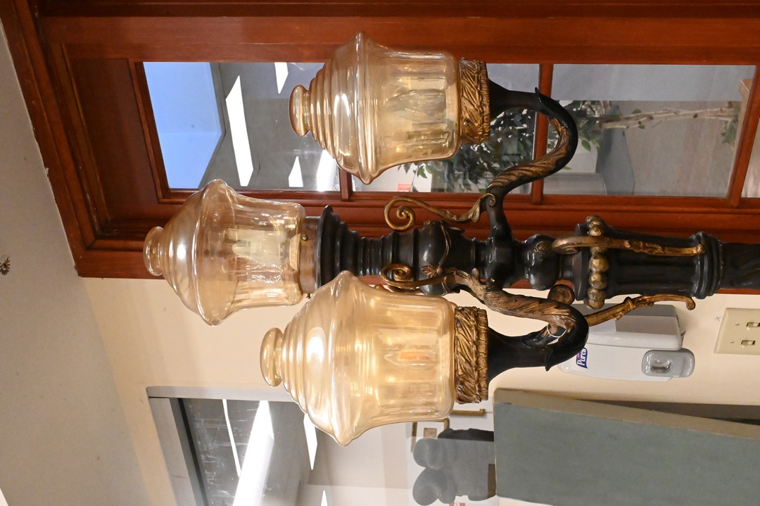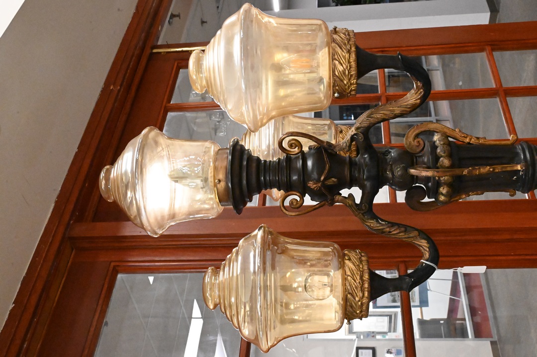 Pair of Bronze Outdoor Lights each having four lights with glass shades (one missing) twist columnar support with triple lion base height 88 inches
