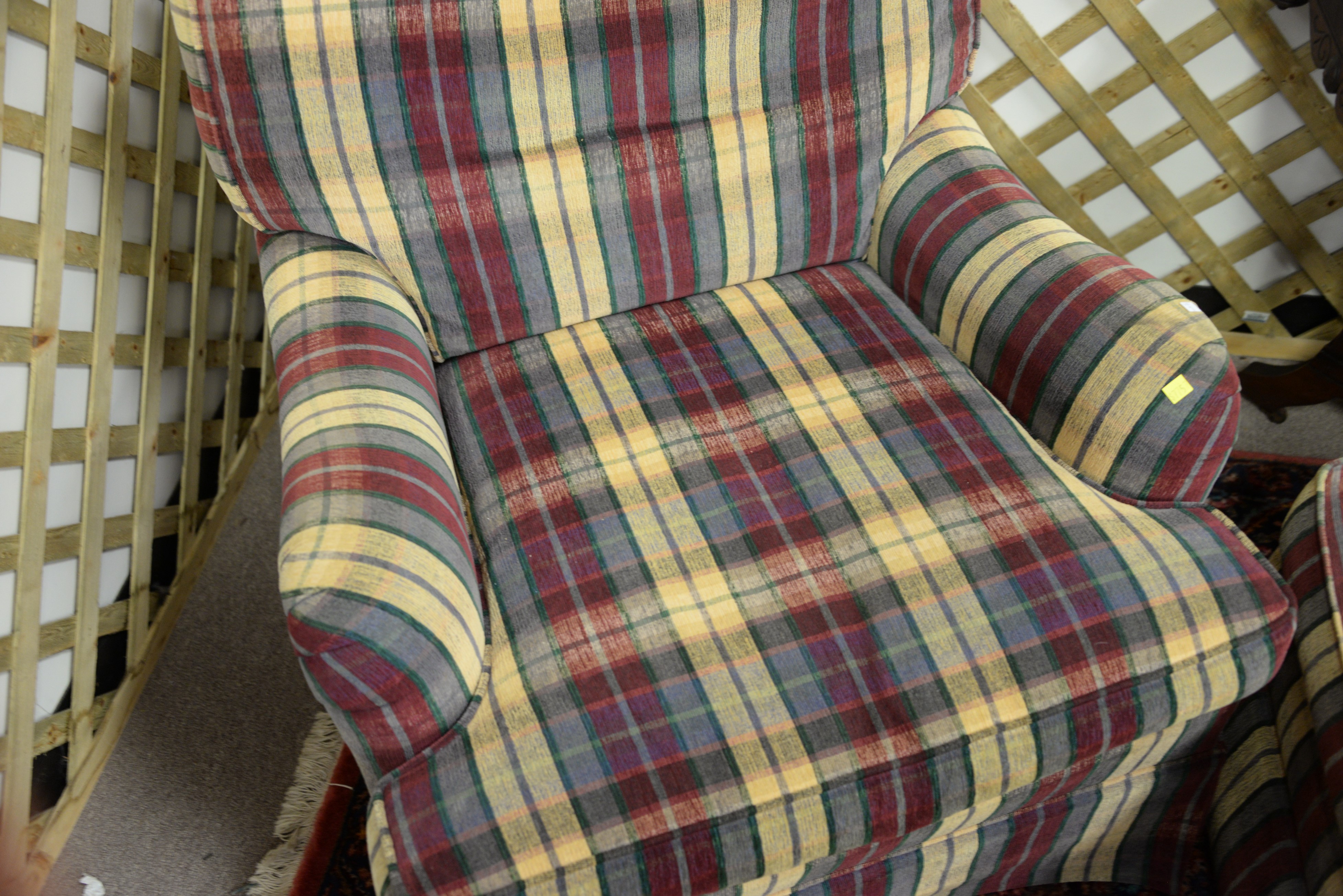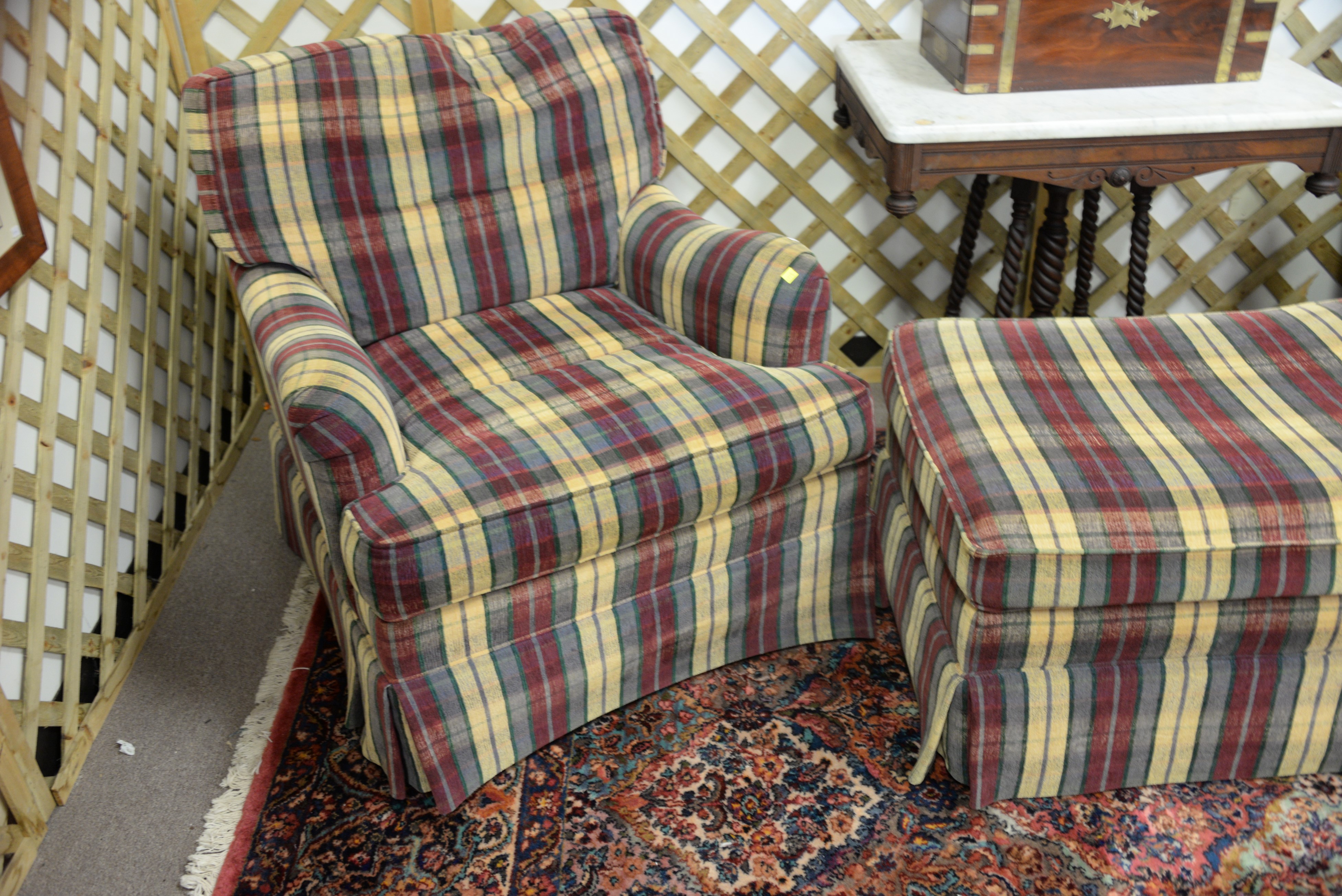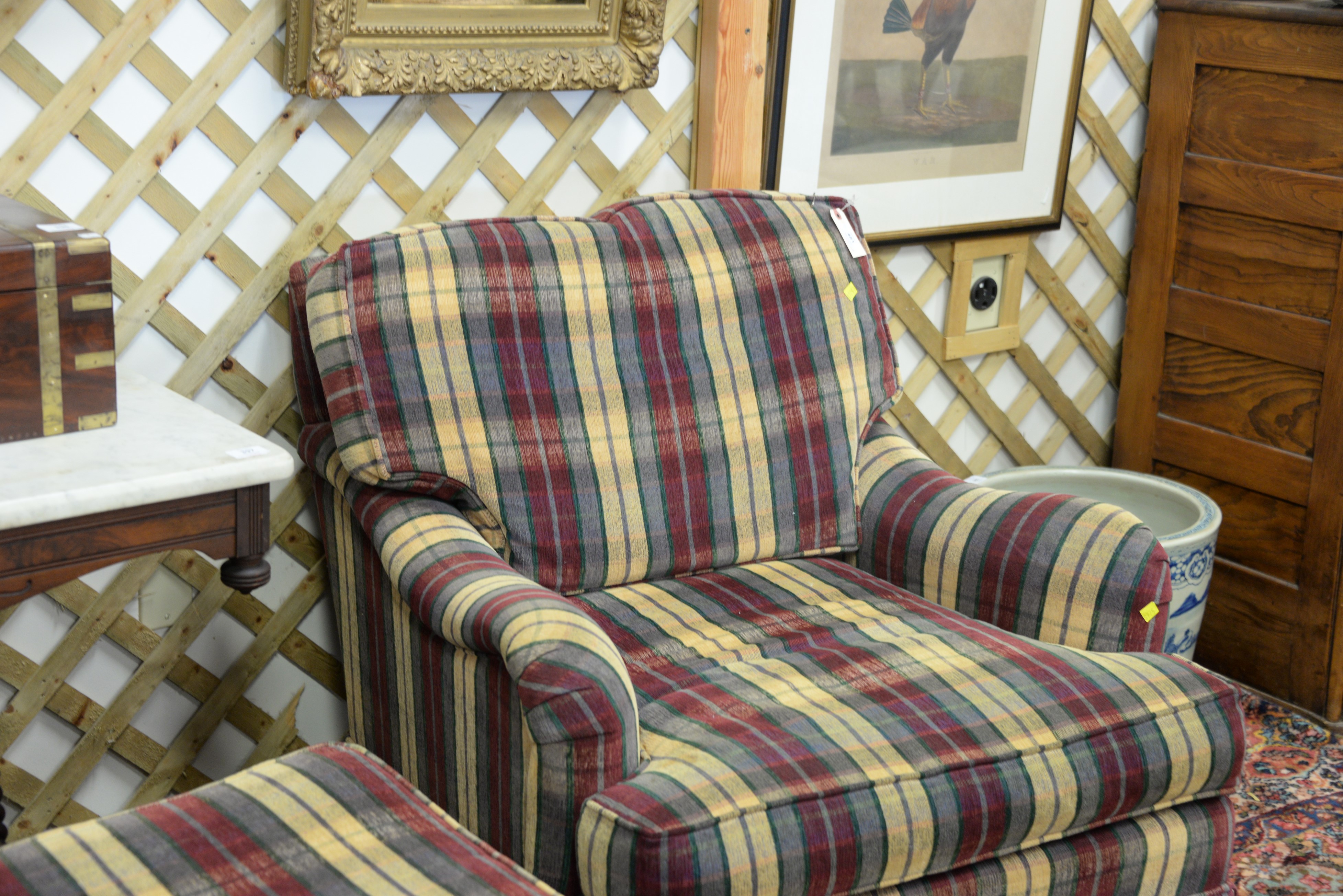 Pair of Henredon upholstered easy chairs with one ottoman, Custom Folio Collection.