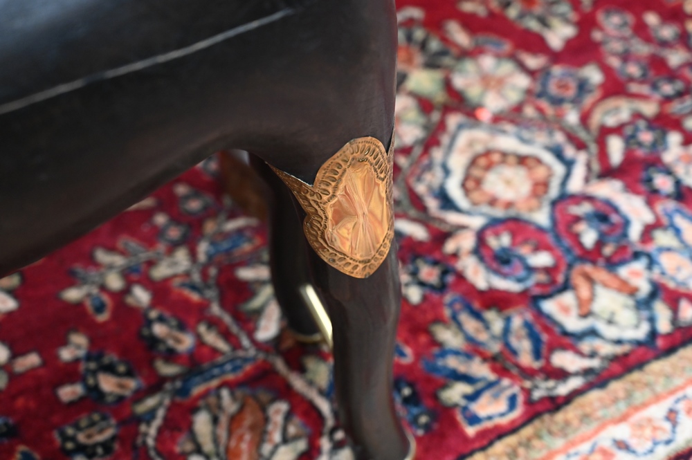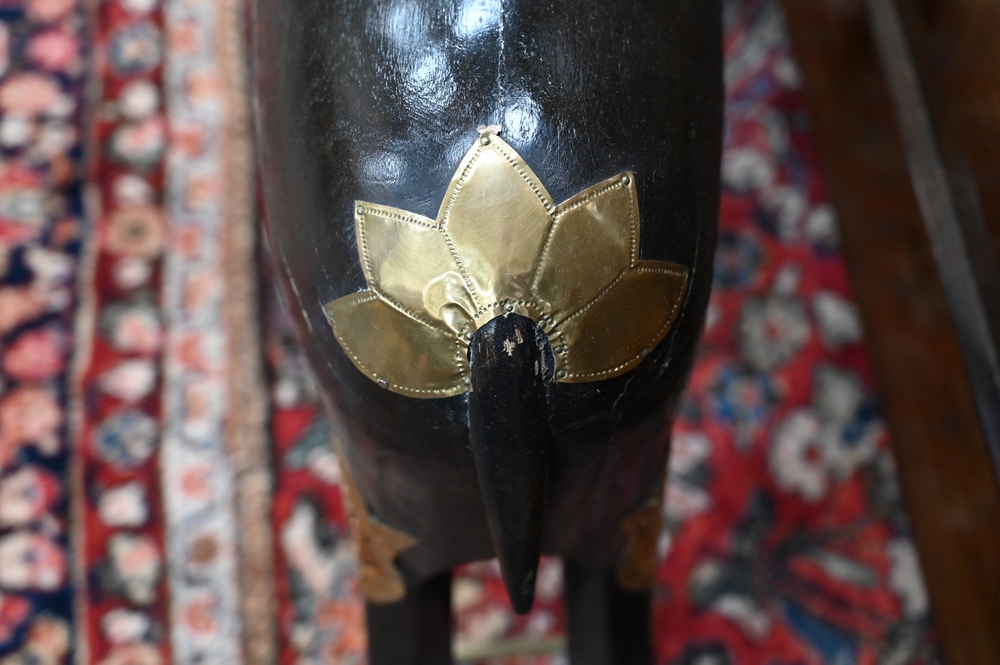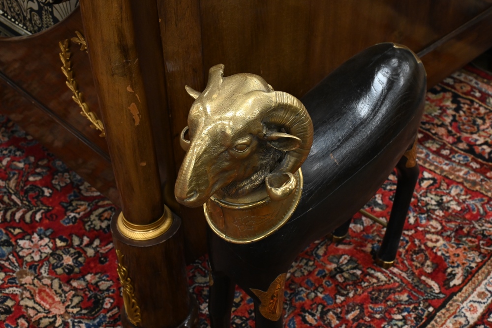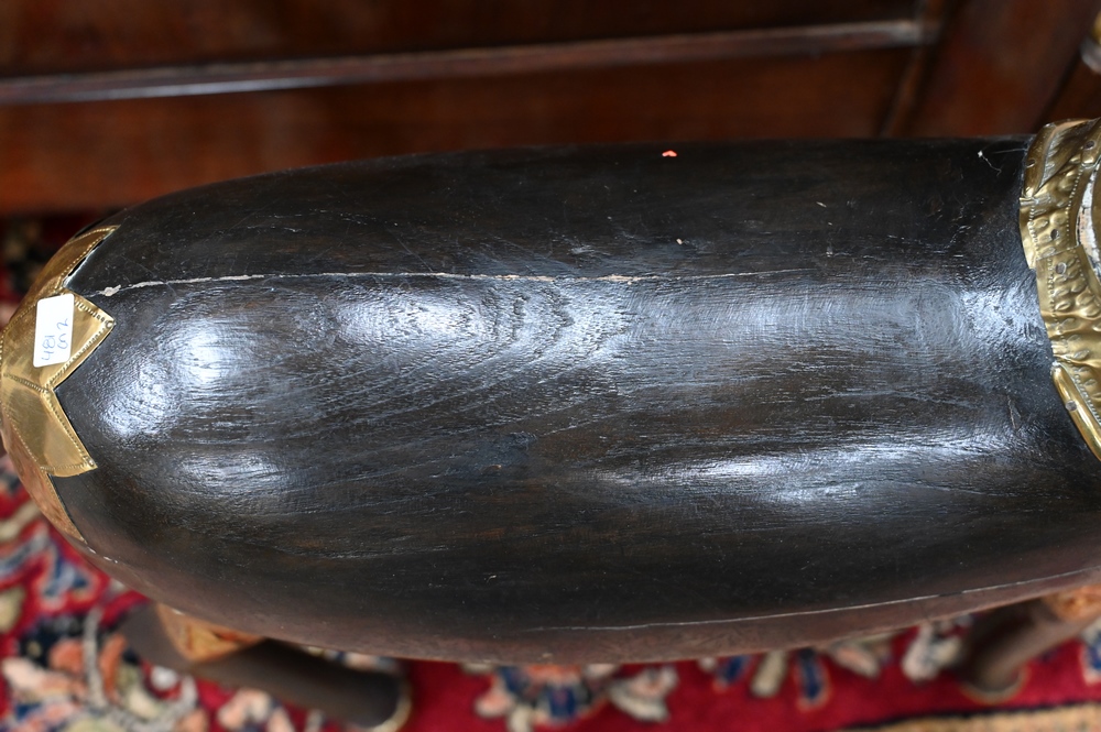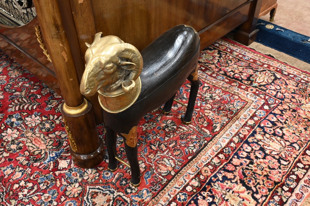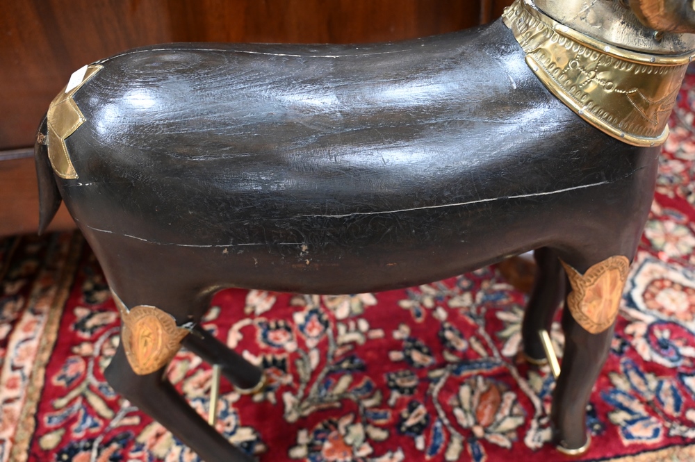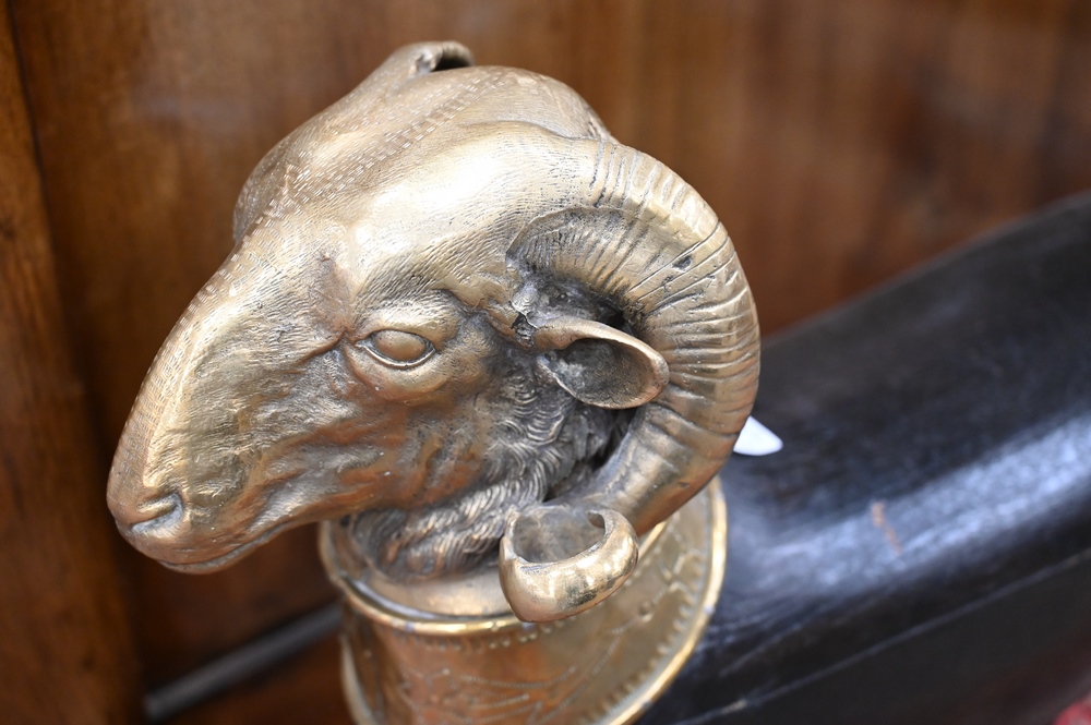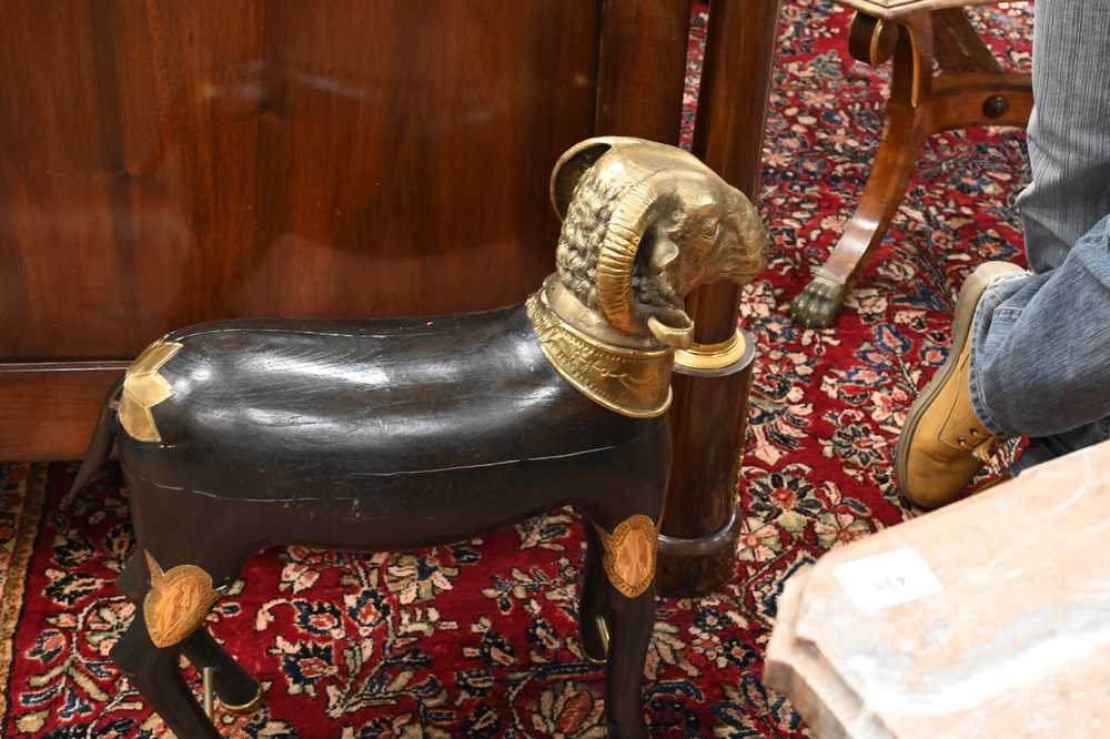Lot 481: Pair of Large Brass and Wood Ram Figures, having heavy brass rams head mounted on carved wood body, mounted with brass plaques and f…