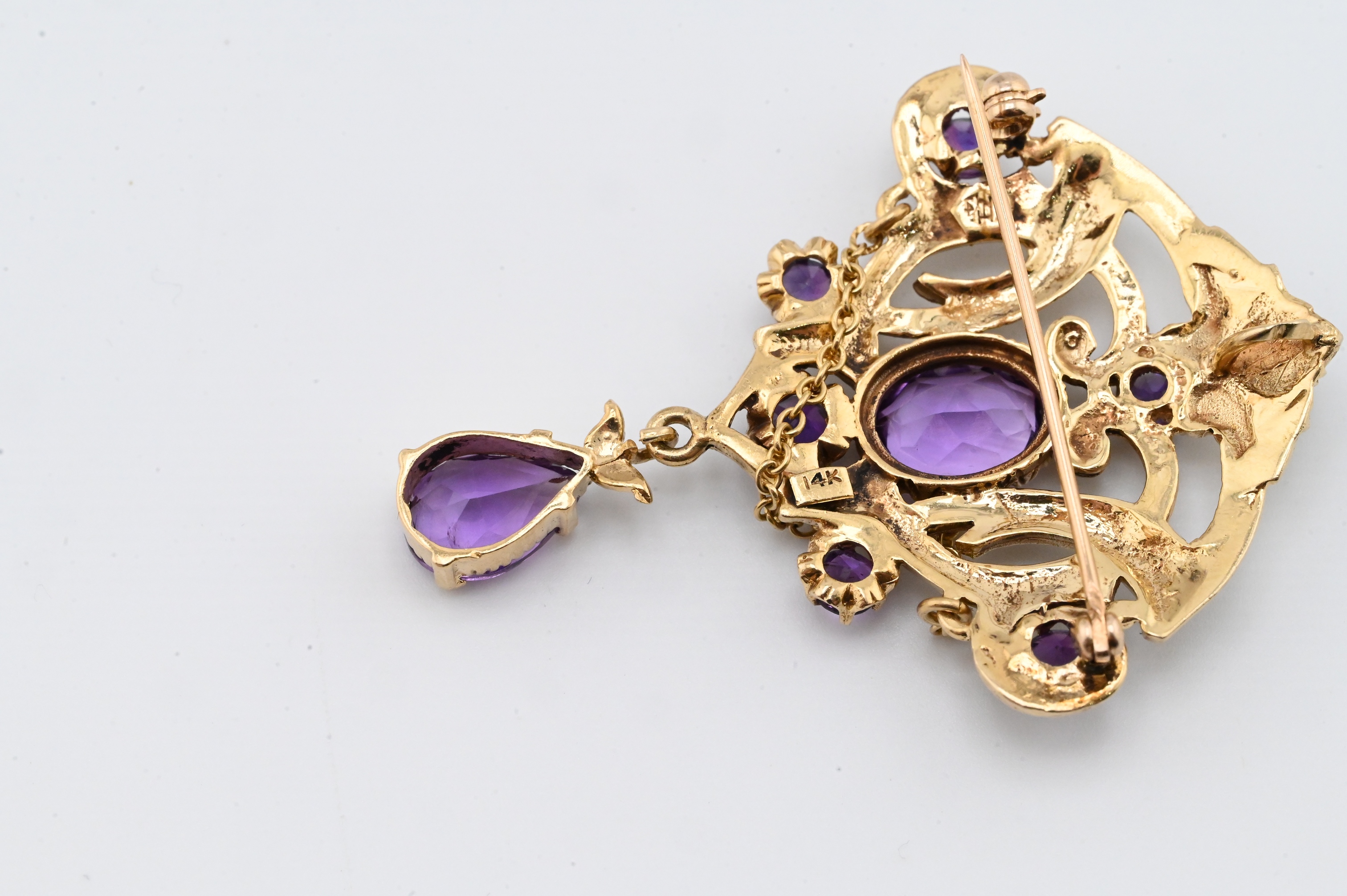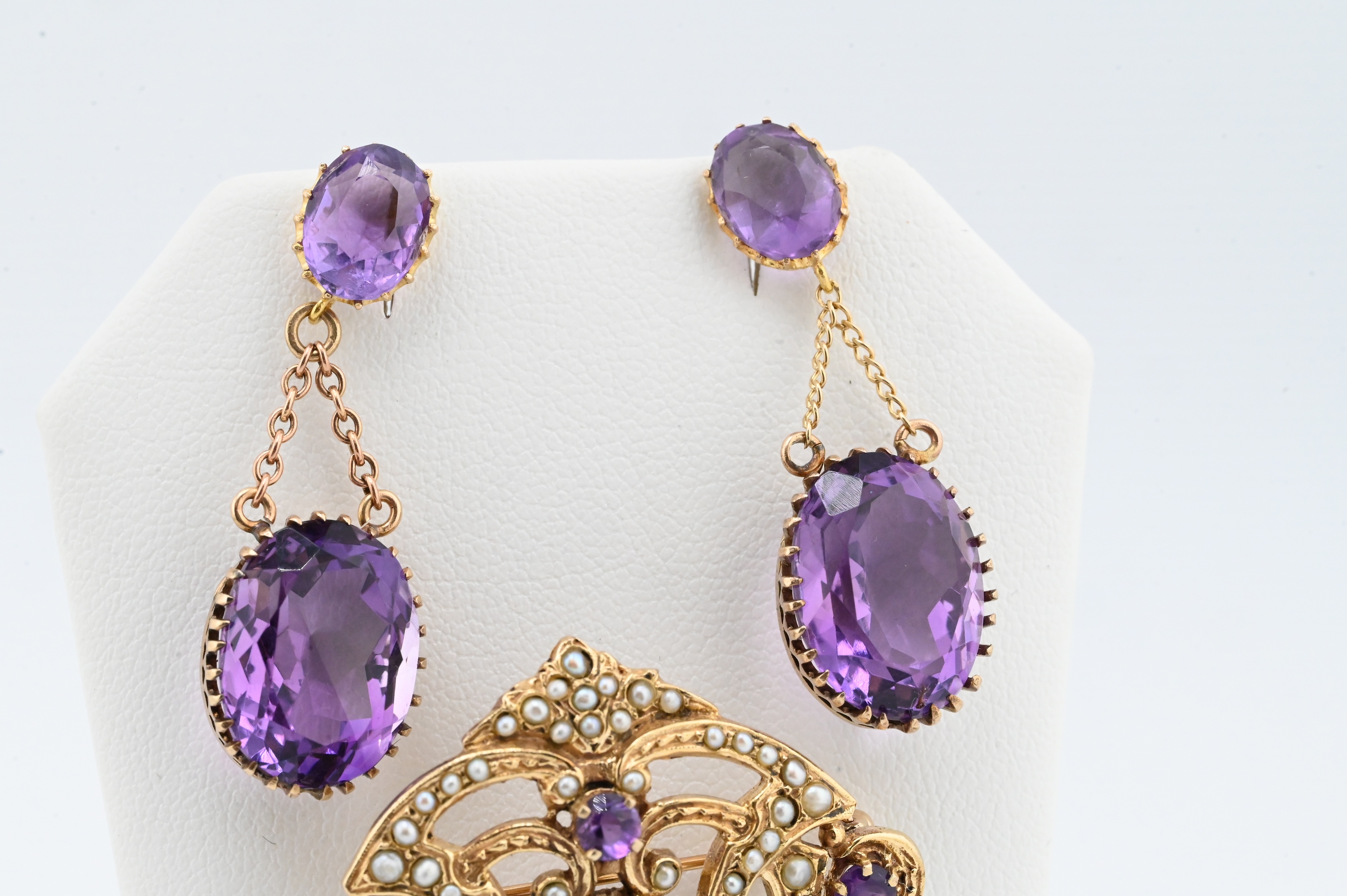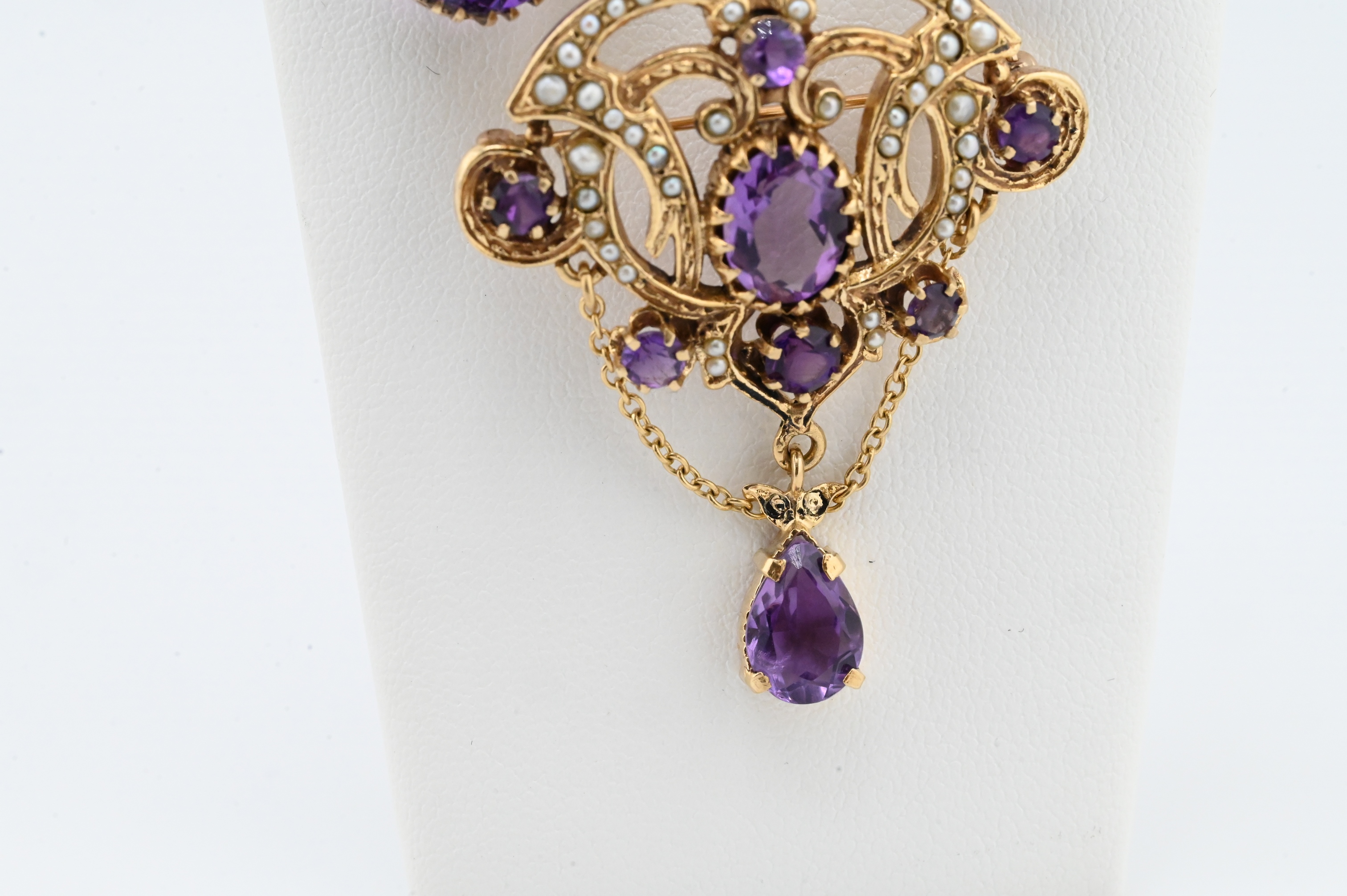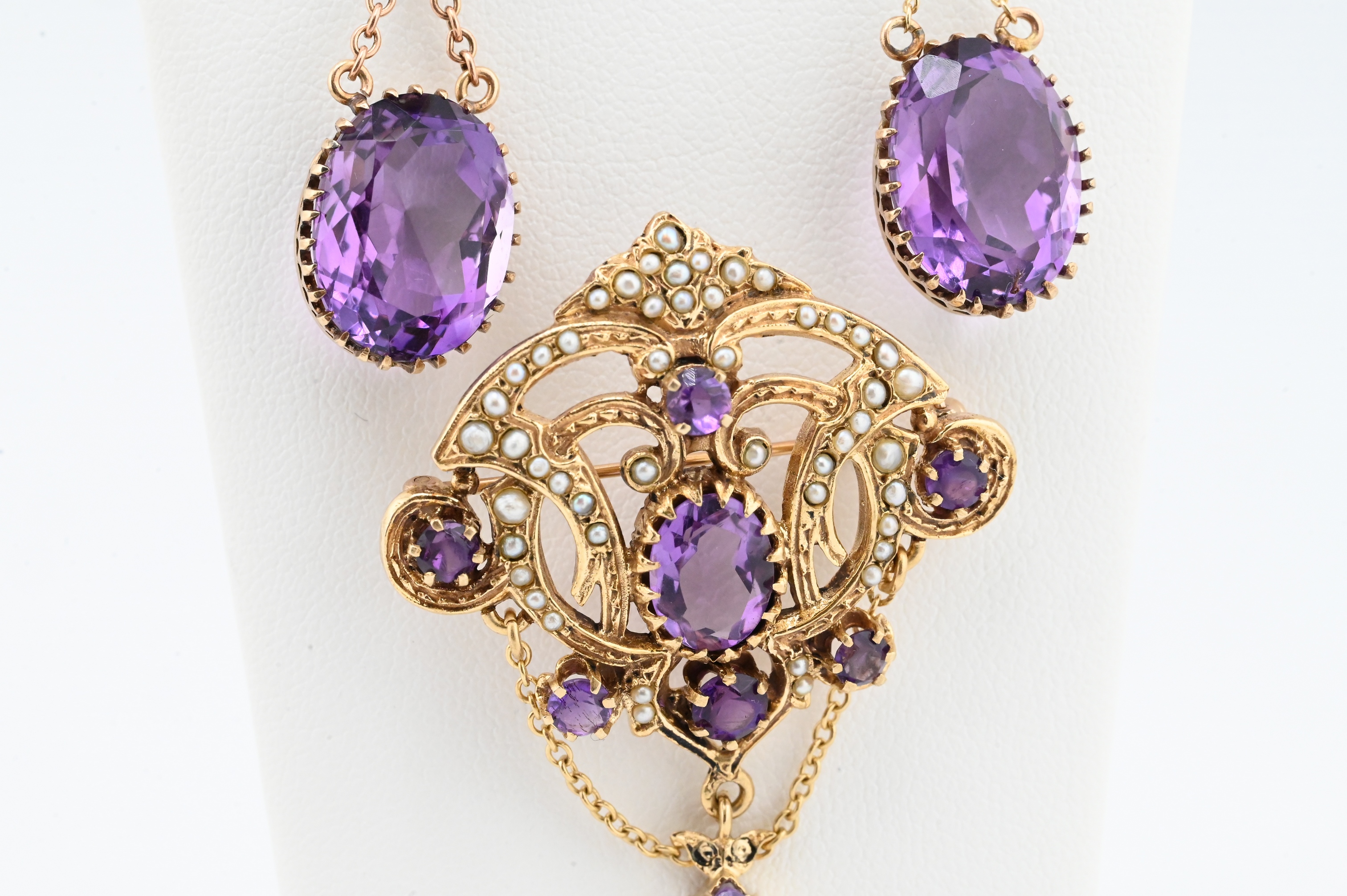 vintage, marked 14K, maker’s mark “A.”, ornate open-work pendant set with multiple faceted amethysts of varying sizes and accented throughout with seed pearls, accompanied by a matching pair of amethyst drop earrings