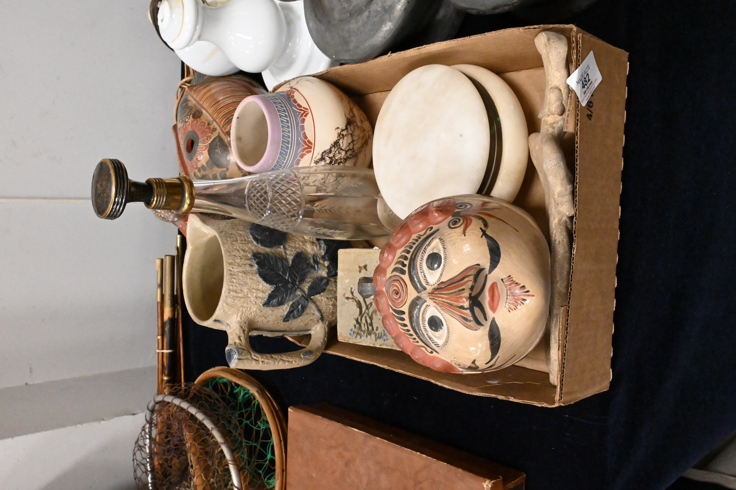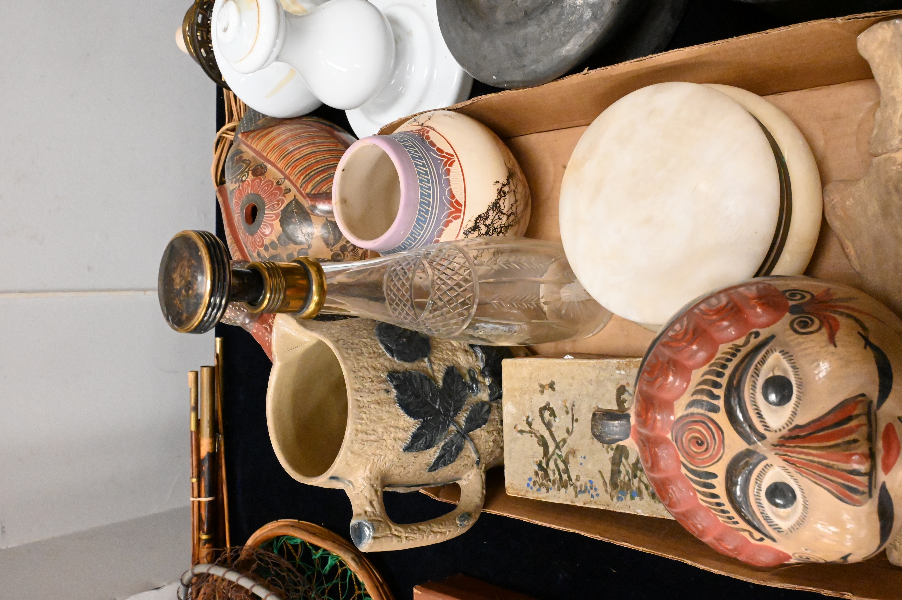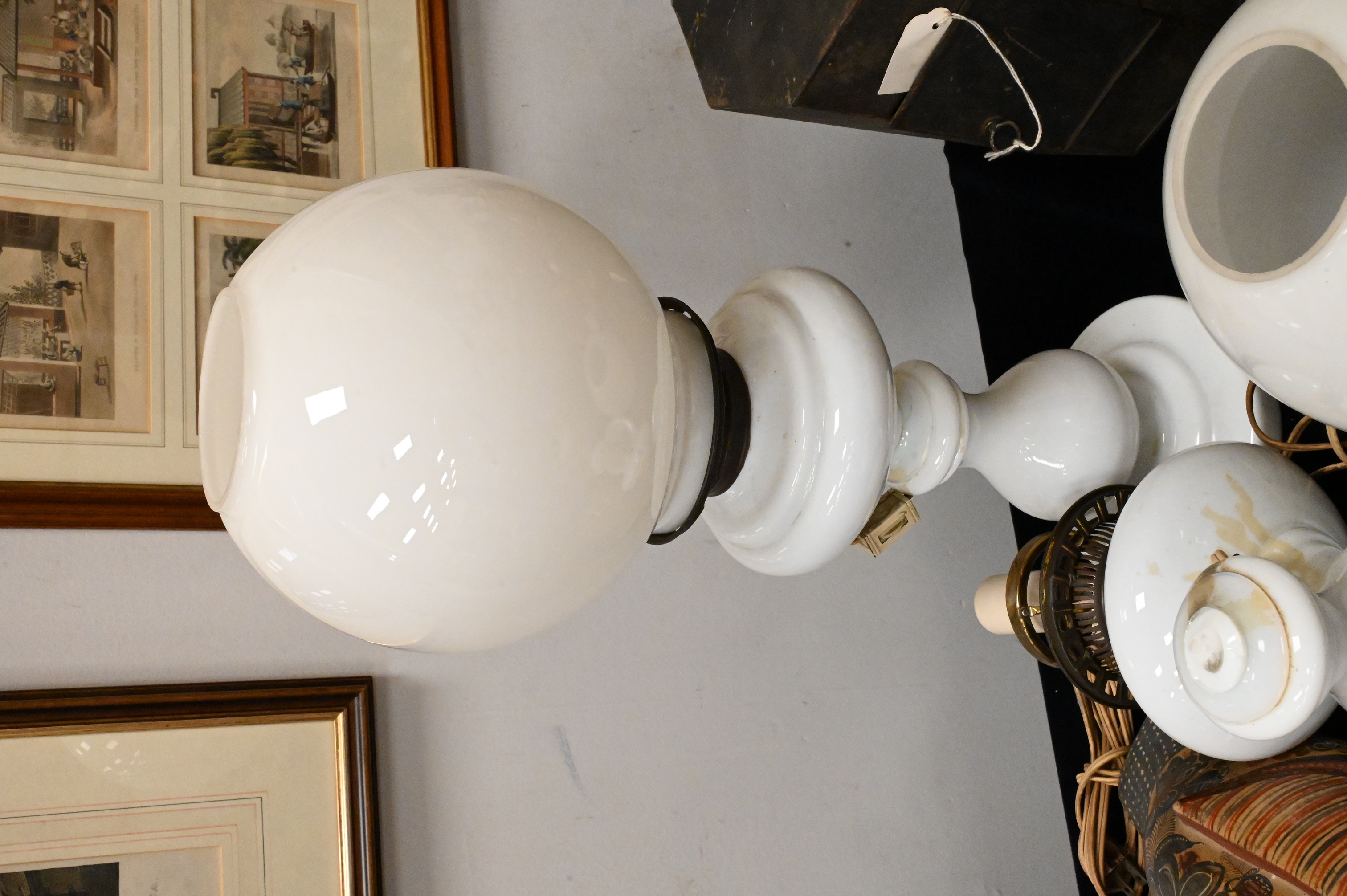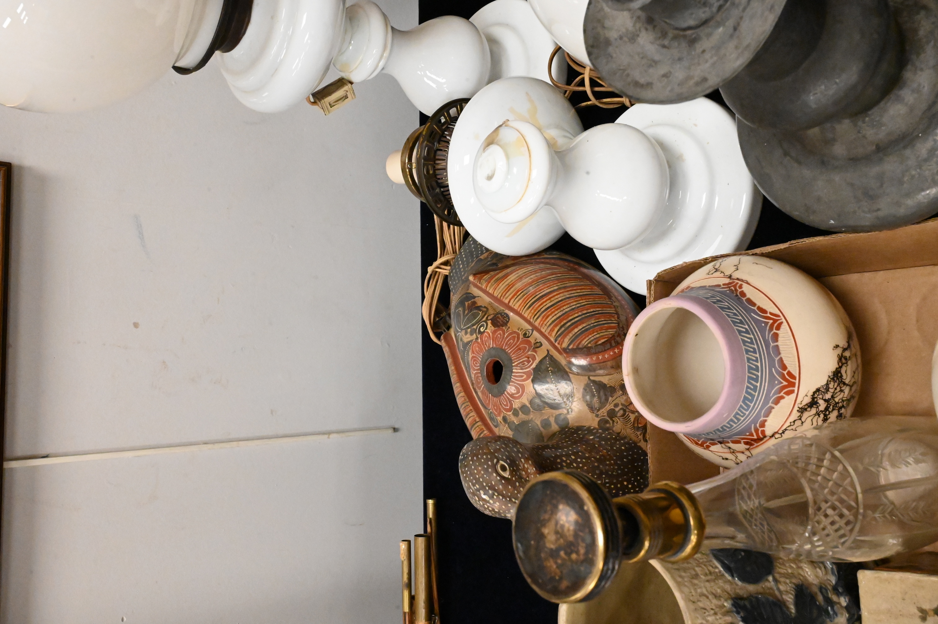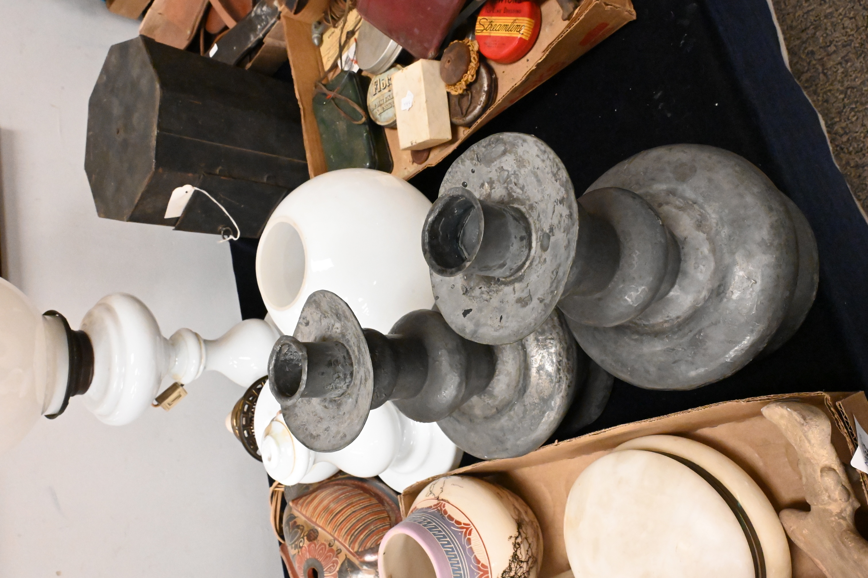 to include pair of milk glass lamps with globe shades, pair of pewter candlesticks, stoneware leaf jug, etc.