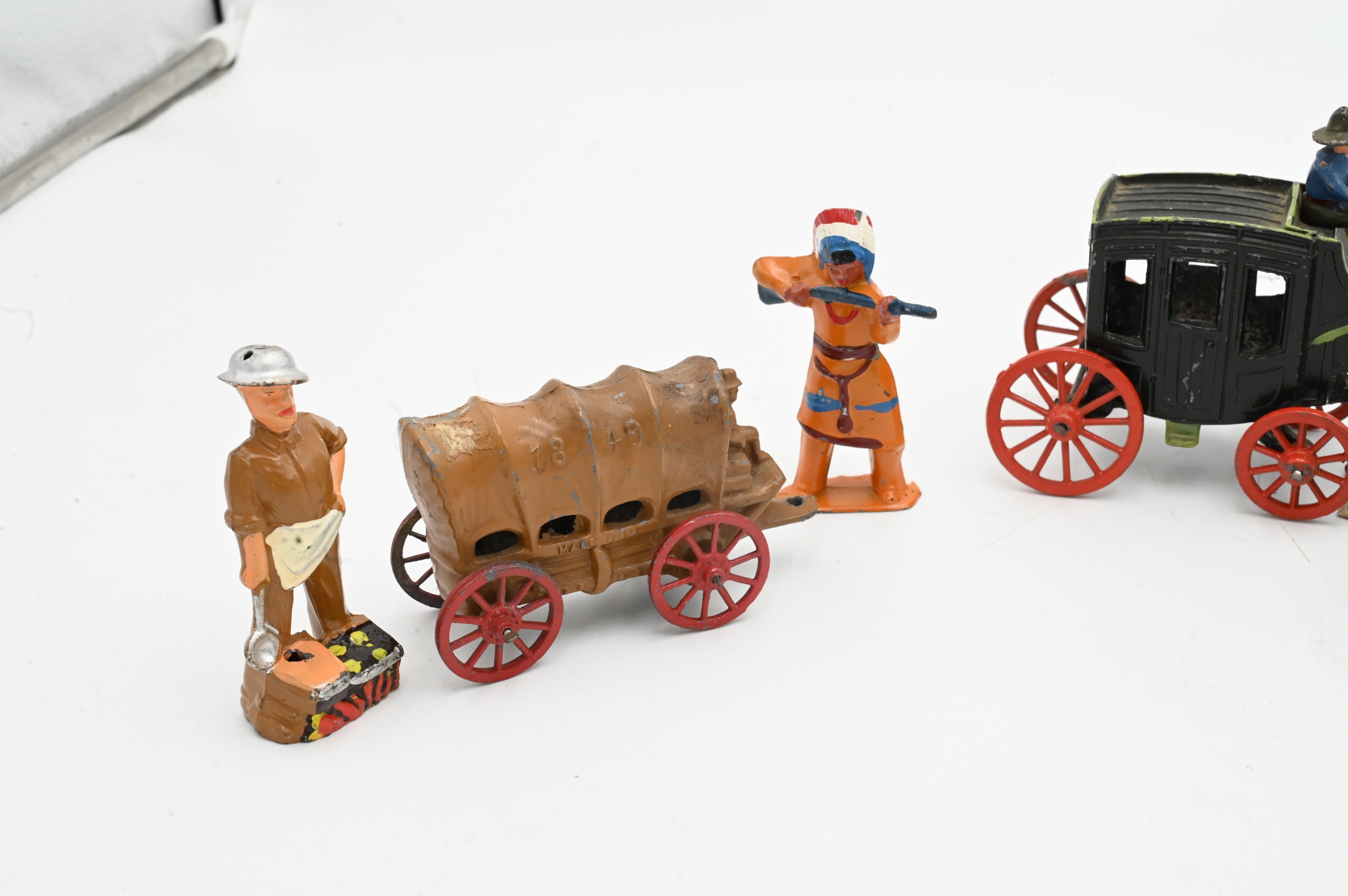 Four Box Lots of Plastic and Lead Toy Figurines, hand painted, to include cowboys and indians, WWI and WWII soldiers.