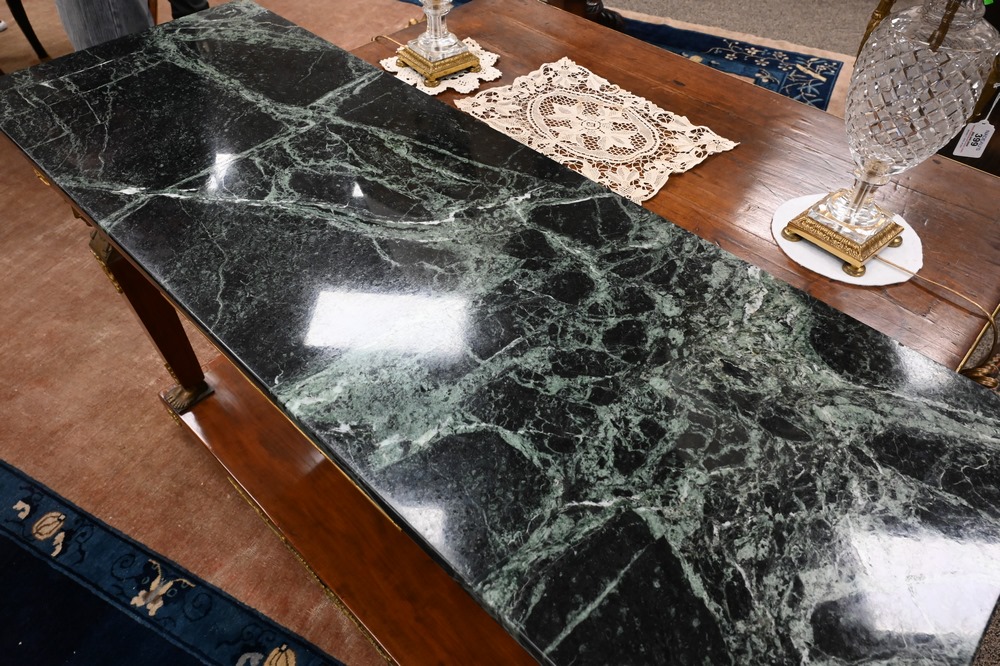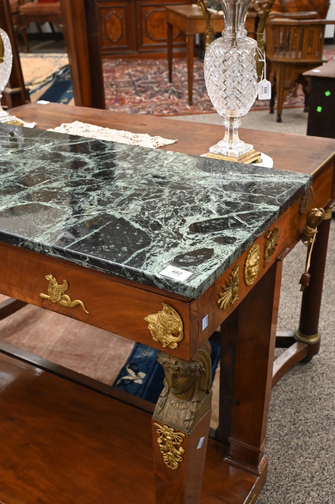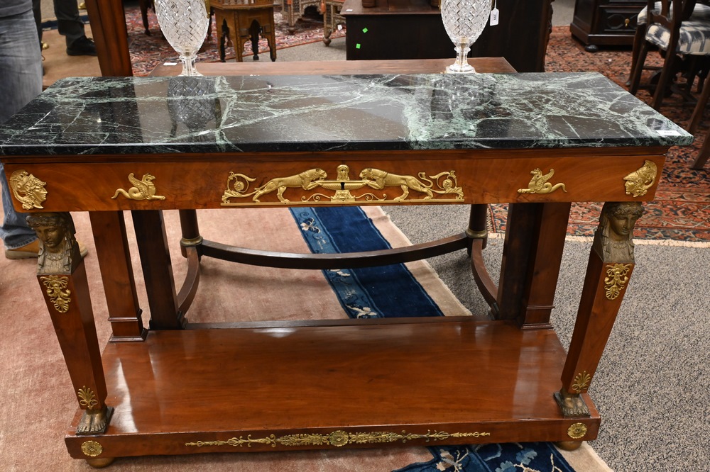 Lot 482: French Empire Mahogany Pier Table, having marble top over one drawer with gilt bronze pair of lions drinking, gold painted female he…