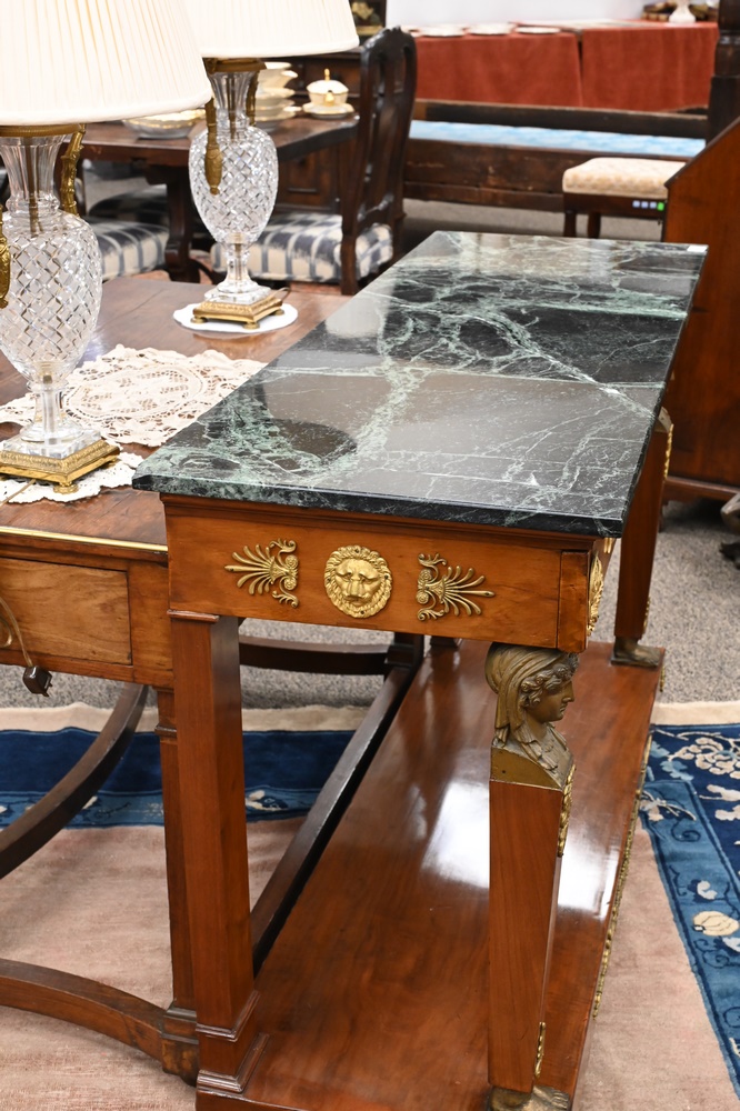 French Empire Mahogany Pier Table, having marble top over one drawer with gilt bronze pair of lions drinking, gold painted female heads, double feet, all set on suppressed ball feet, 19th century, height 33 1/2 inches, top 18″ x 51 1/2″. (marble is a replacement). Provenance: Sotheby’s New York, sale 522, lot 109, 10/13/84.