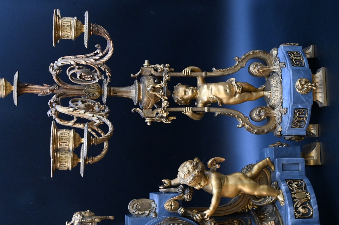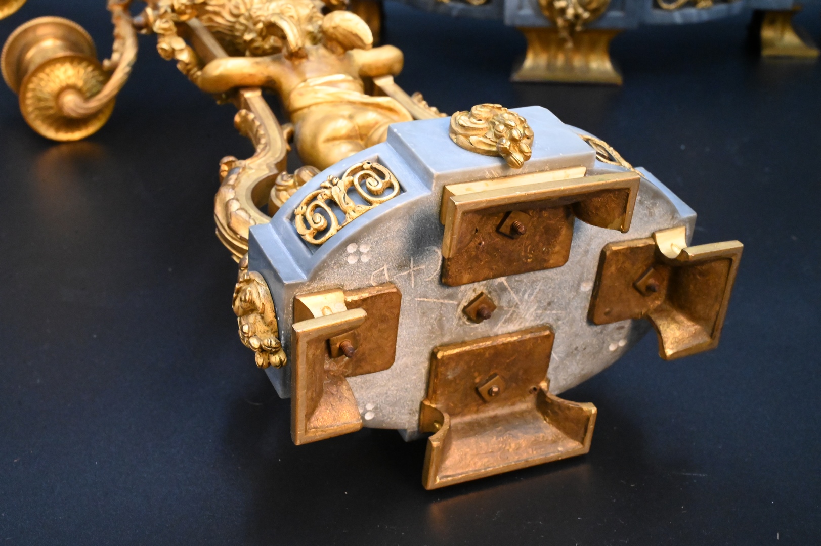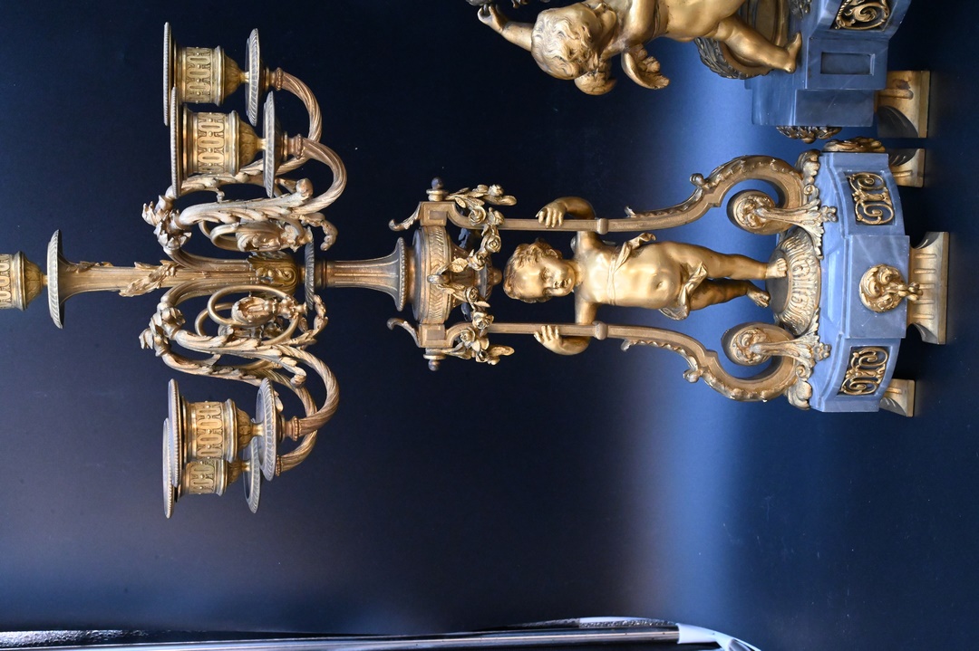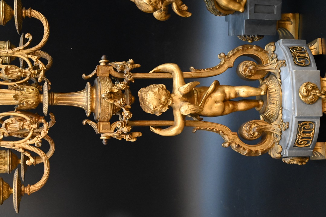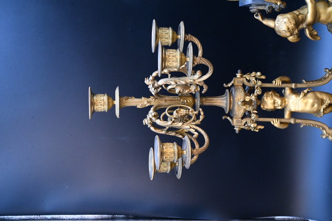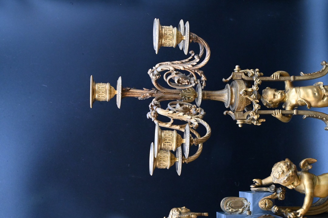 alongside a pair of five-light bronze candelabra on figural supports, on grey marble bases
