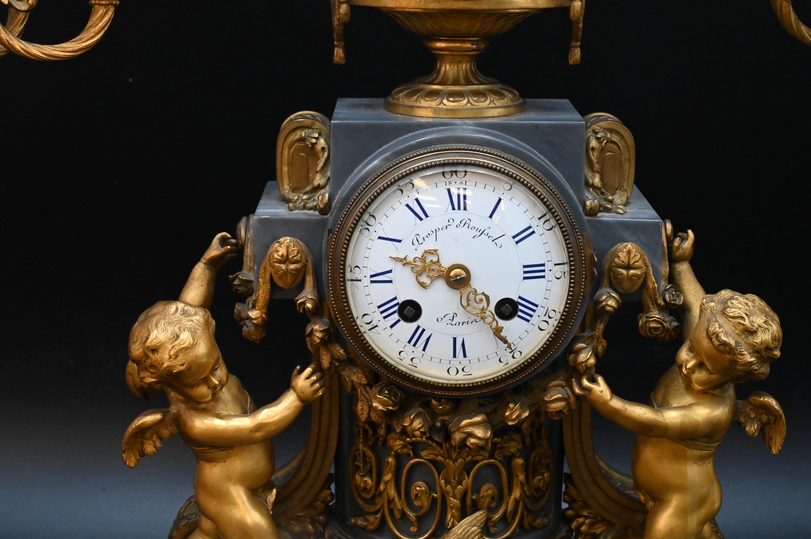 having bronze urn mounted over enameled dial marked Prosper Roufsel, Paris
