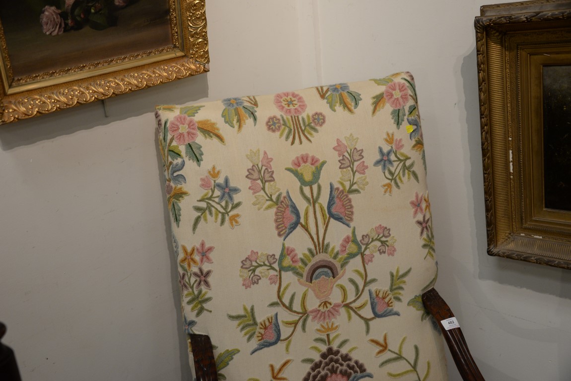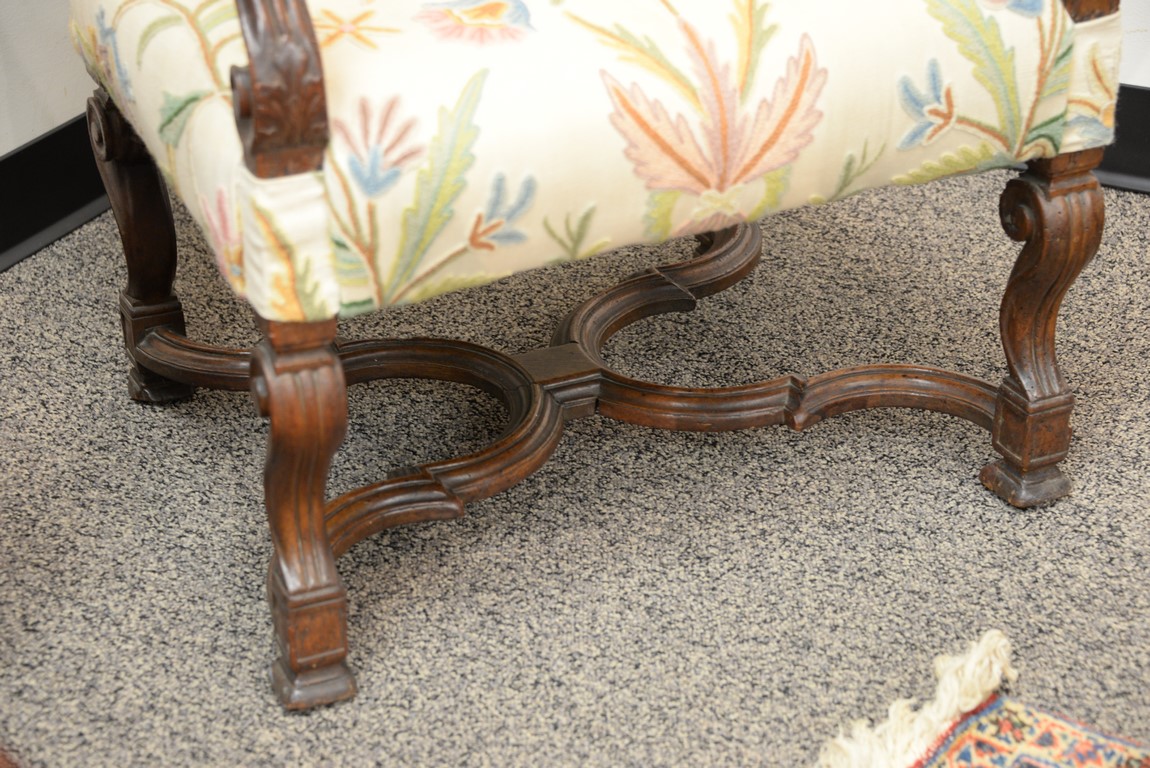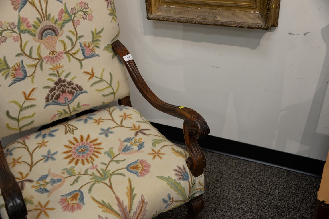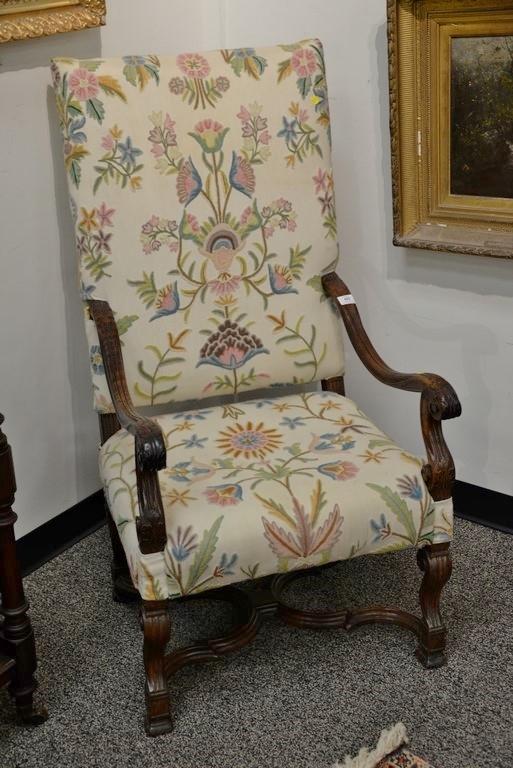 Lot 482: French Regence walnut armchair with carved arms and flat X stretcher base, now upholstered in crewelwork upholstery, circa 1700-1730.