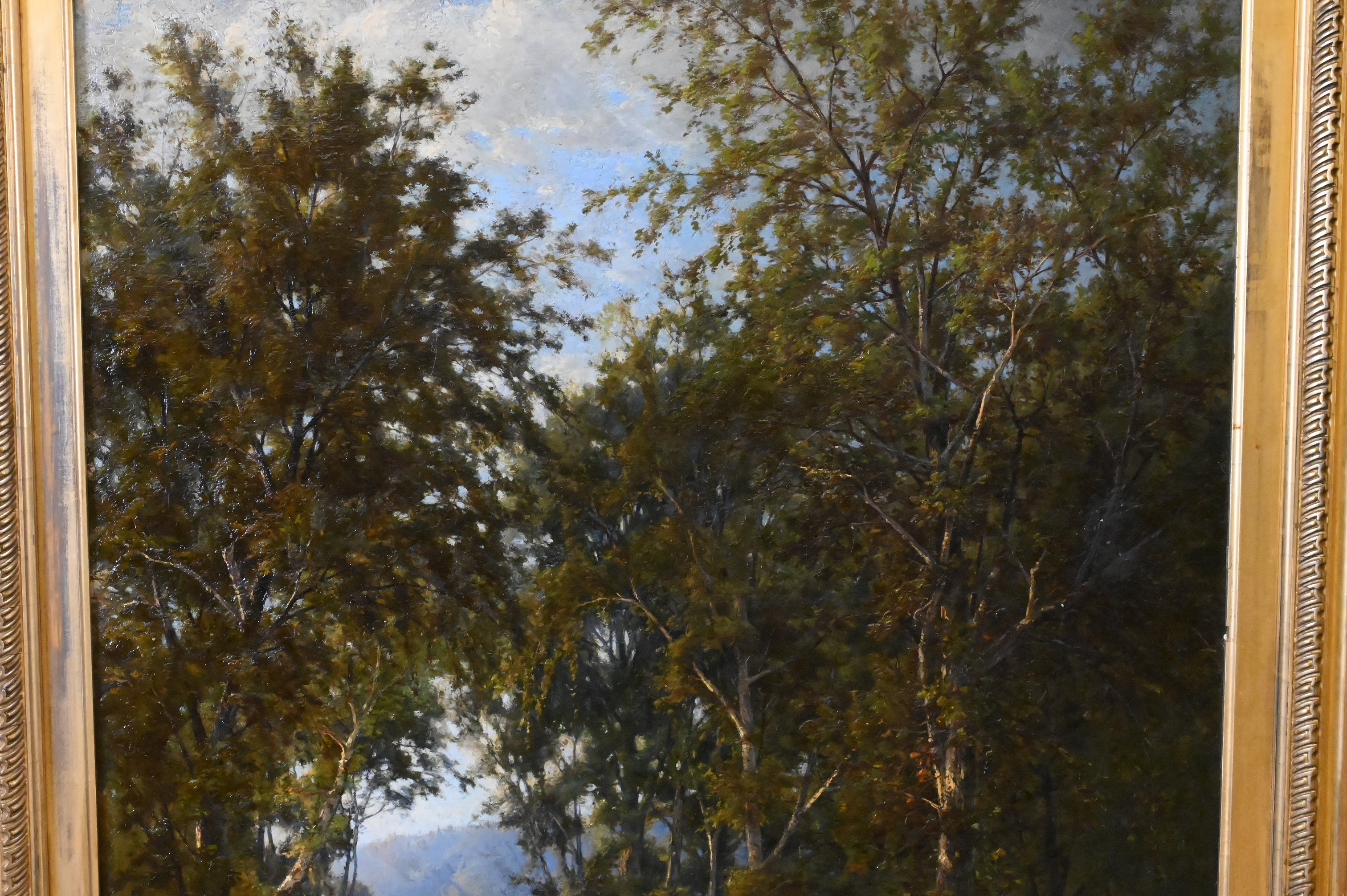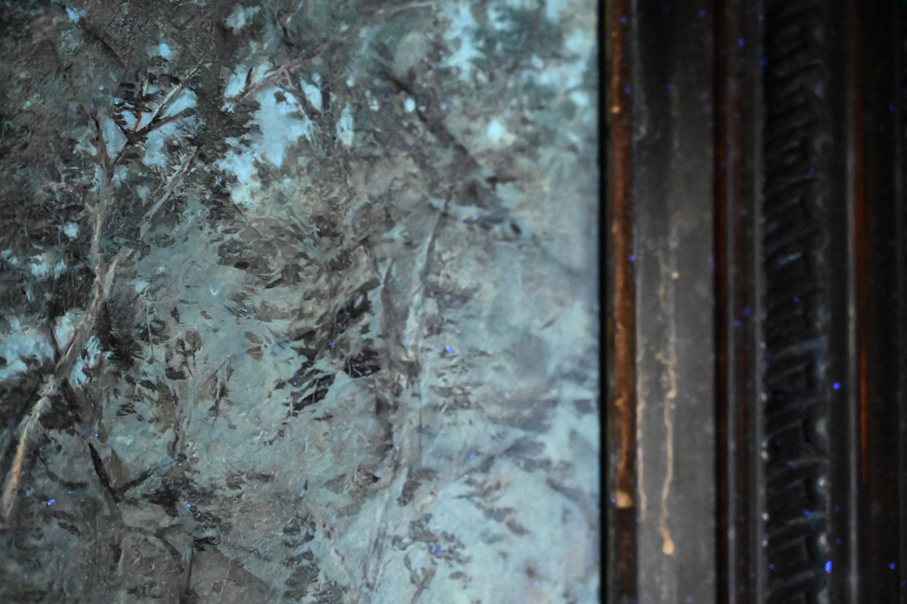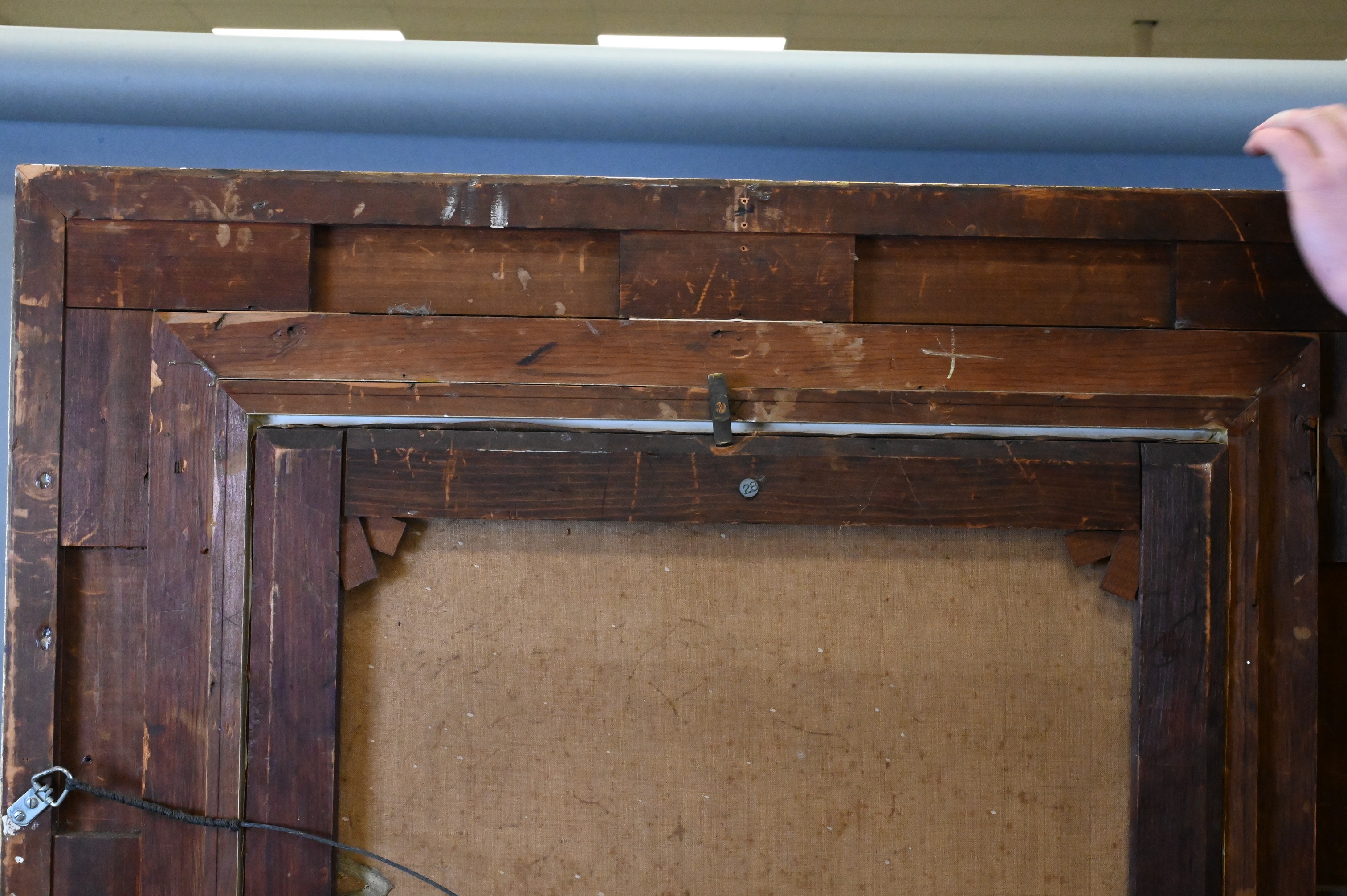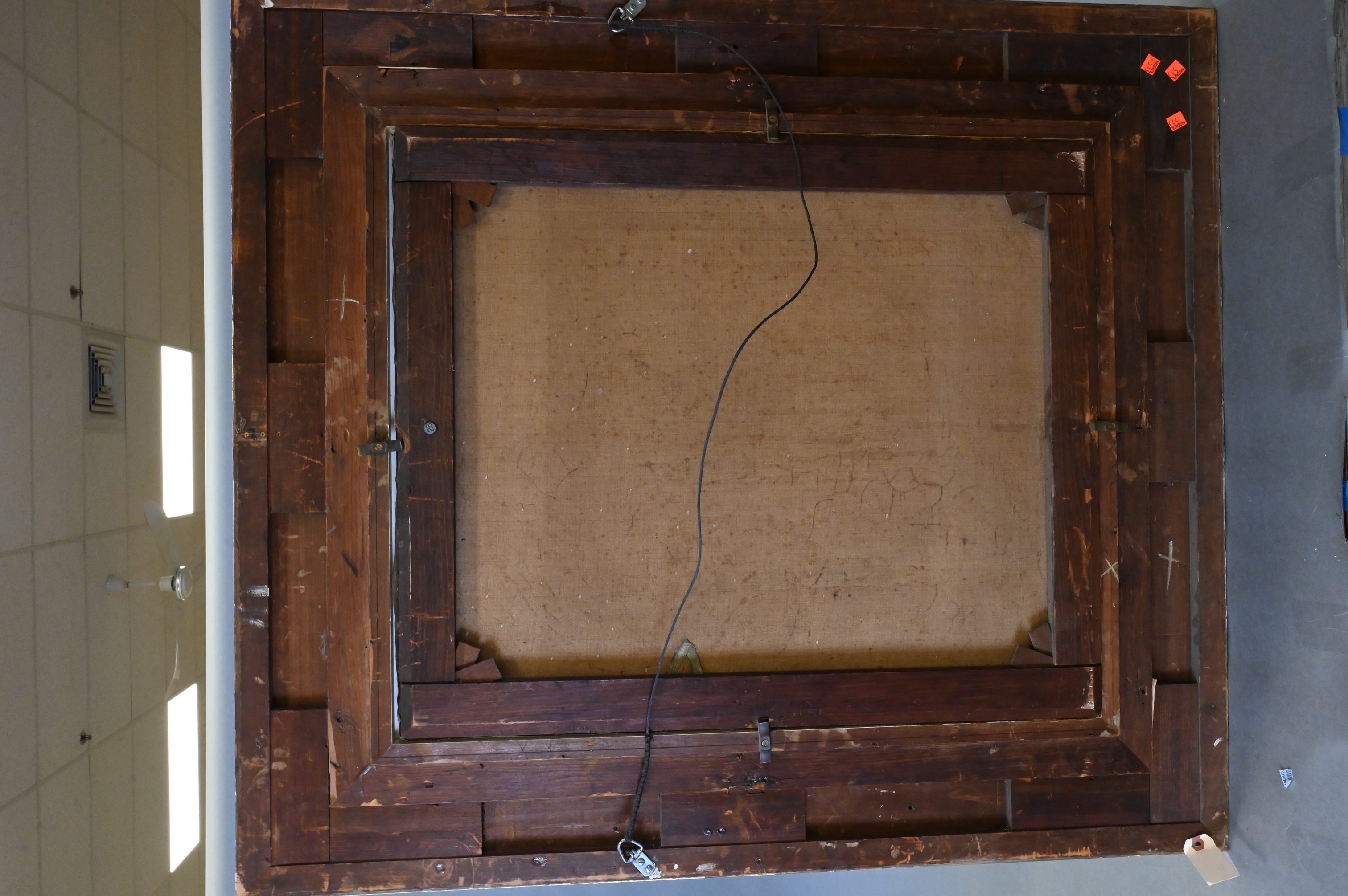 Condition: original stretched canvas, craquelure throughout, edge ware, patch mark repair to verso, heavy varnish, inpainting concentrating around repair (center right), surface grime, remnants of old label