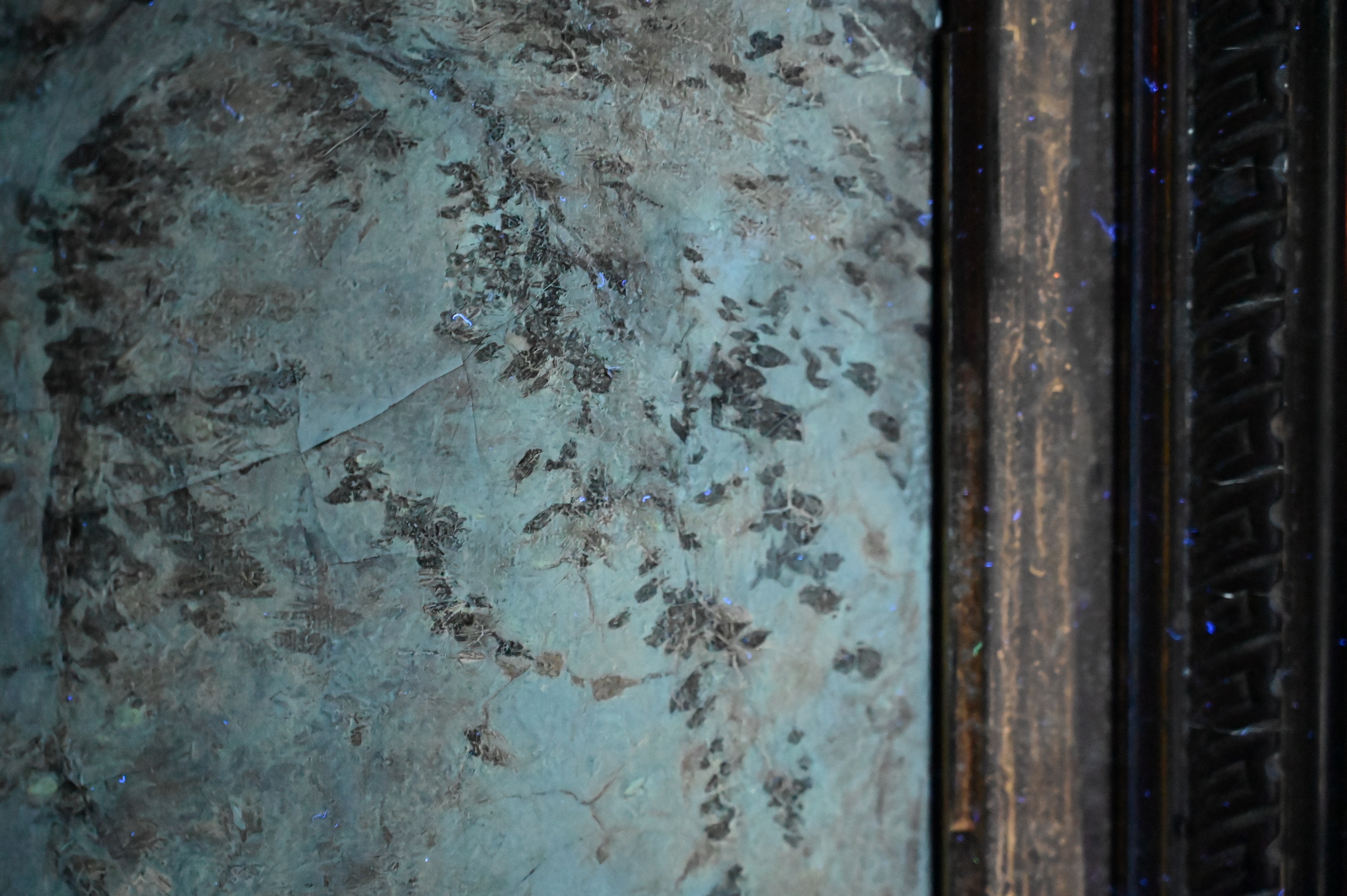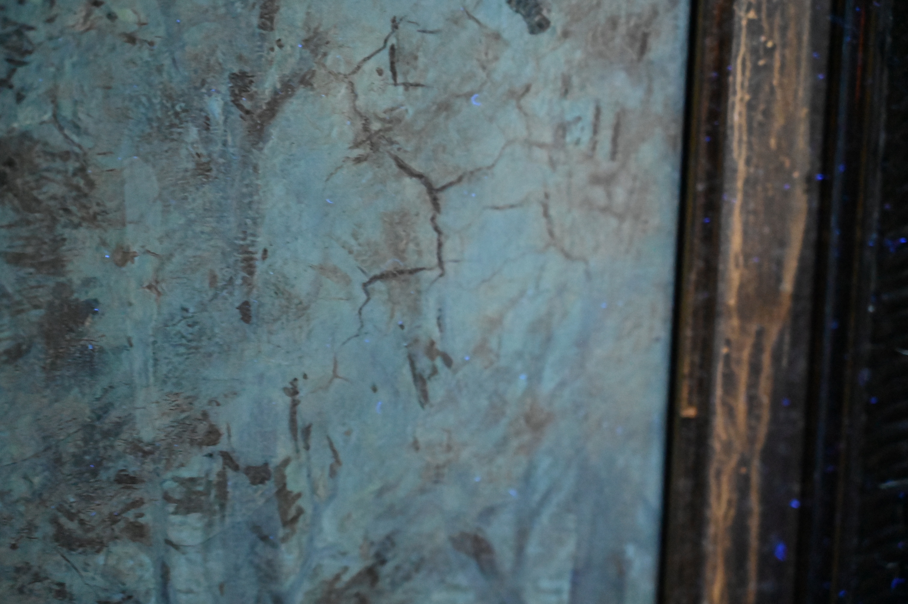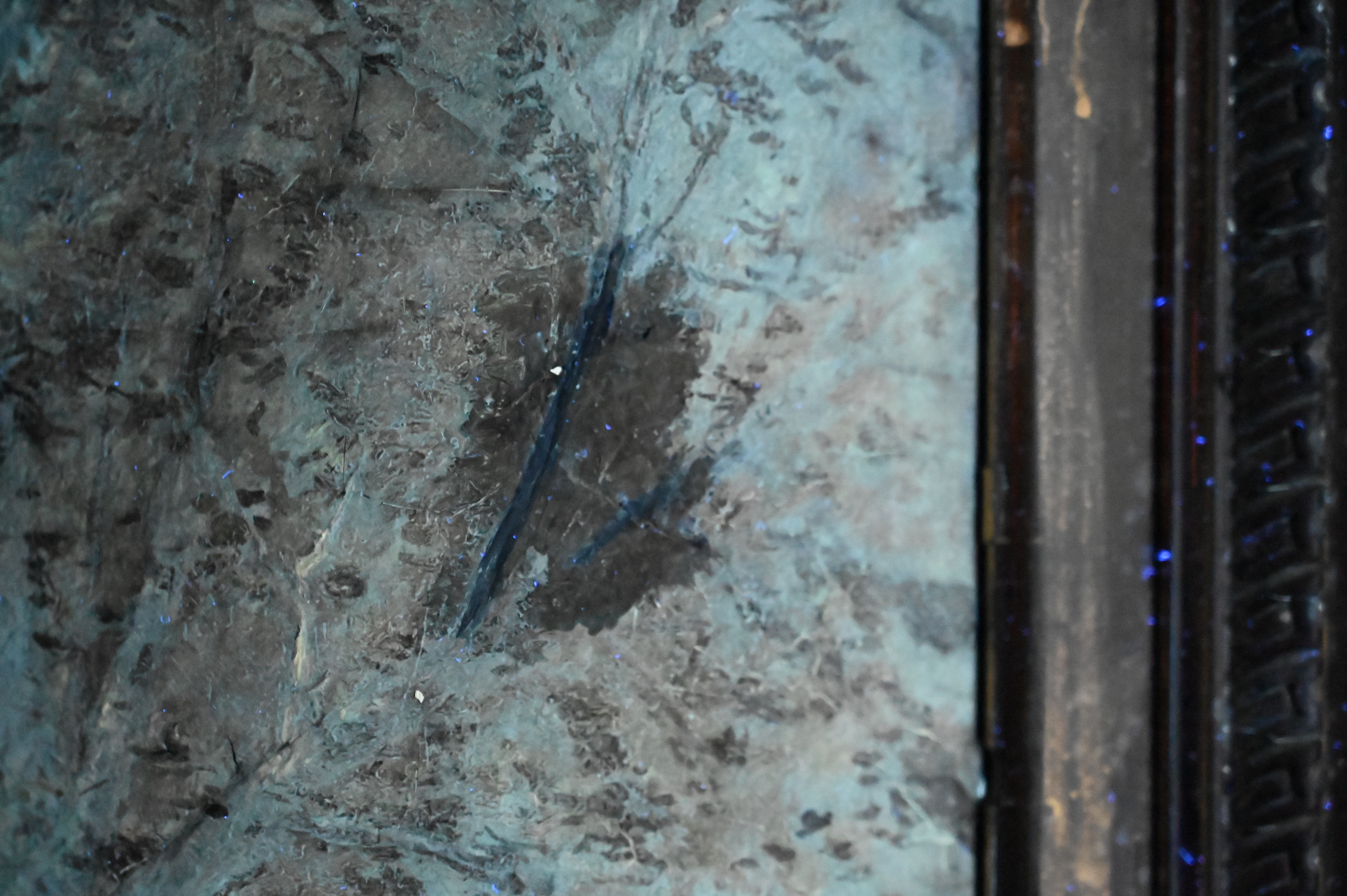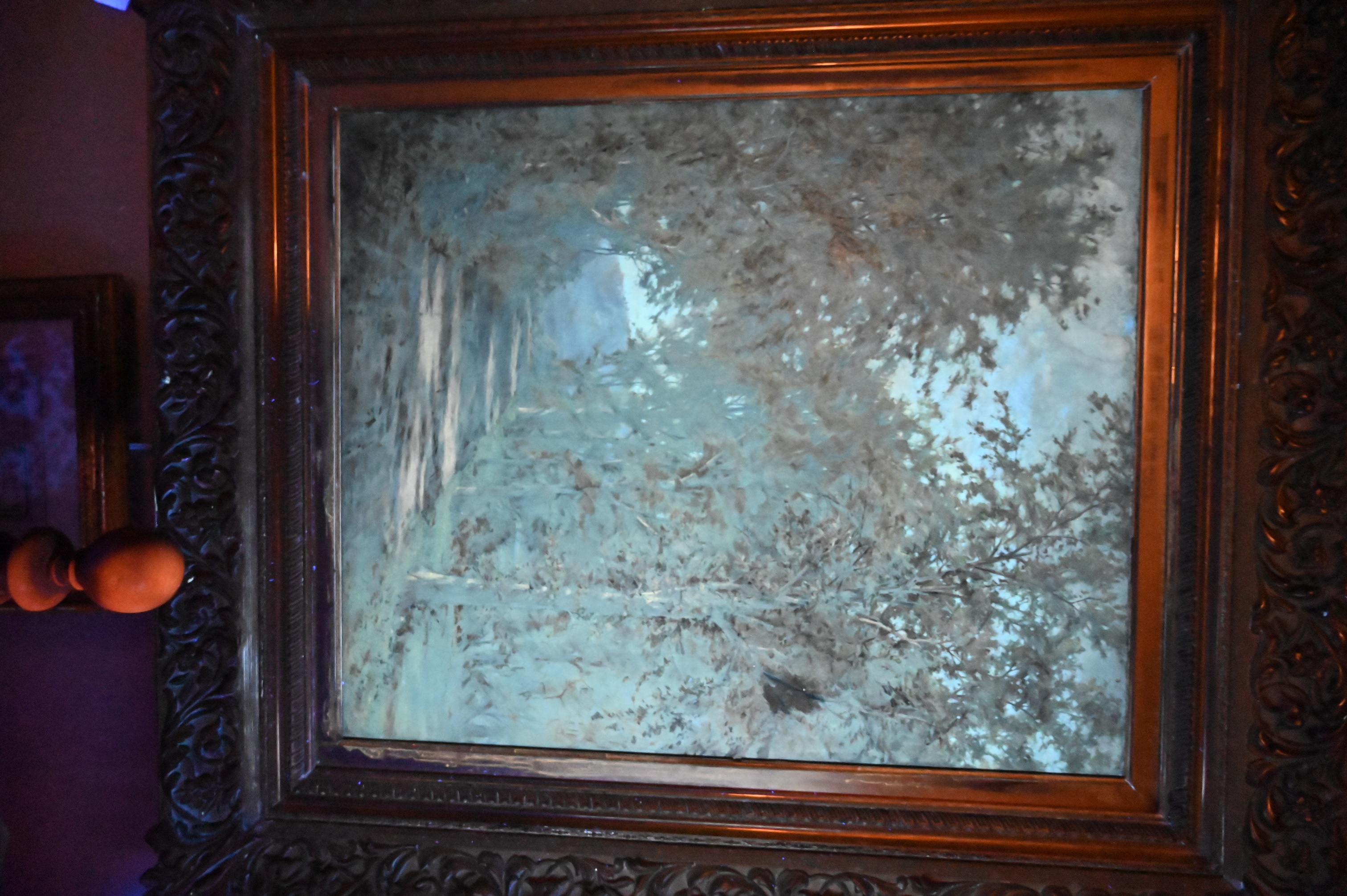 Condition: original stretched canvas, craquelure throughout, edge ware, patch mark repair to verso, heavy varnish, inpainting concentrating around repair (center right), surface grime, remnants of old label