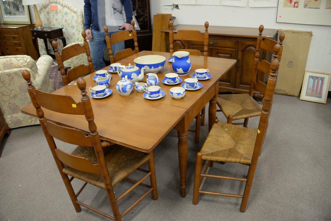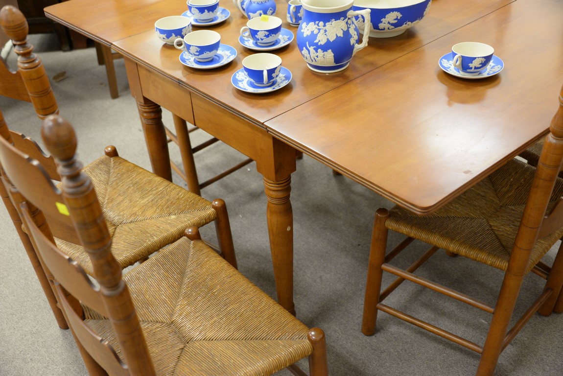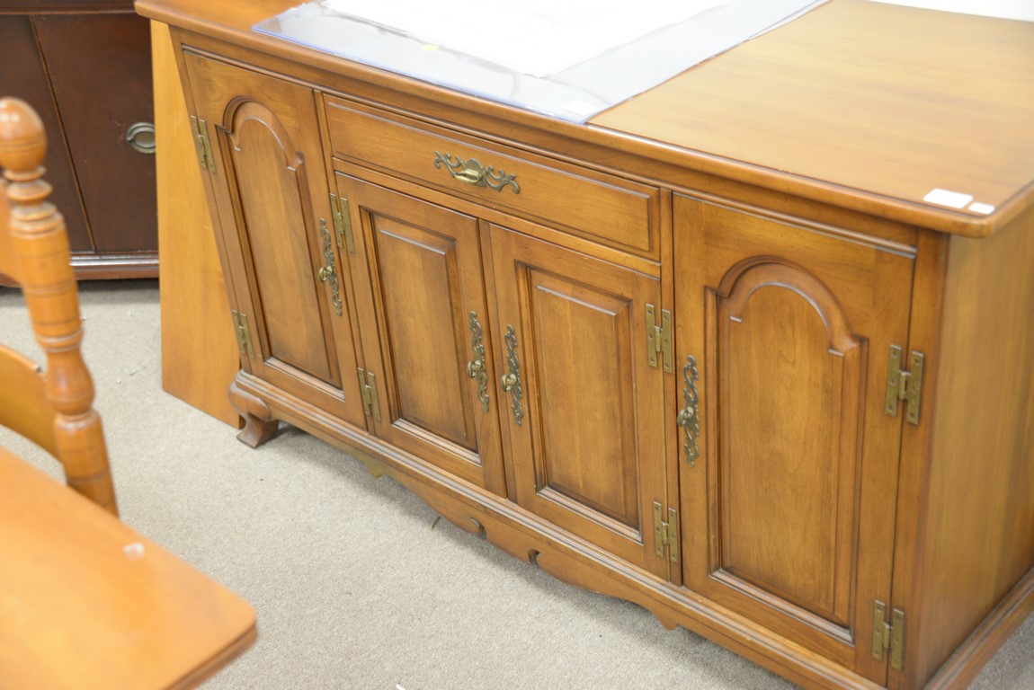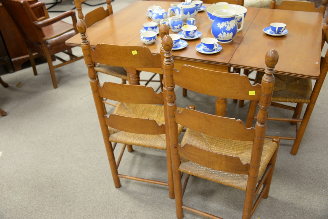 Lot 482: Maple eight piece dining set with six ladderback chairs, drop leaf table with two extra leaves and pads, and a cherry sideboard. sid…