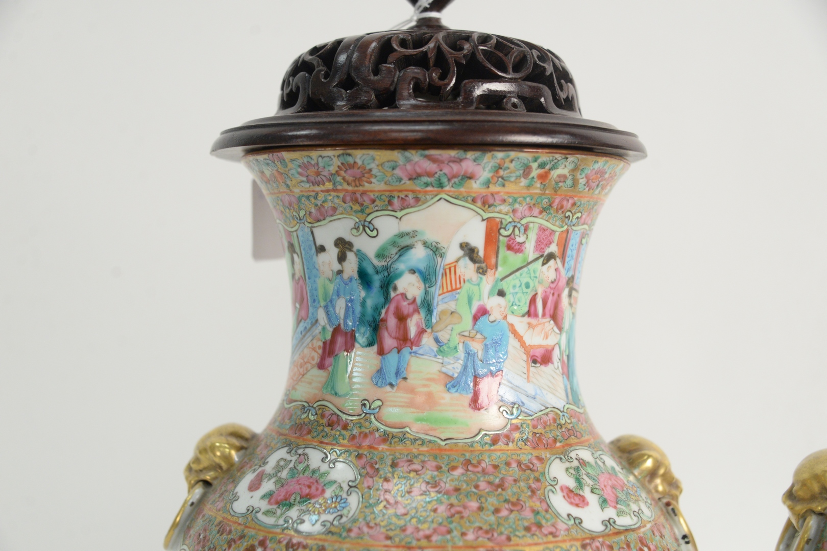 Lot 482: Pair of Rose Medallion Vases having painted panels with gilt foo dog handles and wood carved covers, height 17 inches.