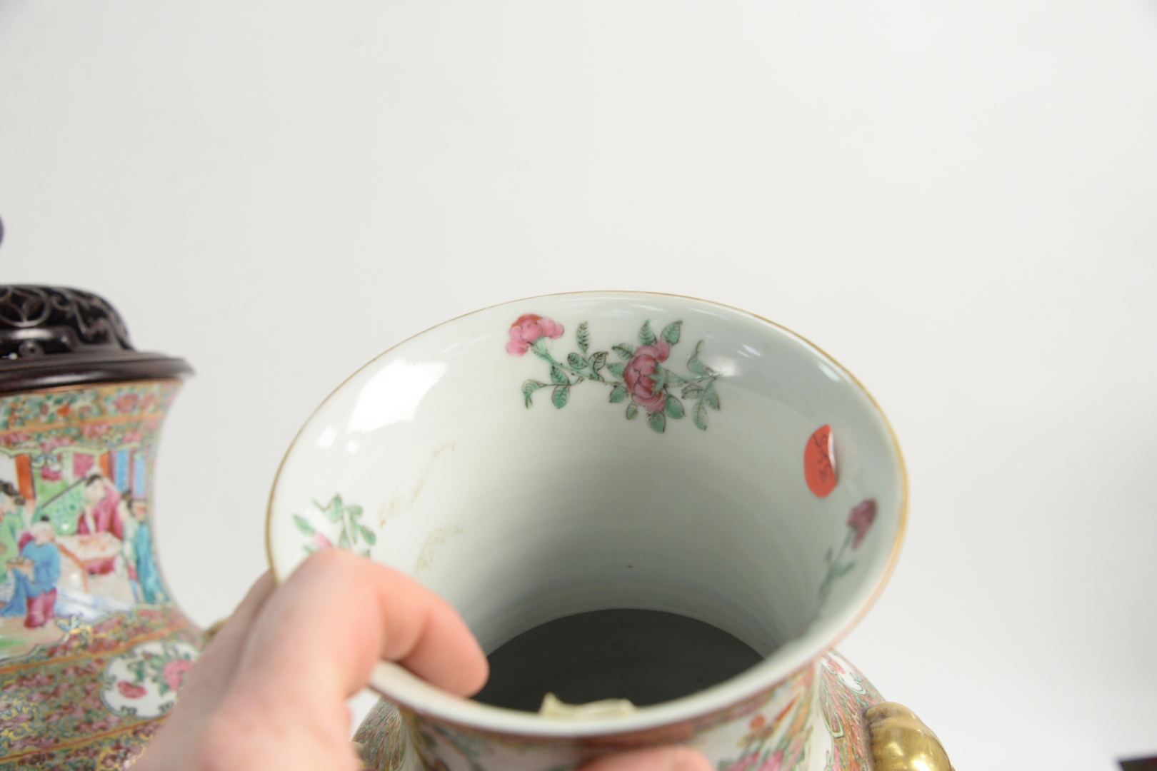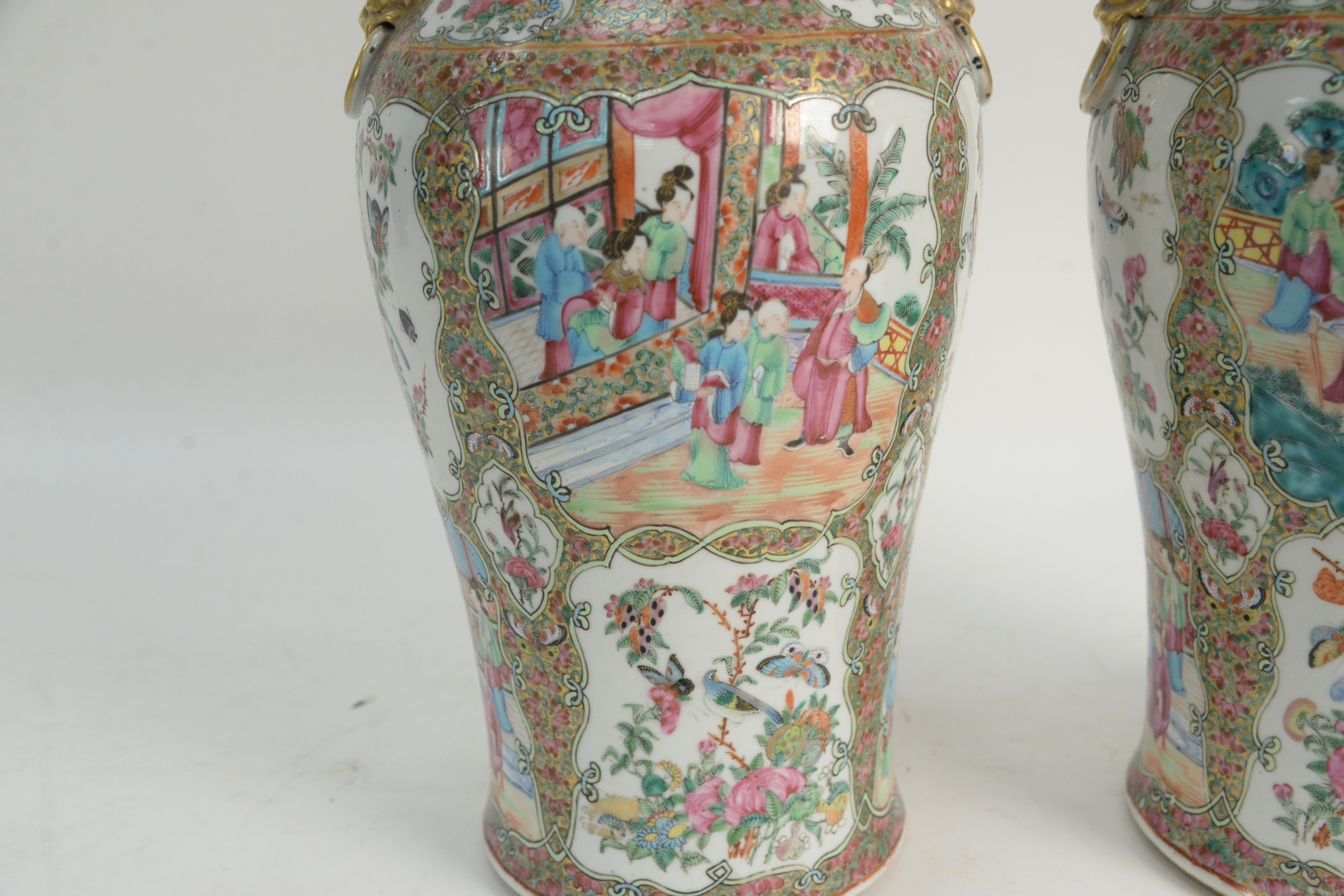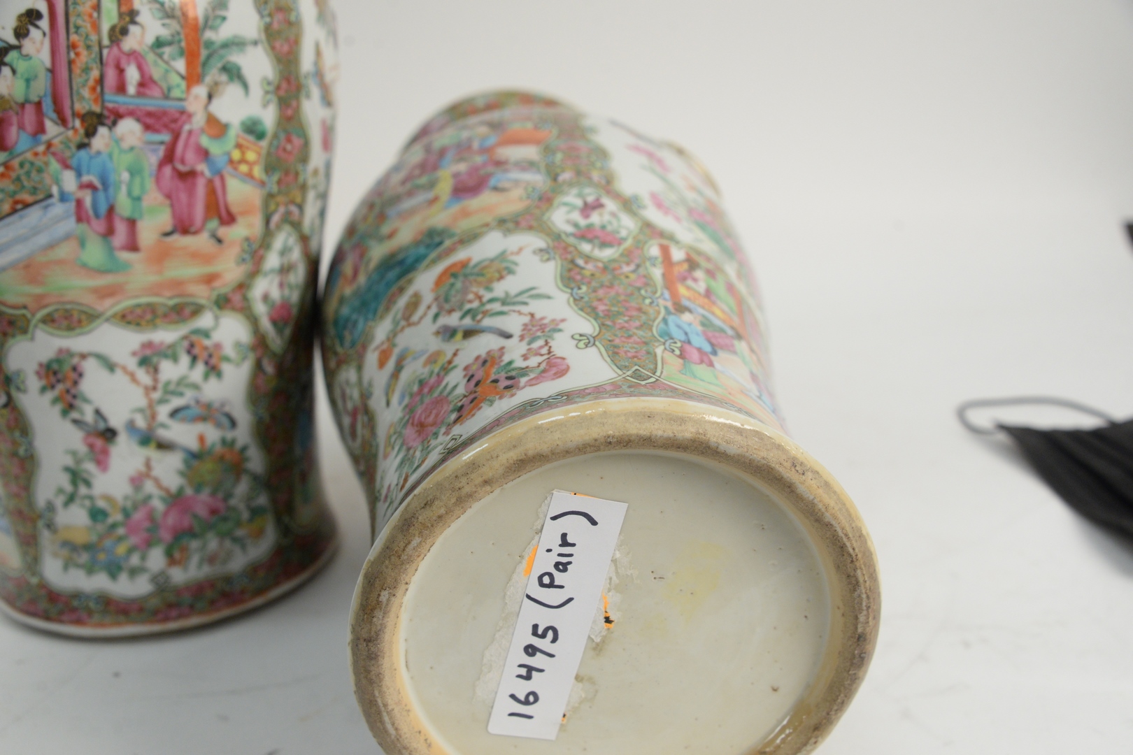 Pair of Rose Medallion Vases having painted panels with gilt foo dog handles and wood carved covers, height 17 inches.