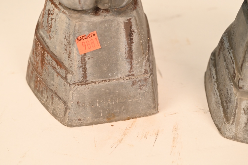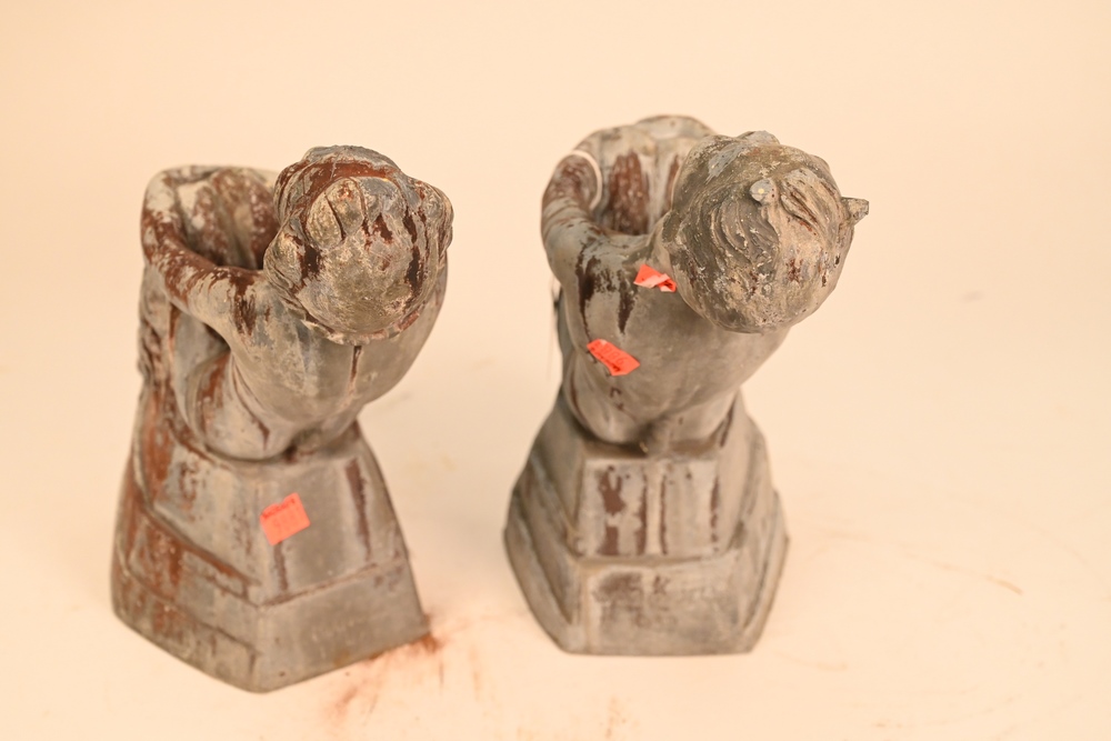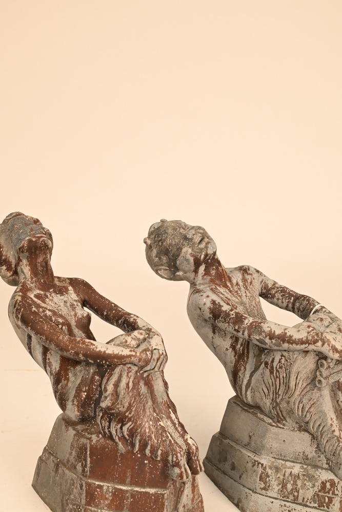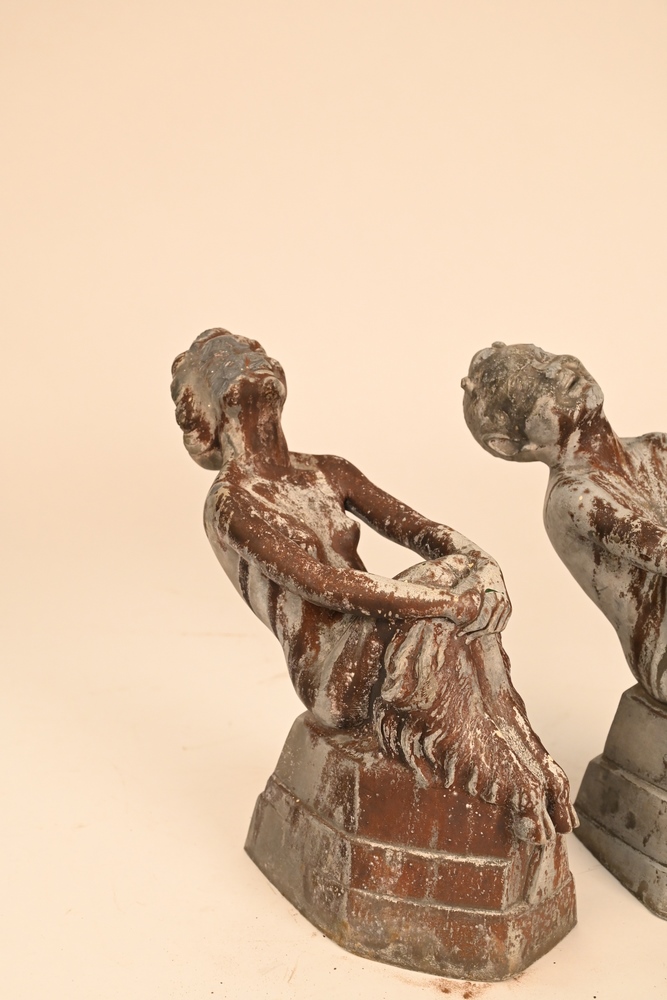 Lot 482: Pair of W. Manuelli Lead Garden Figures art deco style of a male and female satyr sitting laughing on a tiered base height 11 1/2 inches