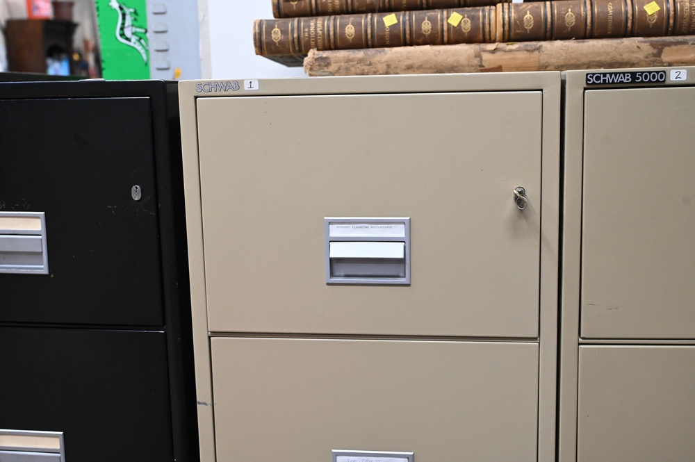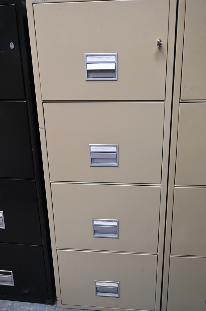 Schwab Four Drawer Fireproof File Cabinet, height 53 1/2 inches, width 19 1/2 inches.