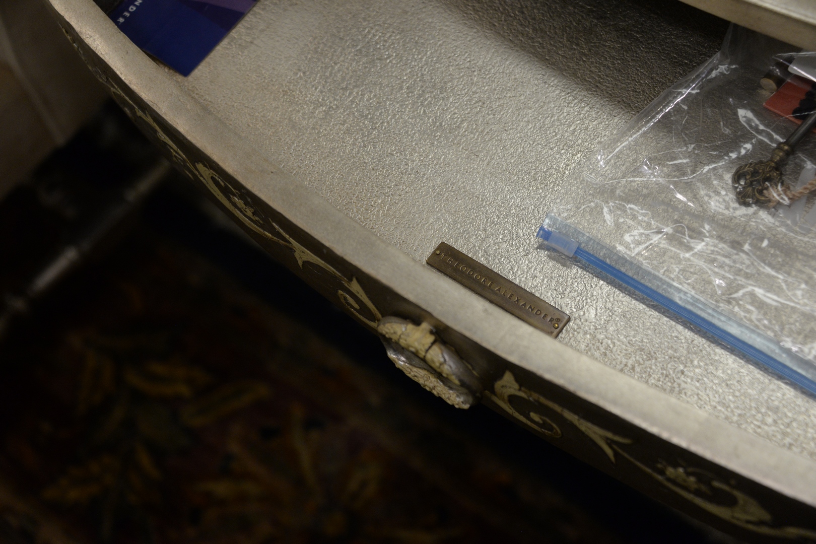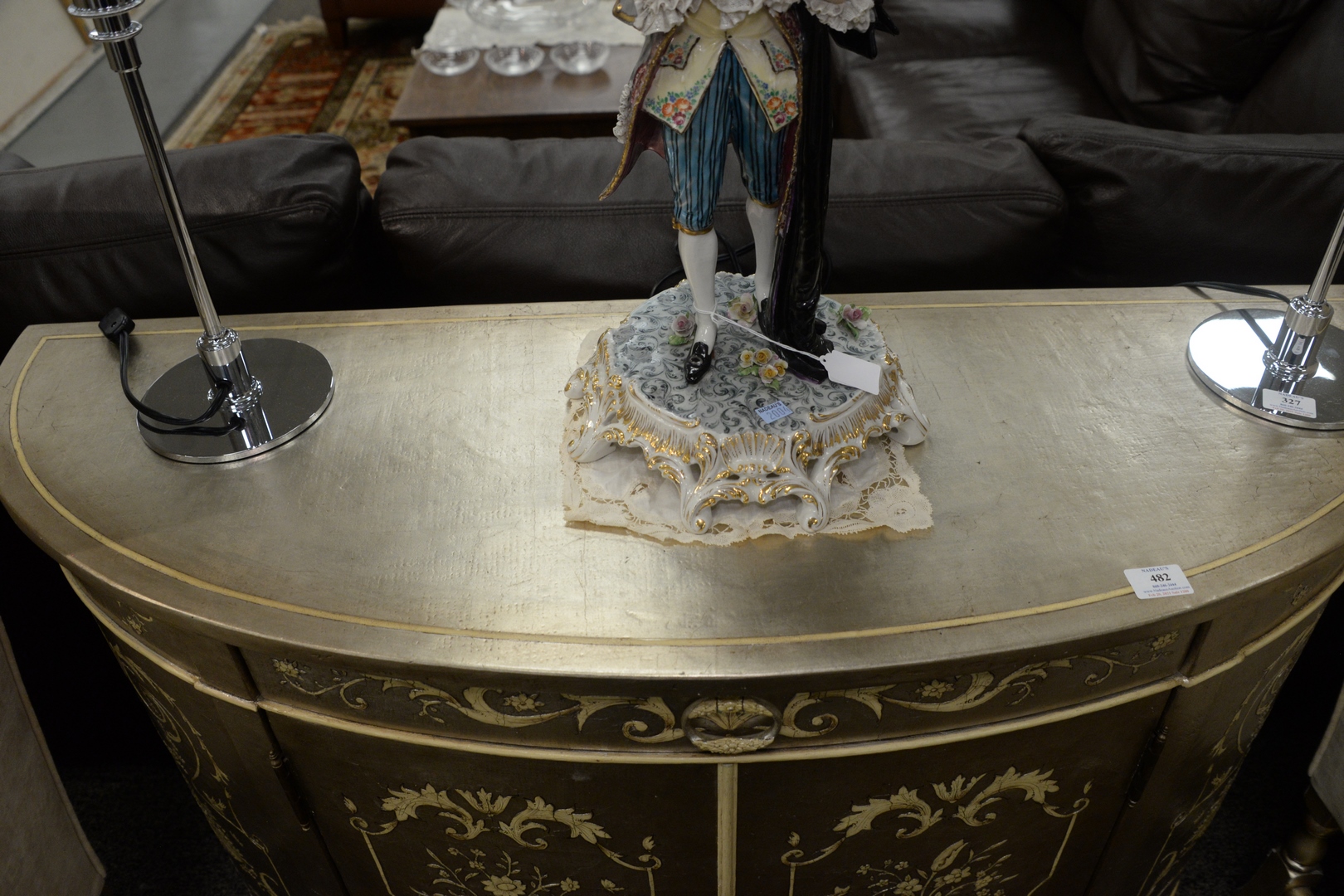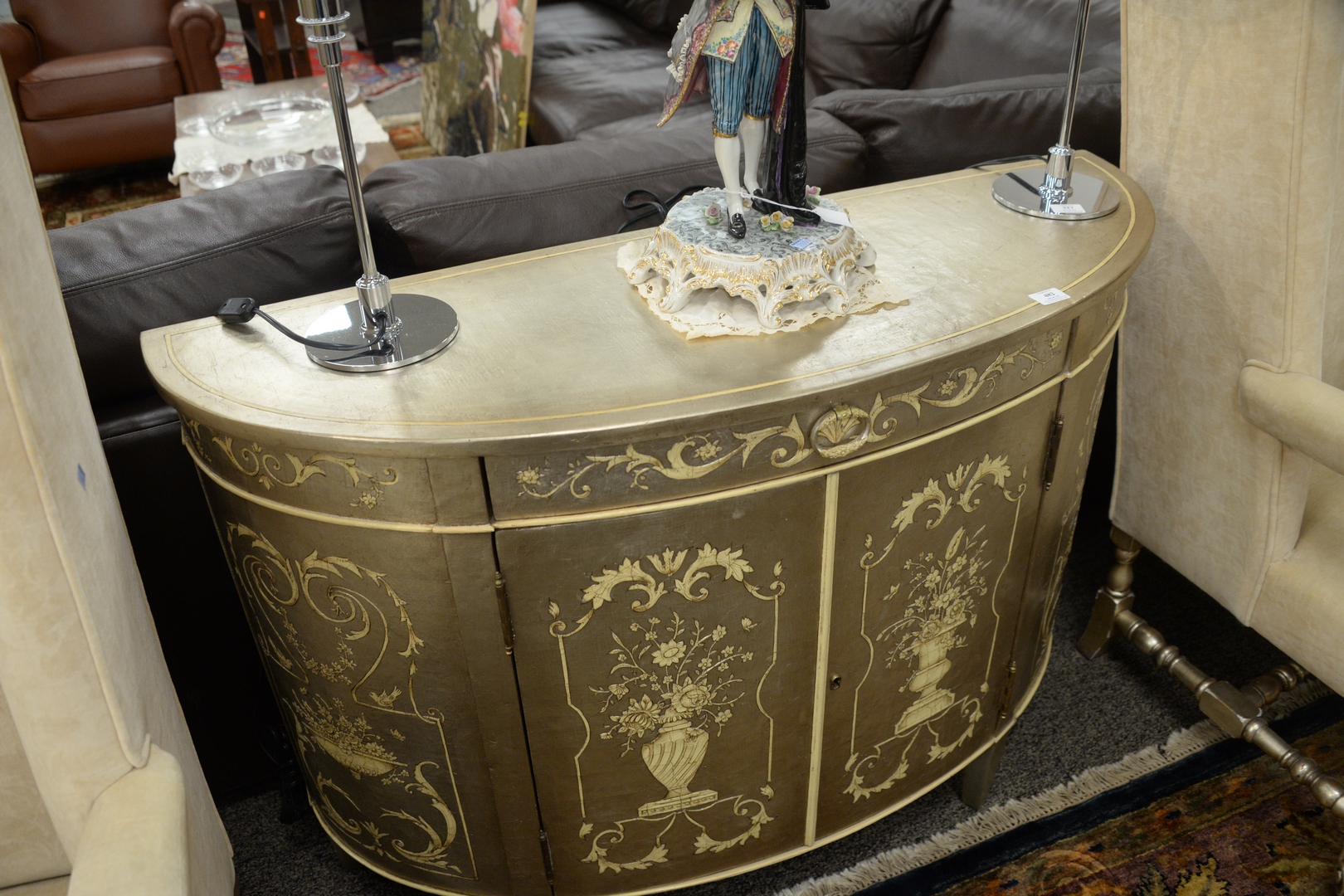 Lot 482: Theodore Alexander Silvered Bower Demilune Cabinet, having hand painted silver argento and floral vase, height 35 inches, width 48 inches, depth 16 inches.