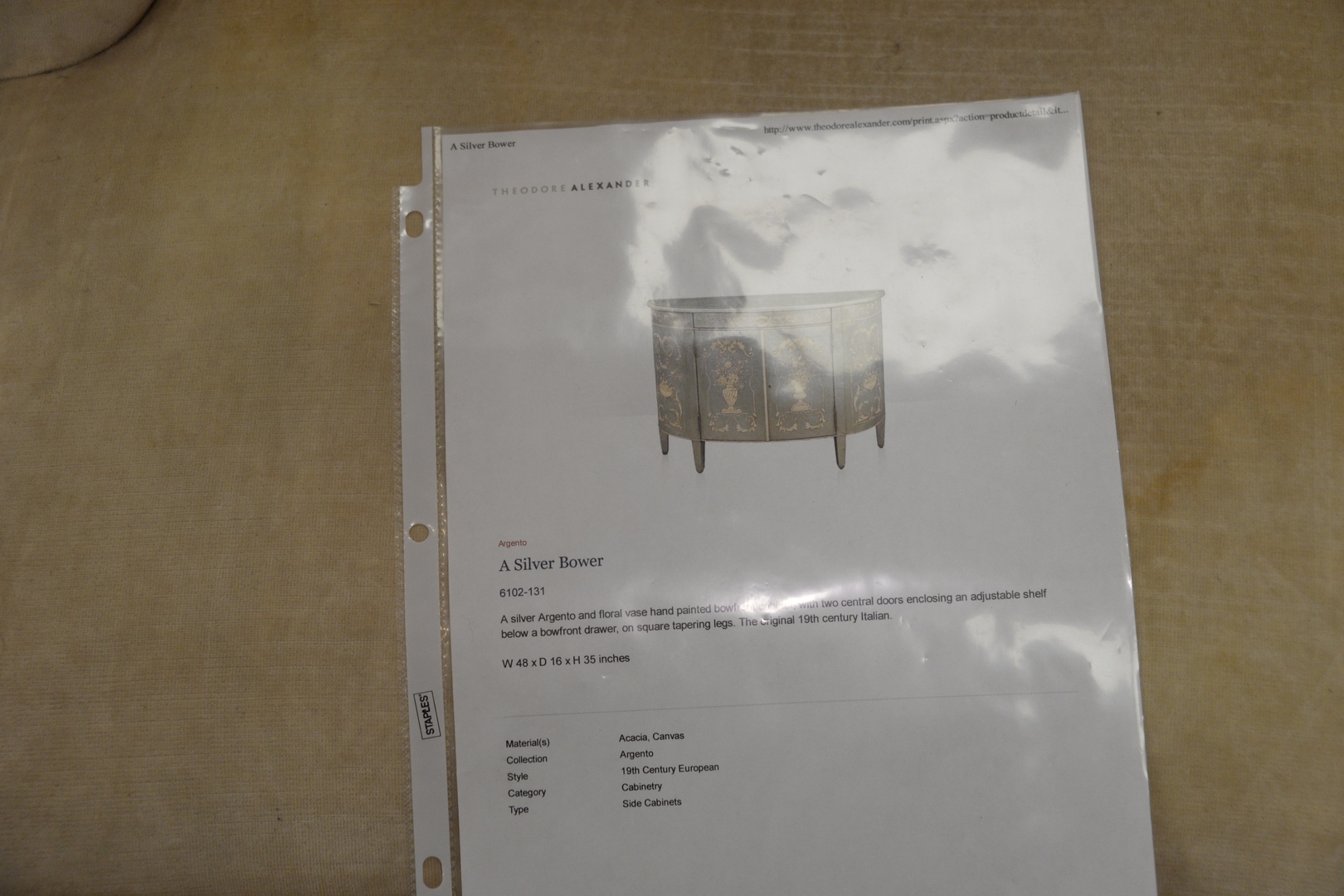 Theodore Alexander Silvered Bower Demilune Cabinet, having hand painted silver argento and floral vase, height 35 inches, width 48 inches, depth 16 inches.