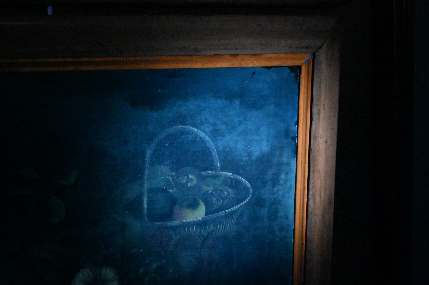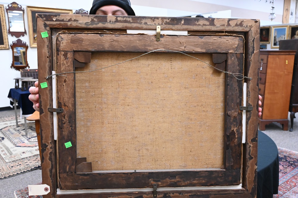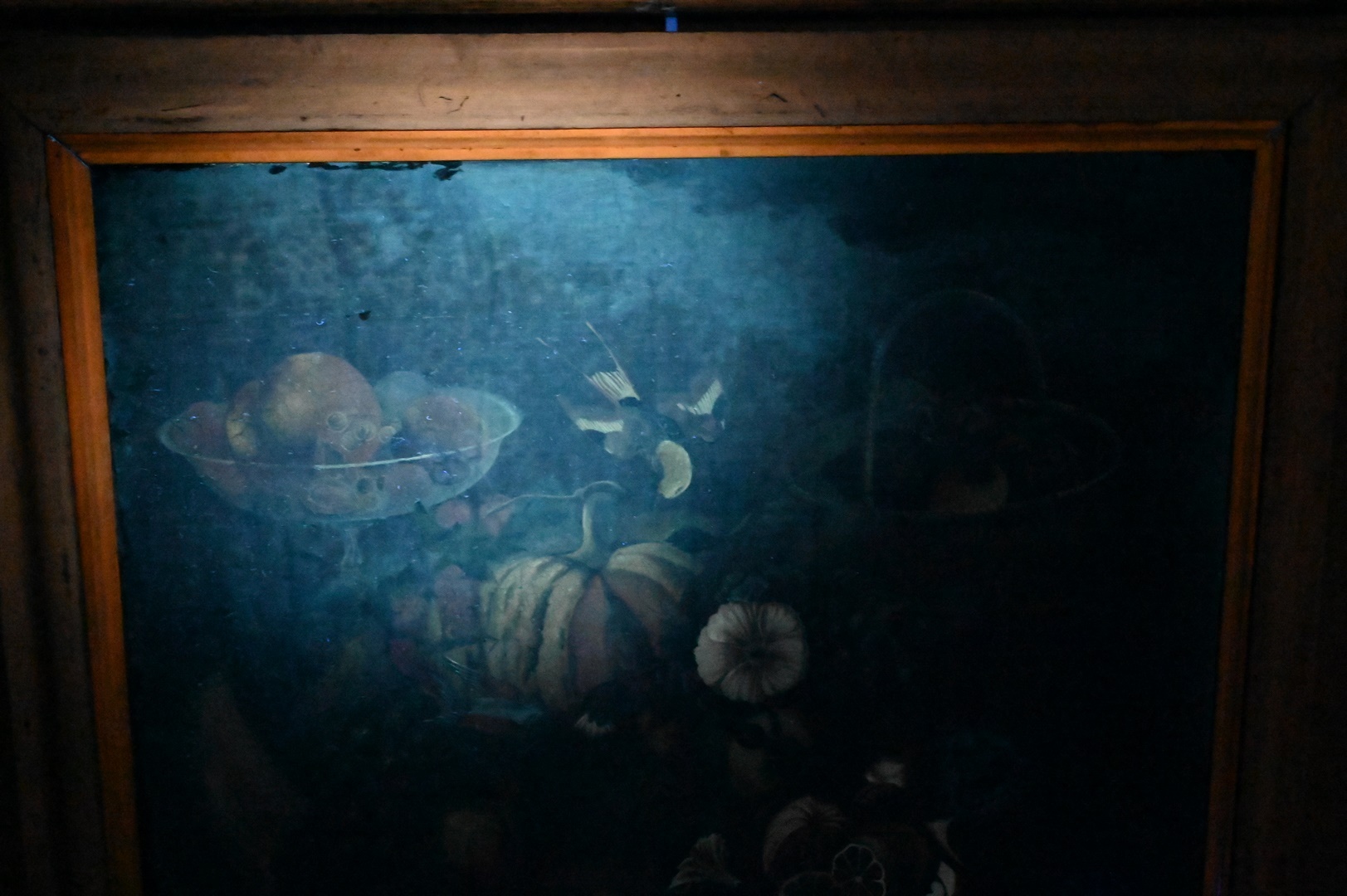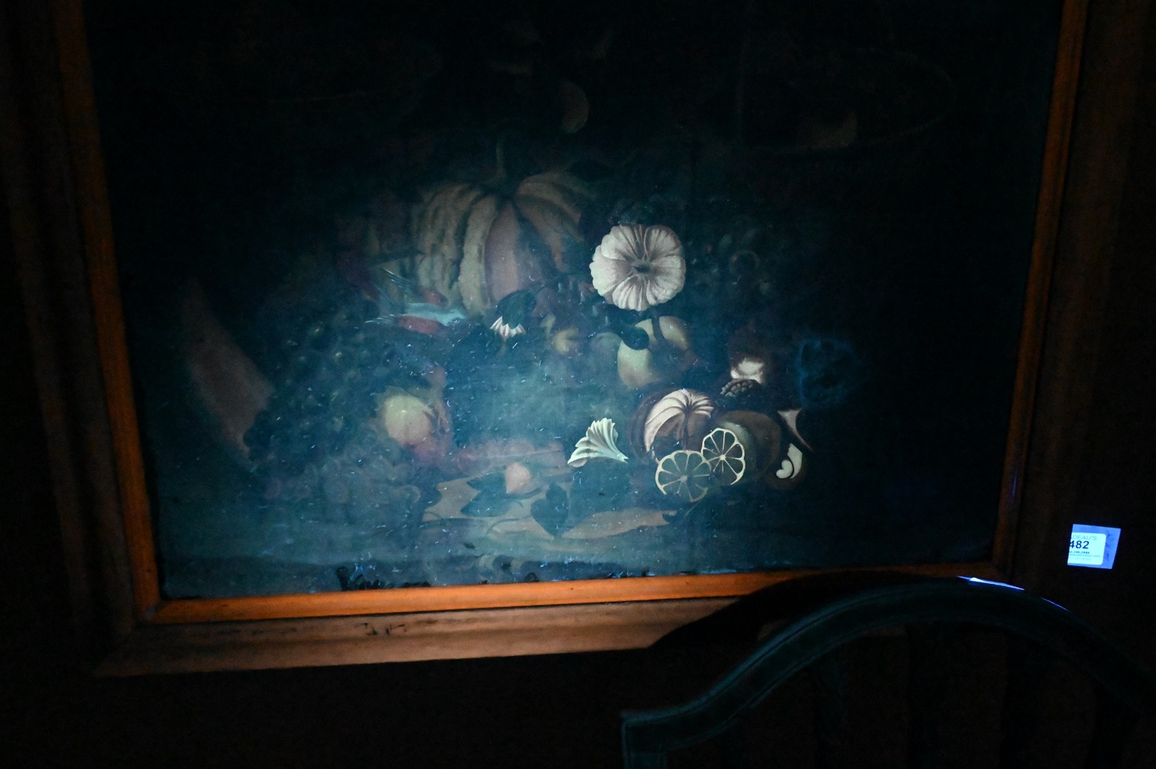 Unknown Artist, still life of fruit, flowers and animals, oil on canvas, unsigned, 20″ x 24″.