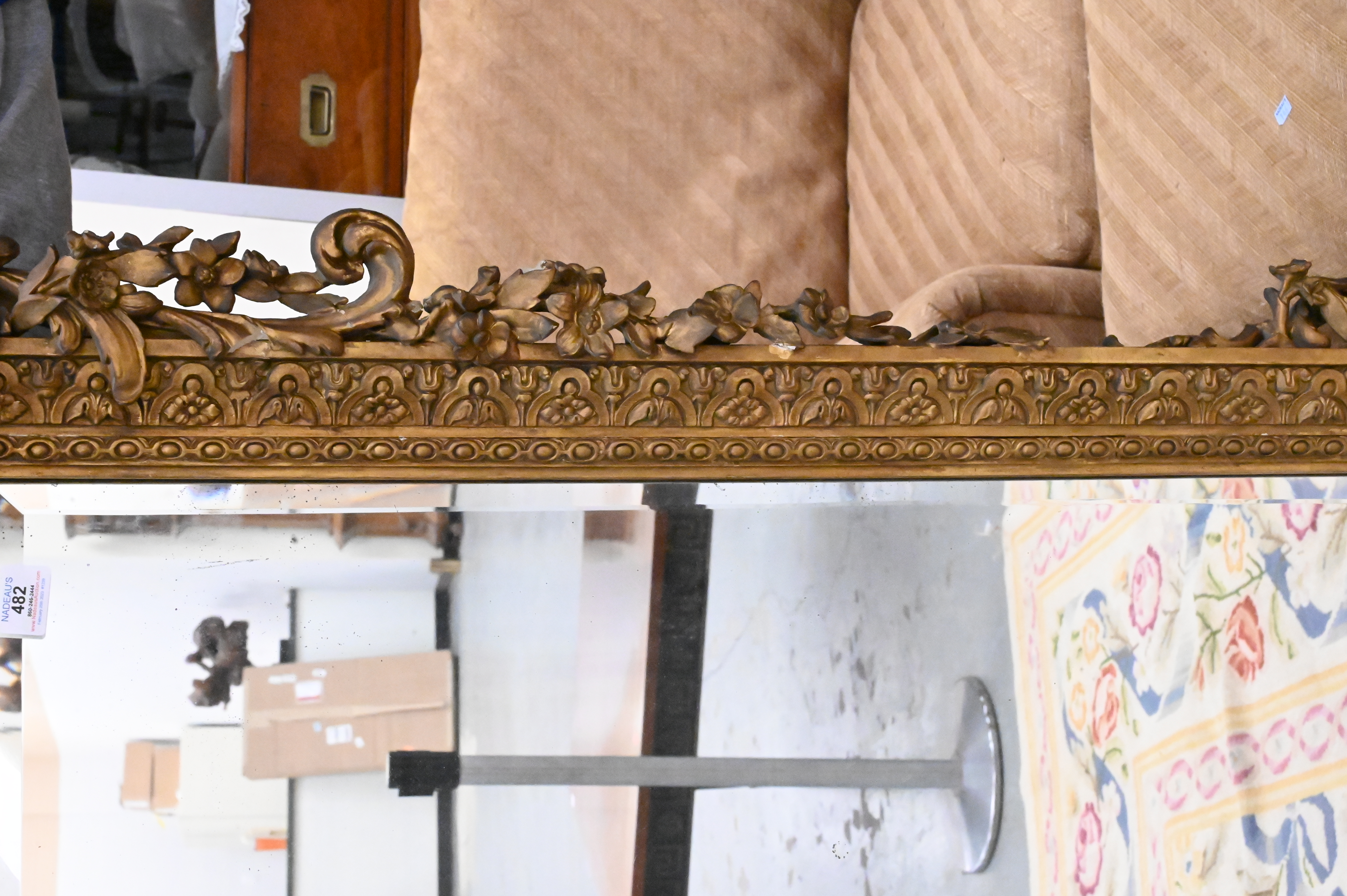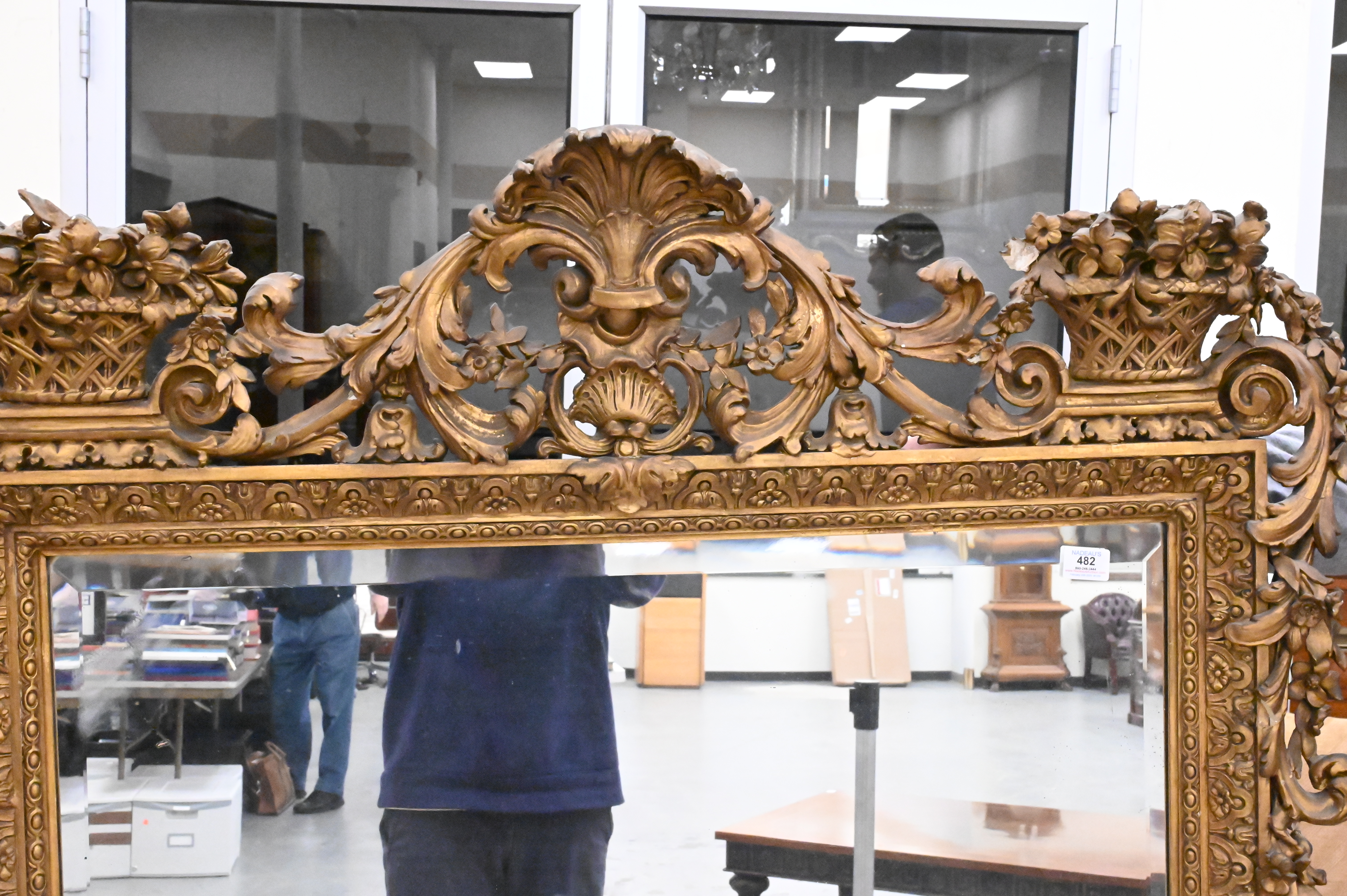 Victorian Overmantle Mirror, topped with twin baskets of flowers, small imperfections, height 67 inches, width 53 inches, Sotheby’s label on back